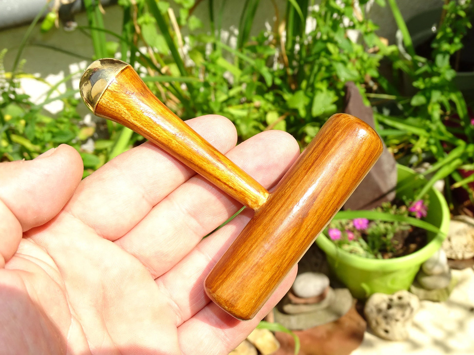 Coffret de massage ayurvédique – Set de 4 baguettes Kansa en bronze (cuivre + étain) avec manches en teck – 30 x 23 cm – 912 gr. !