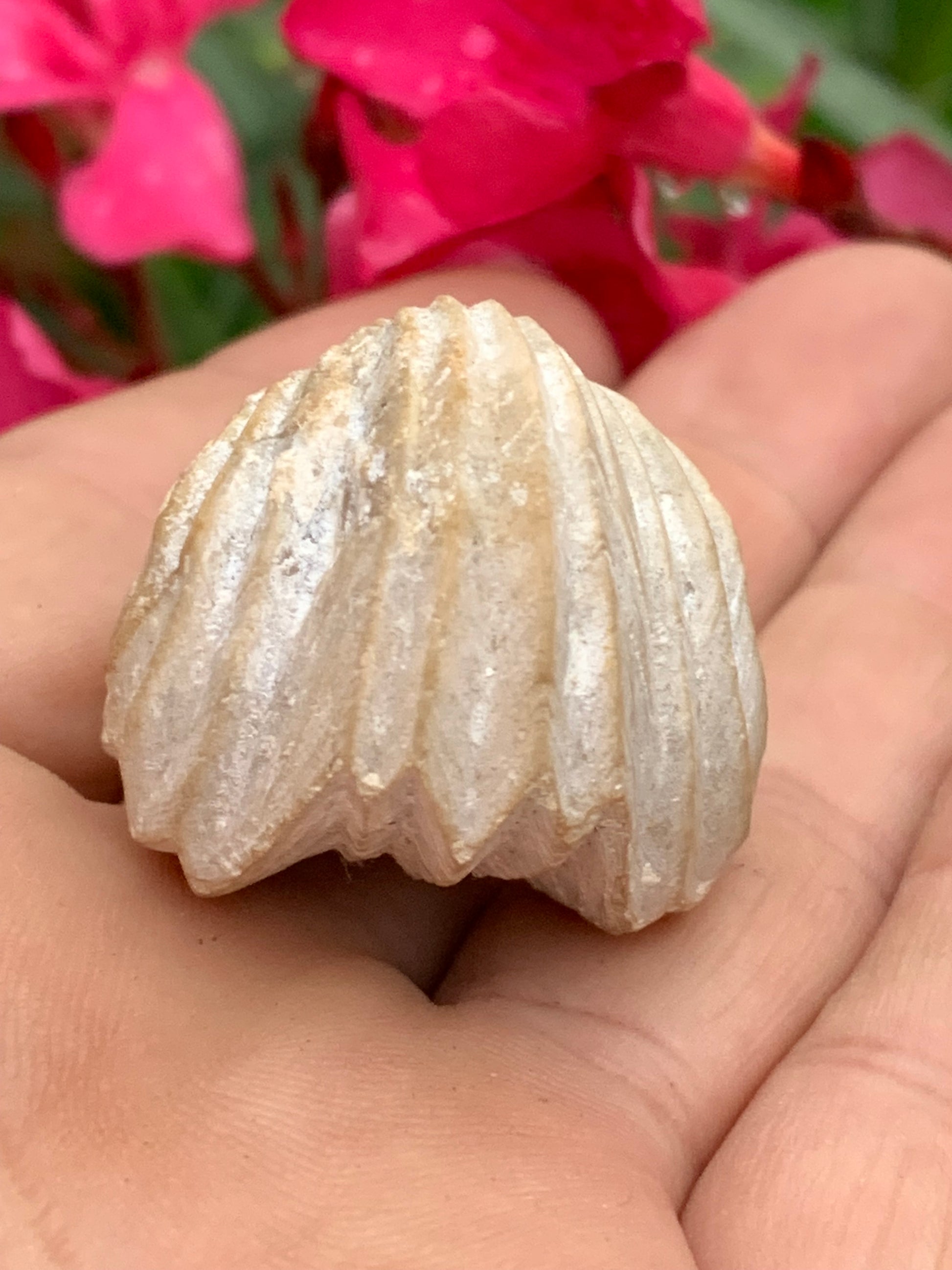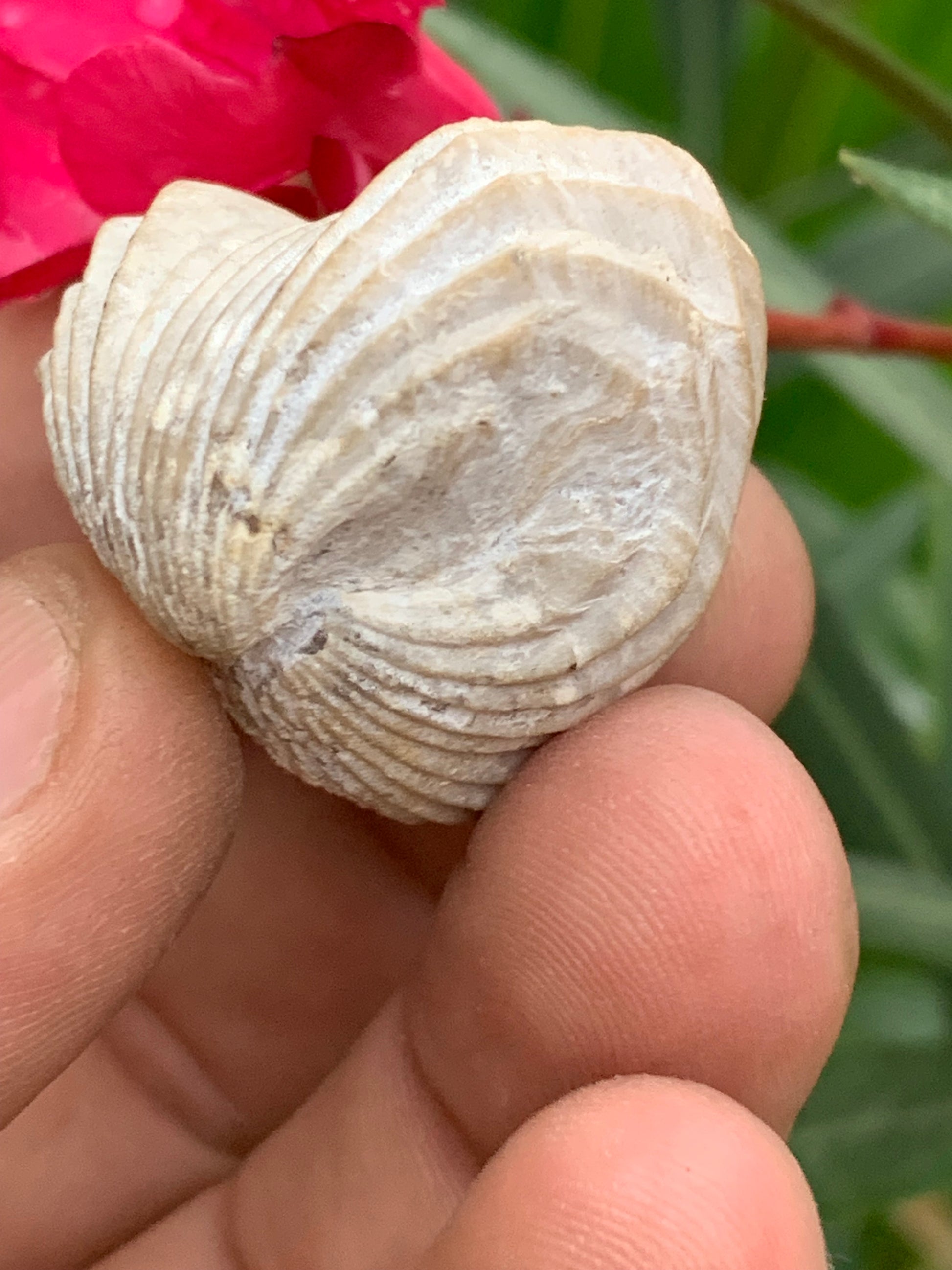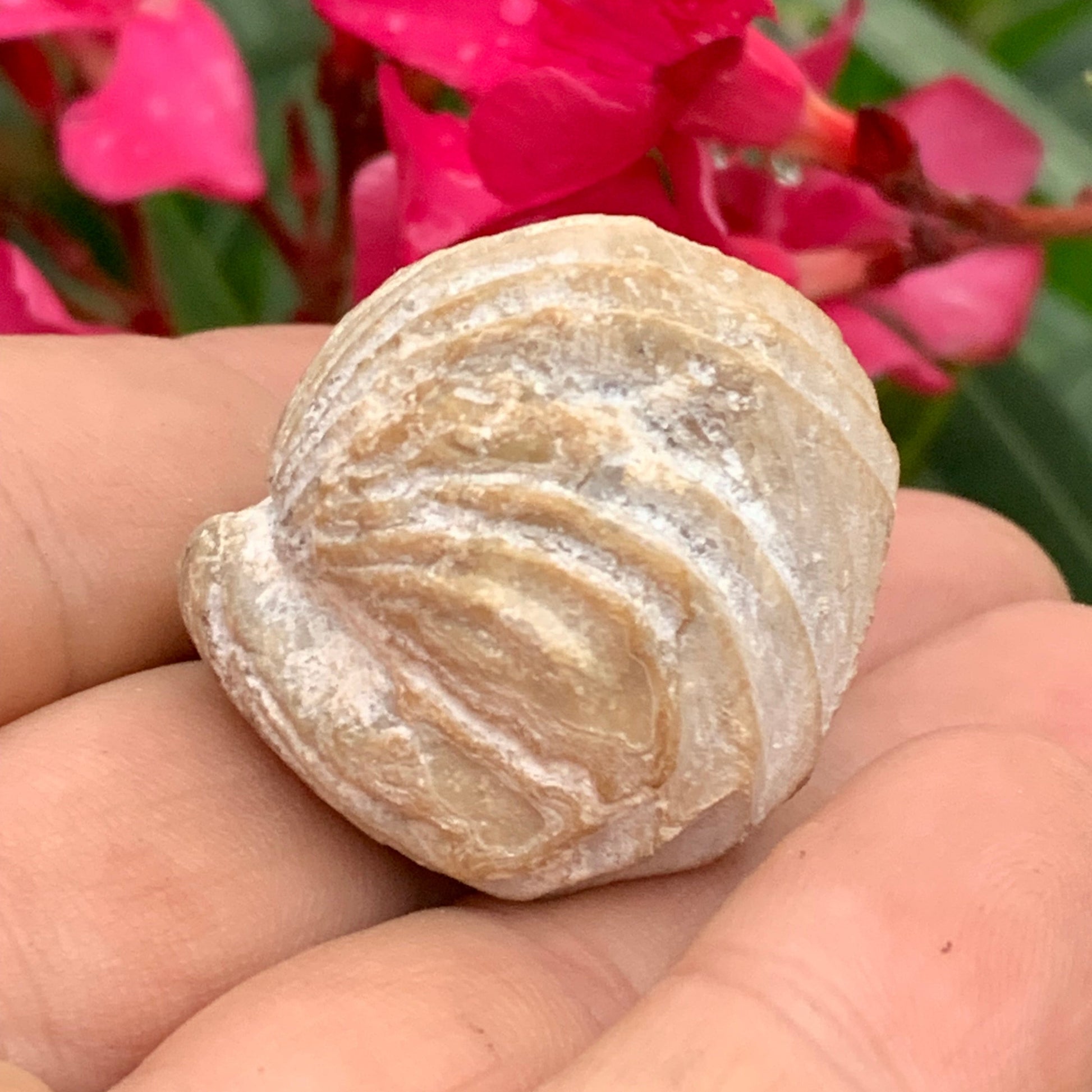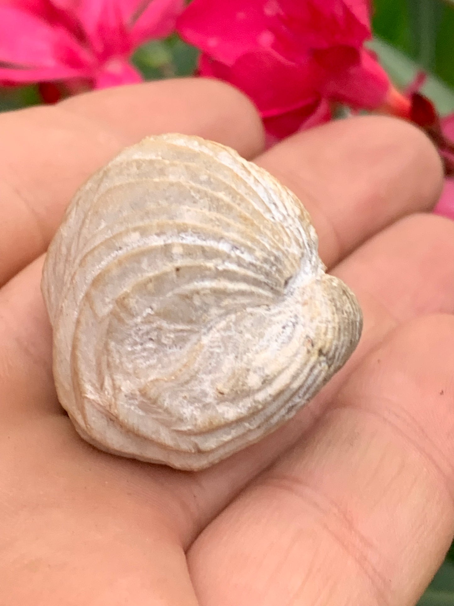 Coquillage bivalve fossile en calcaire de 34 x 31 x 31 millimètres / 31,7 grammes. Parfait pour décoration, collection ou exposition...