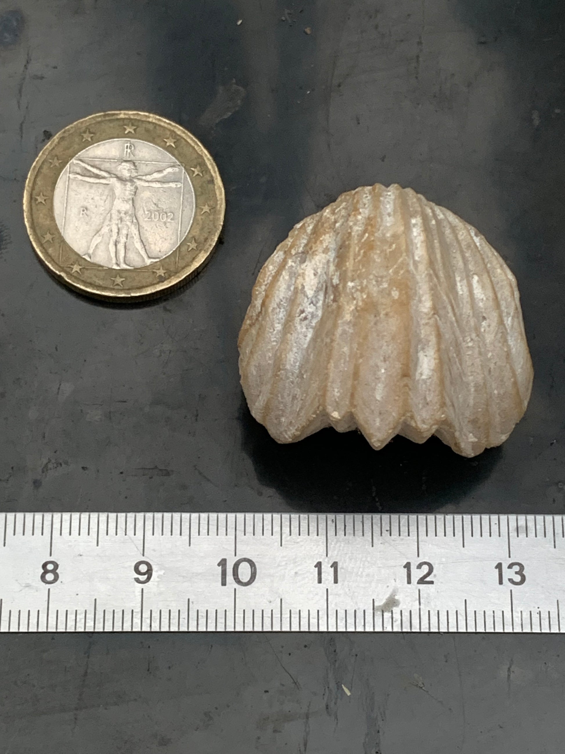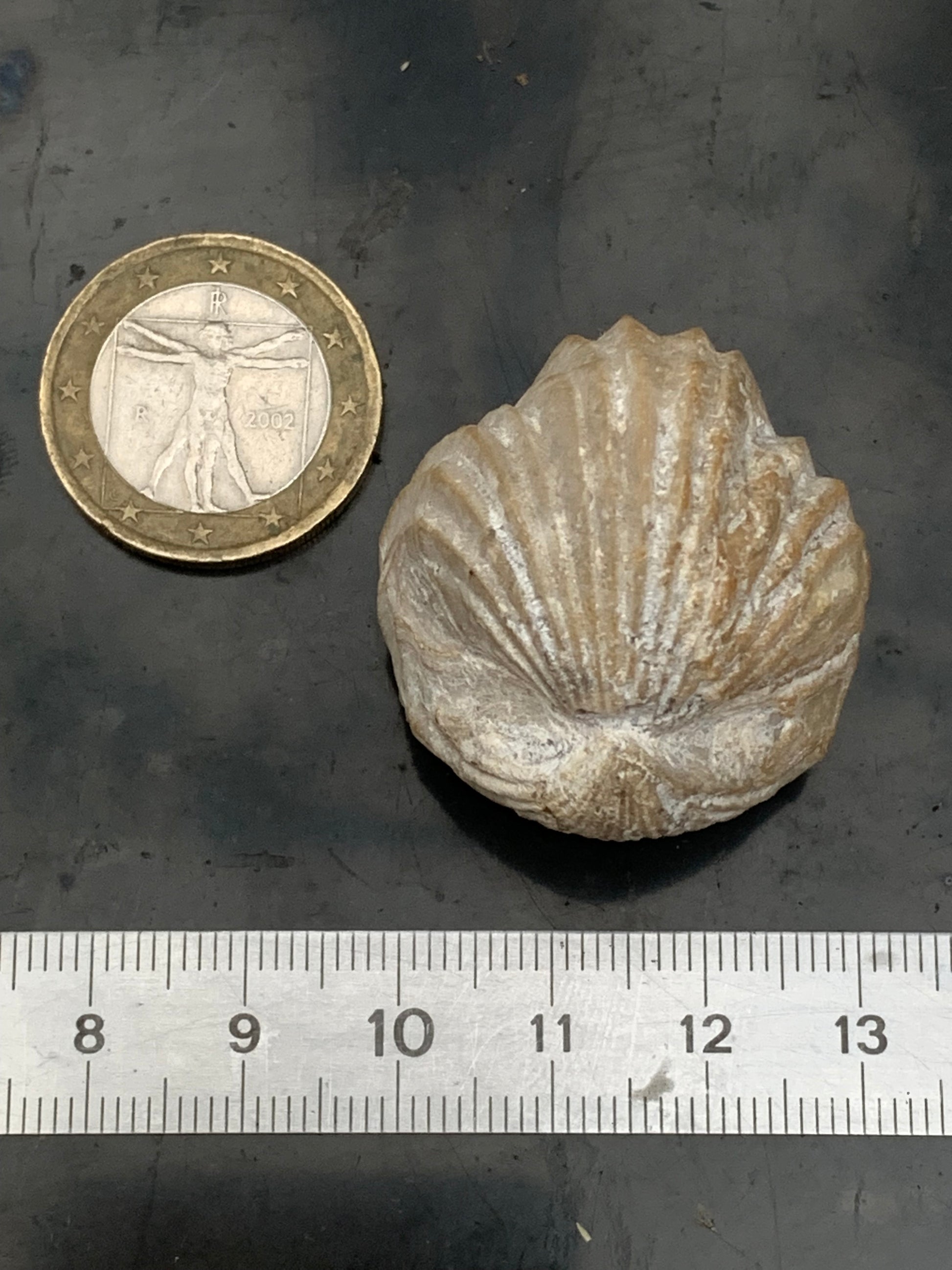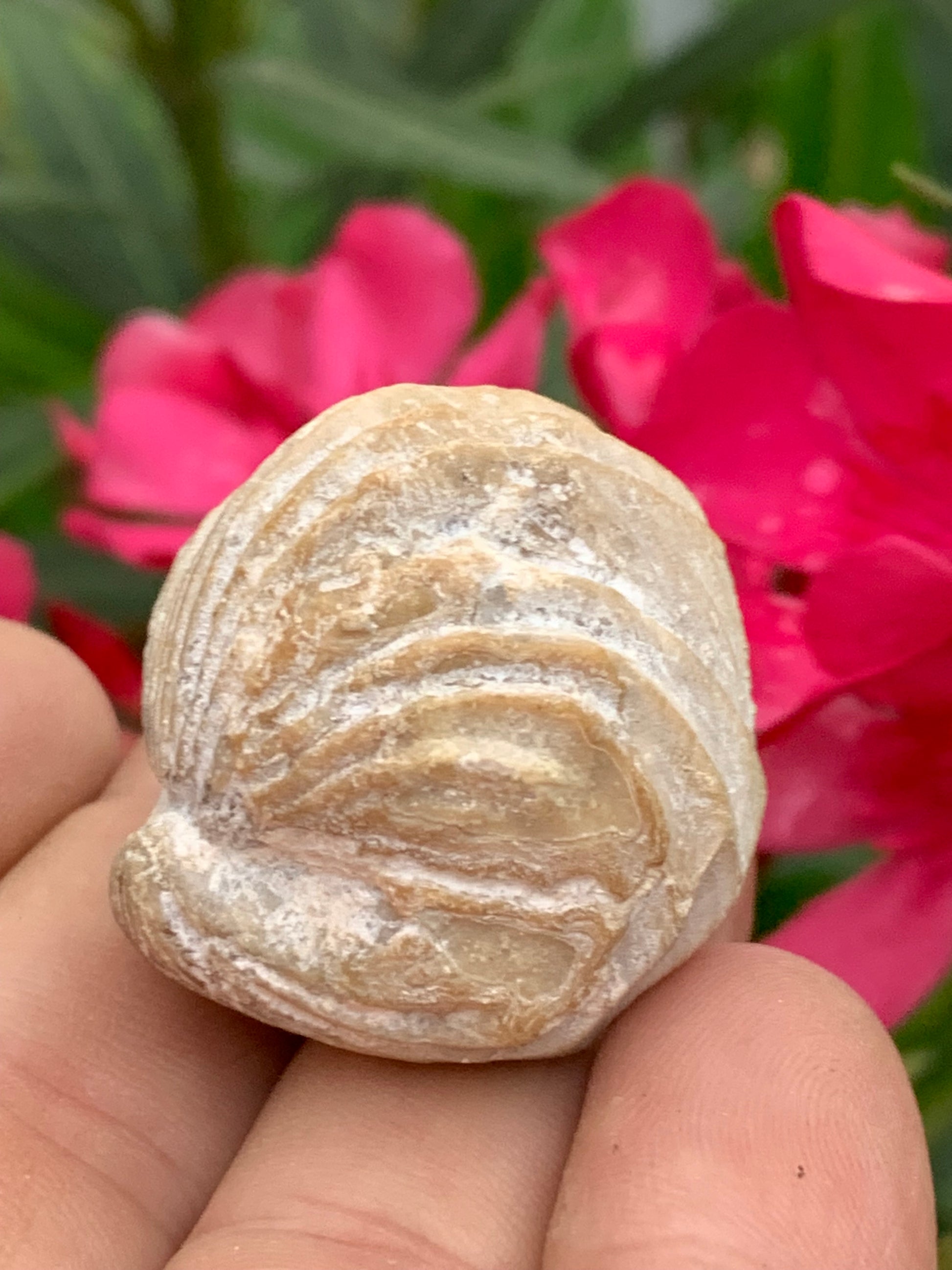 Coquillage bivalve fossile en calcaire de 34 x 31 x 31 millimètres / 31,7 grammes. Parfait pour décoration, collection ou exposition...