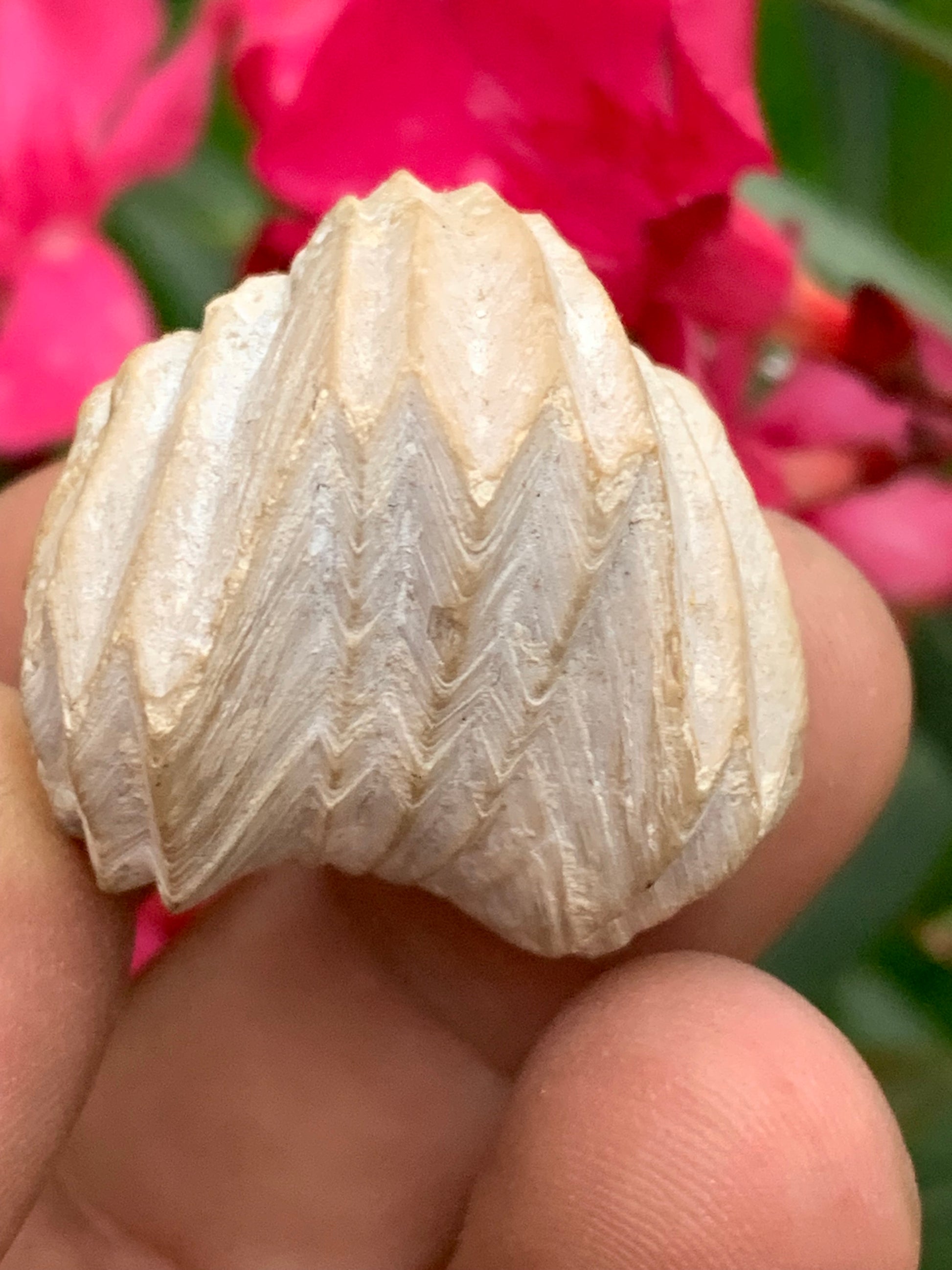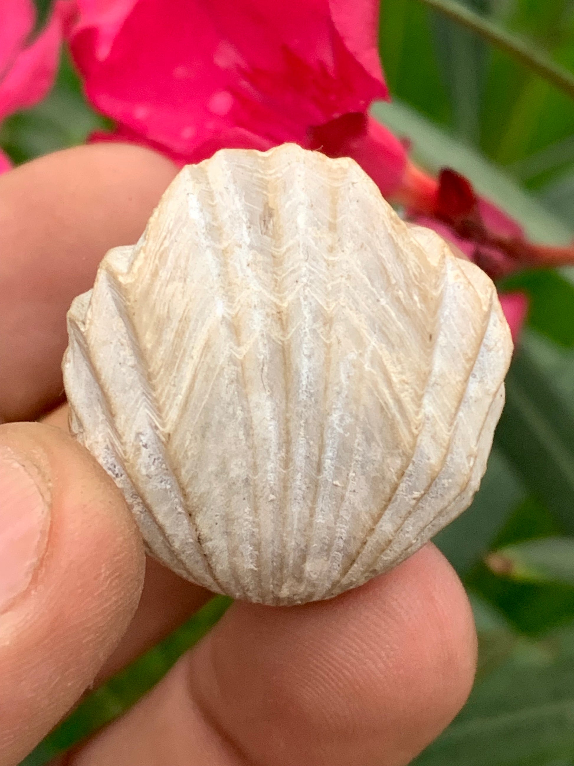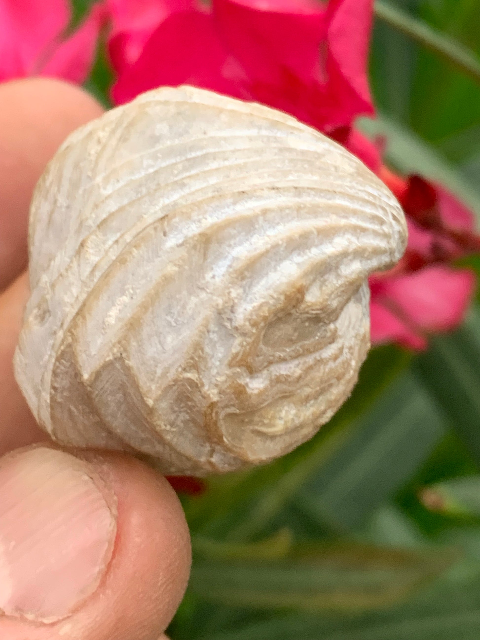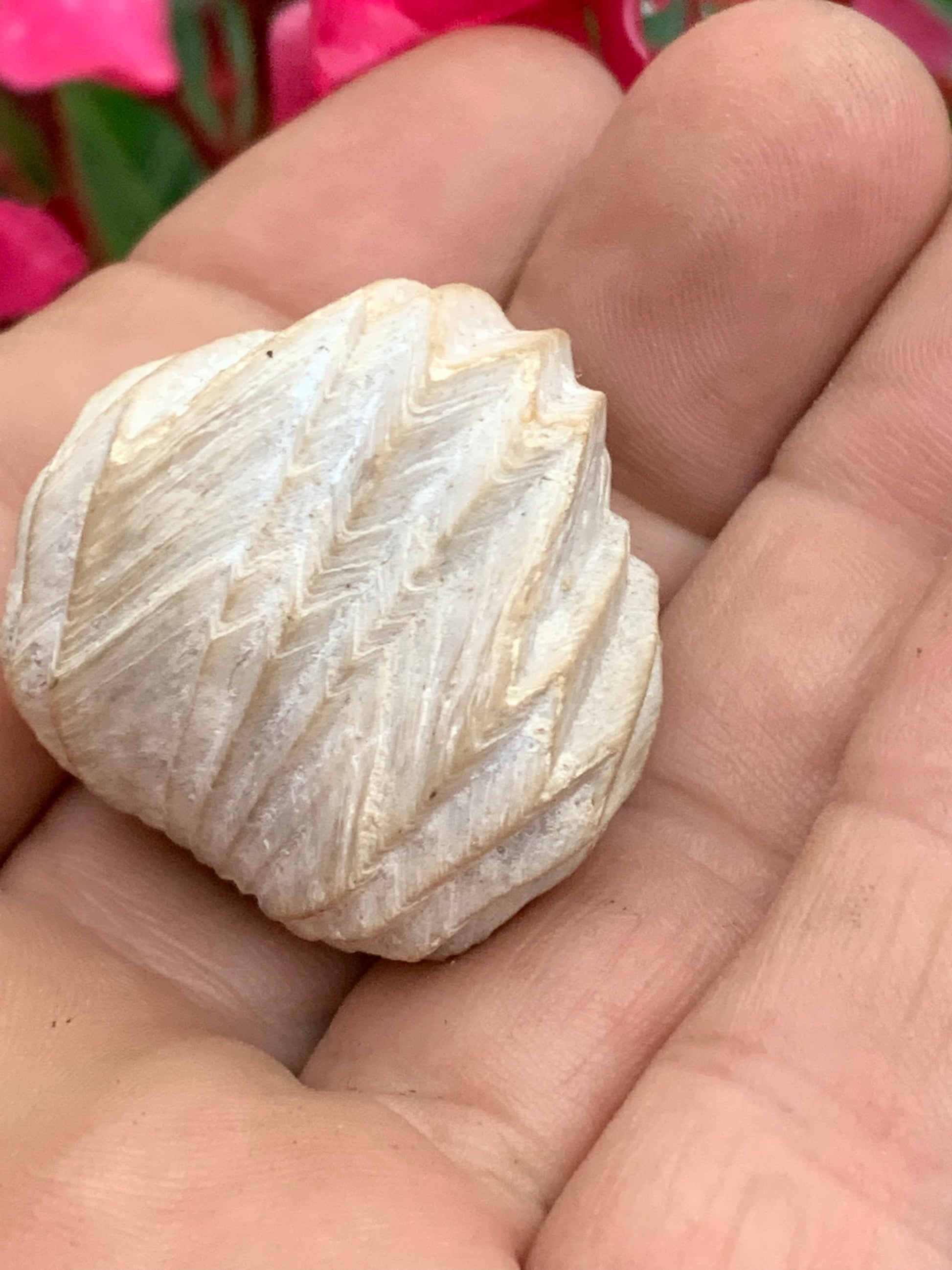 Coquillage bivalve fossile en calcaire de 34 x 31 x 31 millimètres / 31,7 grammes. Parfait pour décoration, collection ou exposition...