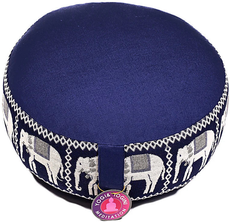 Coussin de Méditation ou de Yoga avec motif 'éléphant'. Taille 33 centimètres de diamètre x 13 centimètres de hauteur. 2300 grammes. De chez Yogi & Yogini, fait en Inde !