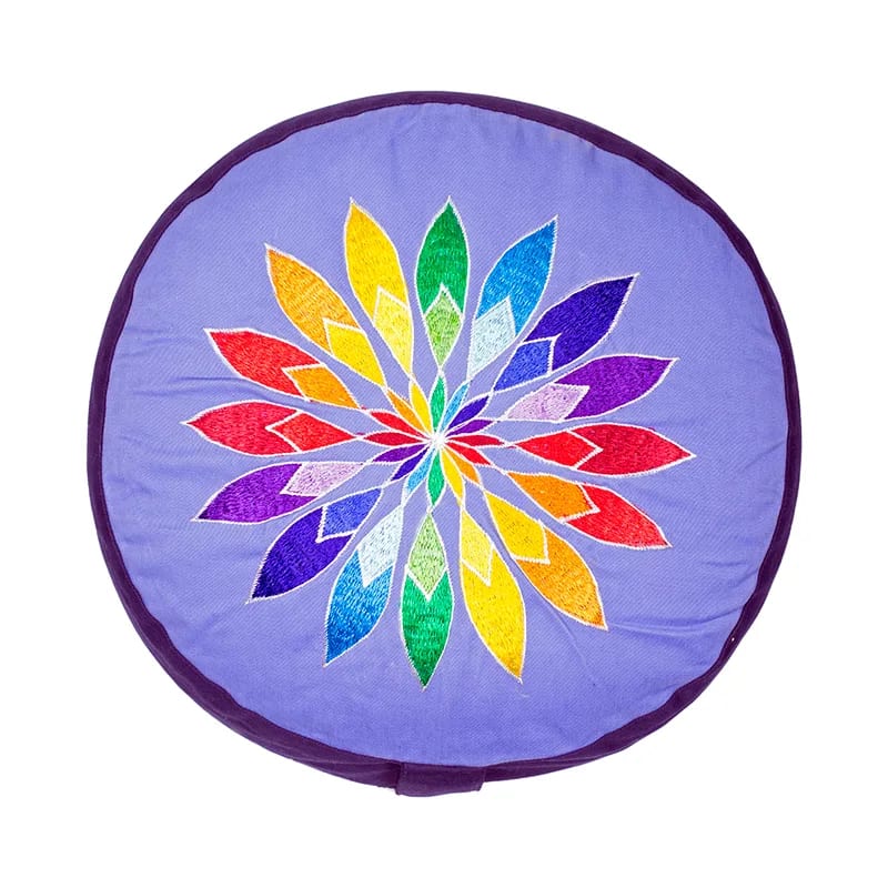 Coussin de Méditation ou de Yoga avec le motif d'une fleur aux couleurs des chakras. taille 33 centimètres de diamètre x 13 centimètres de hauteur. 2300 grammes. De chez Yogi & Yogini, fait en Inde !