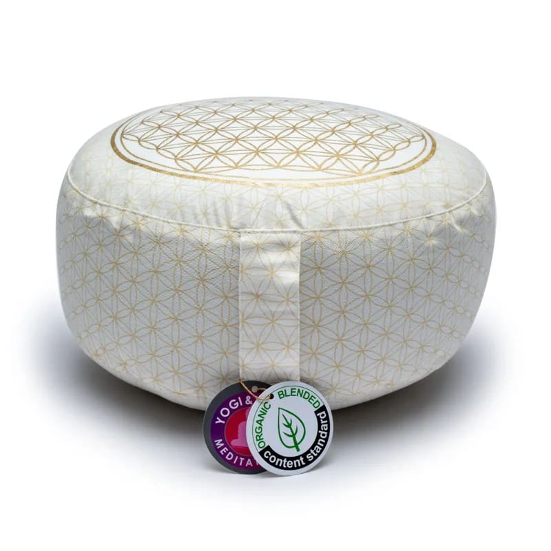 Coussin de yoga et méditation en coton biologique (OCS) – Motif Fleur de Vie – 38x28x13 cm – Fabriqué en Inde par Yogi & Yogini – Disponible seul ou avec tapis assorti !