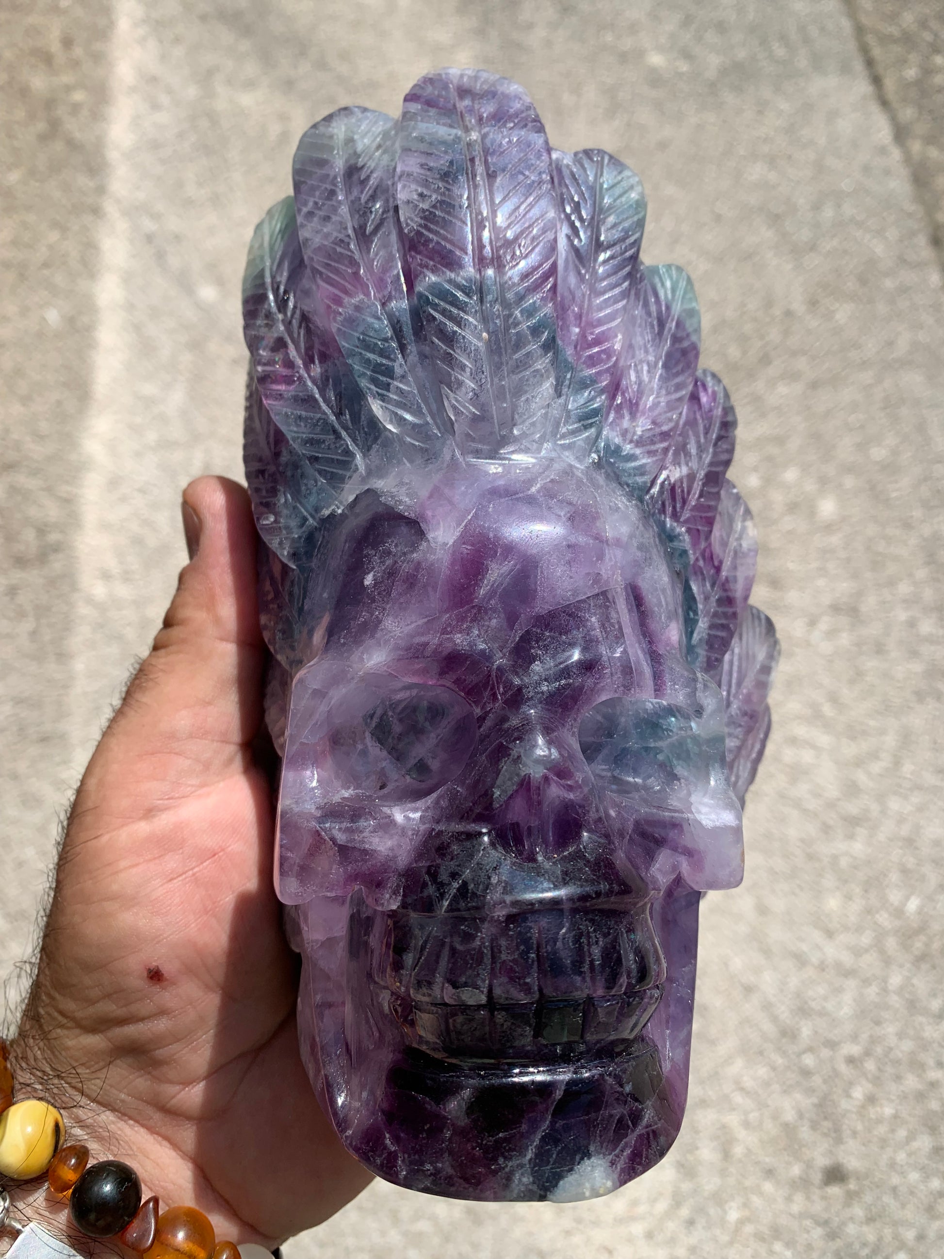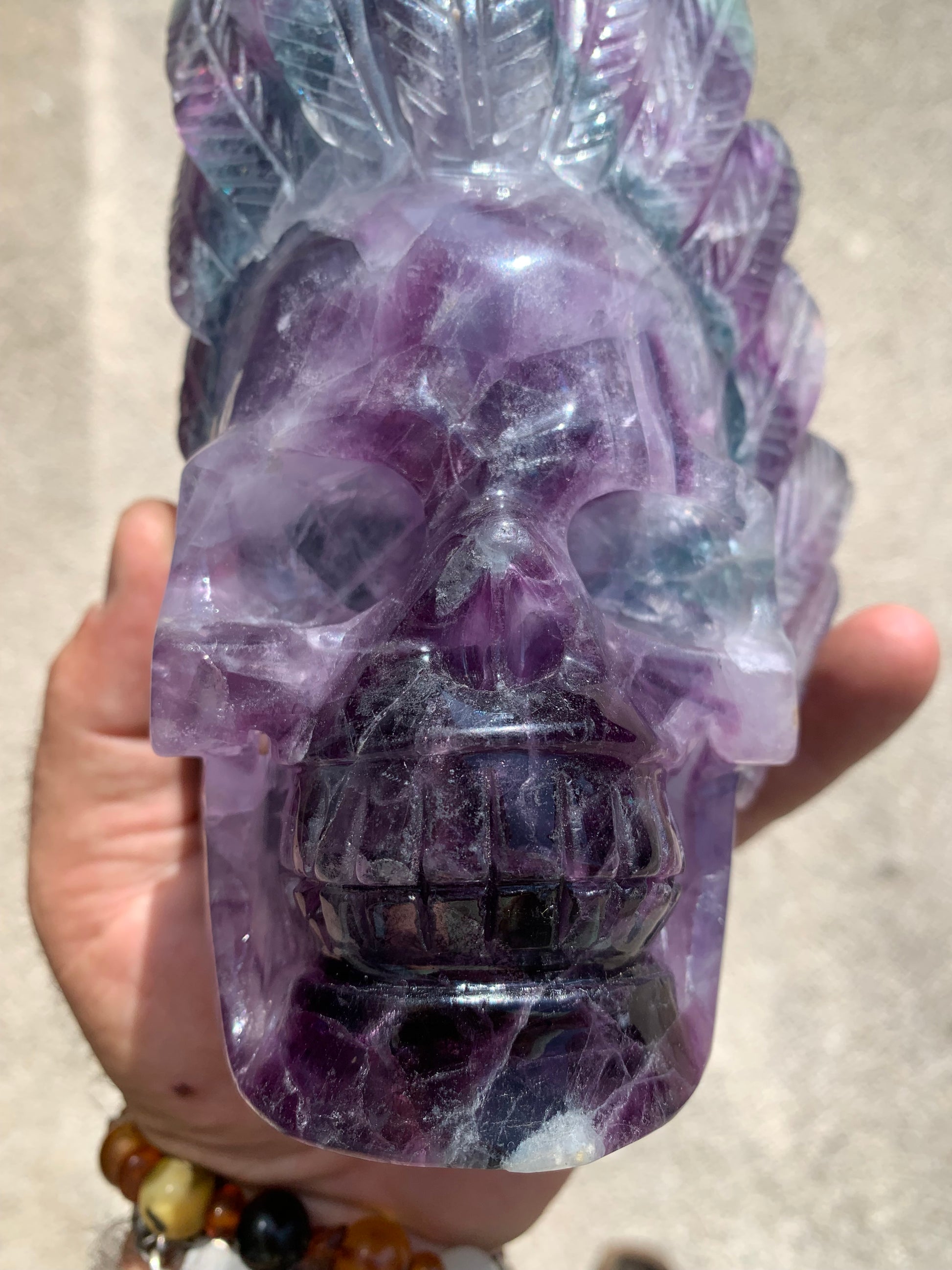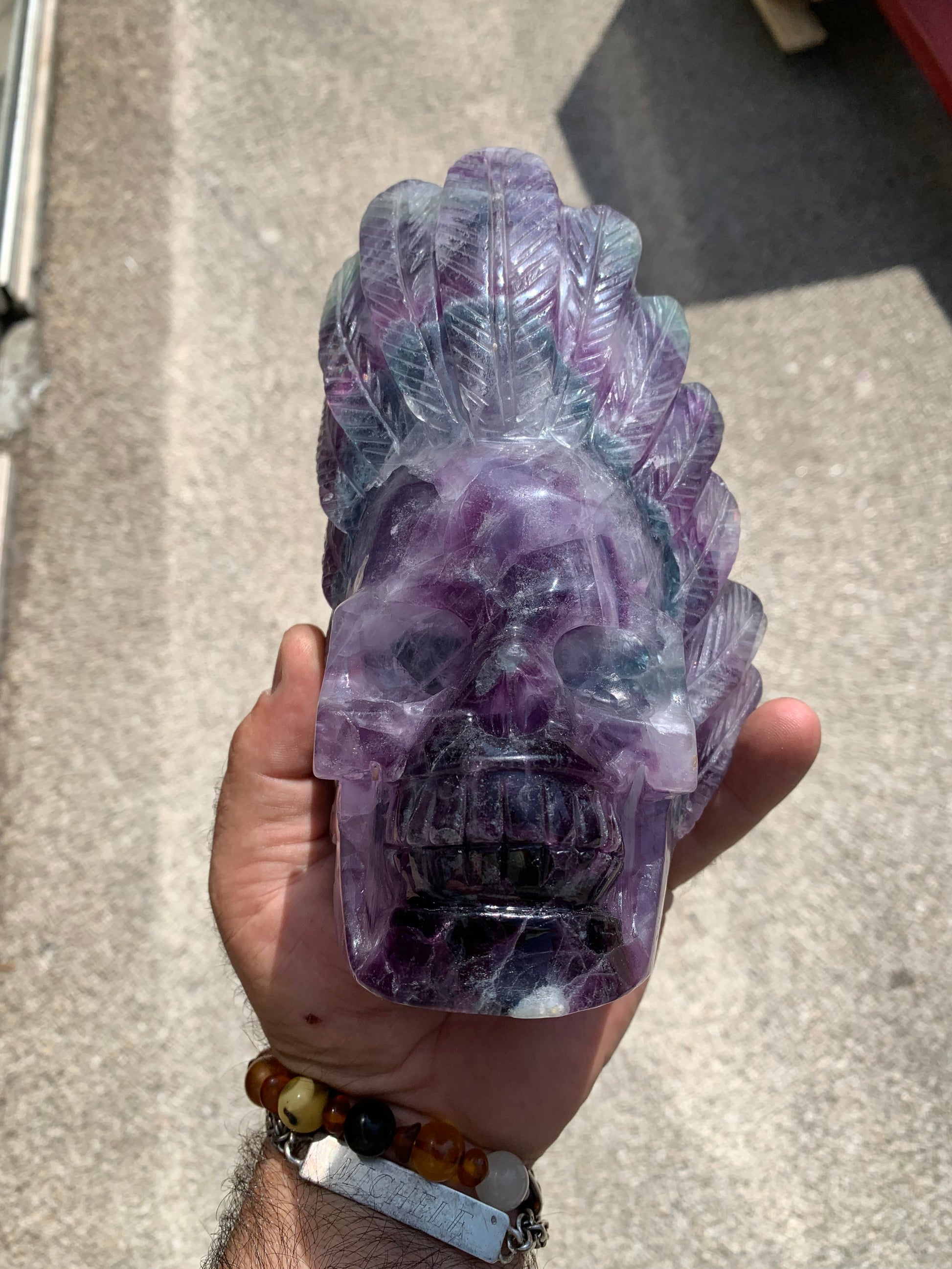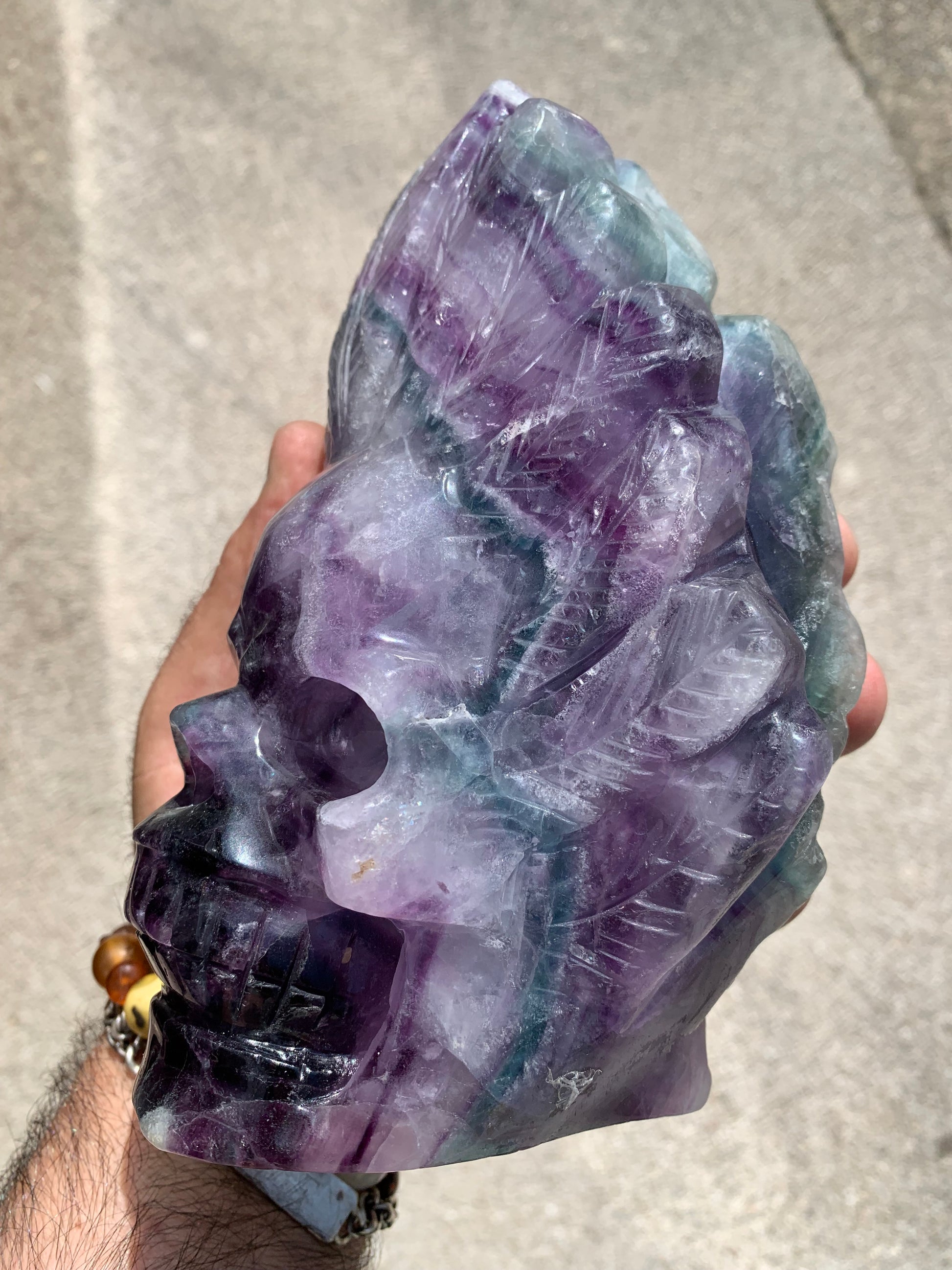 Crâne en Fluorite multicolore fait main, de 18cm x 10 x 9 / 1450 grammes. Belle qualité, de belles finitions, magnifique pièce !
