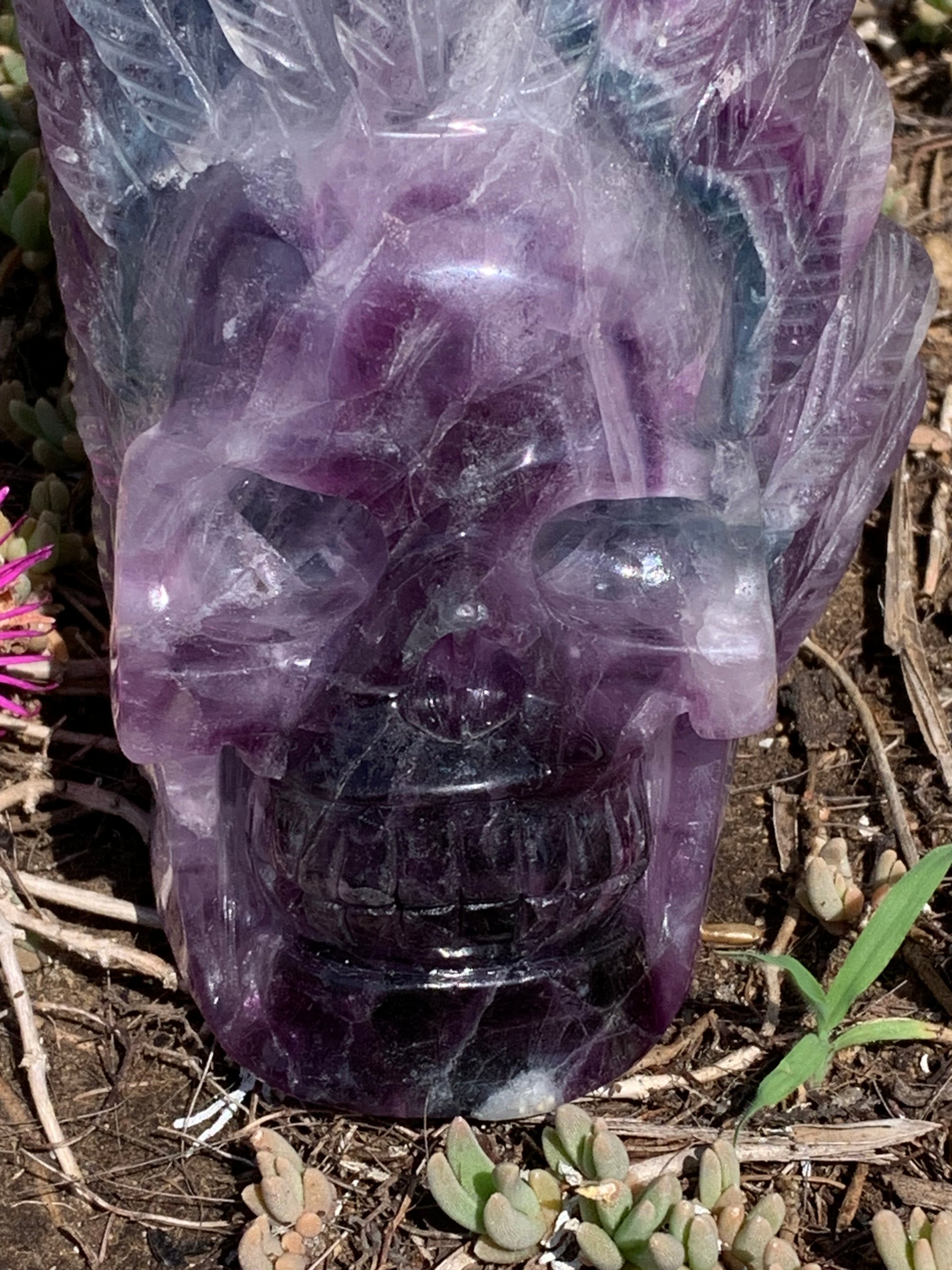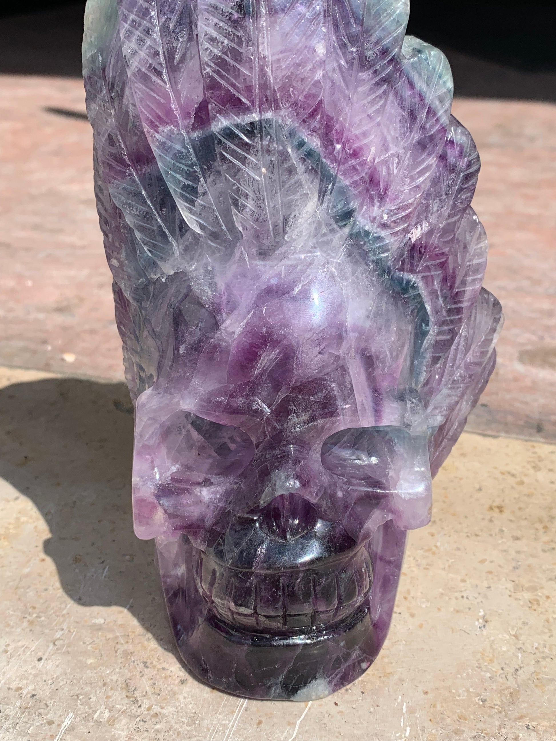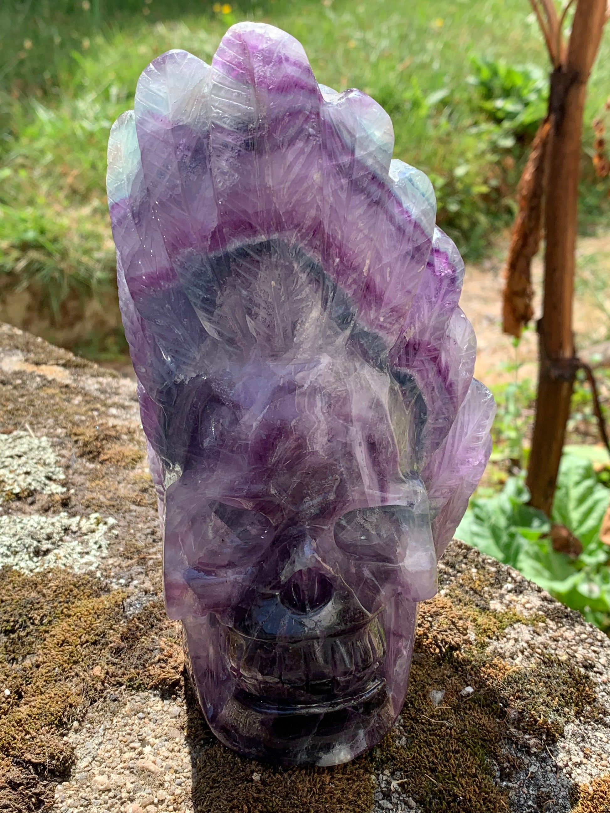 Crâne en Fluorite multicolore fait main, de 18cm x 10 x 9 / 1450 grammes. Belle qualité, de belles finitions, magnifique pièce !