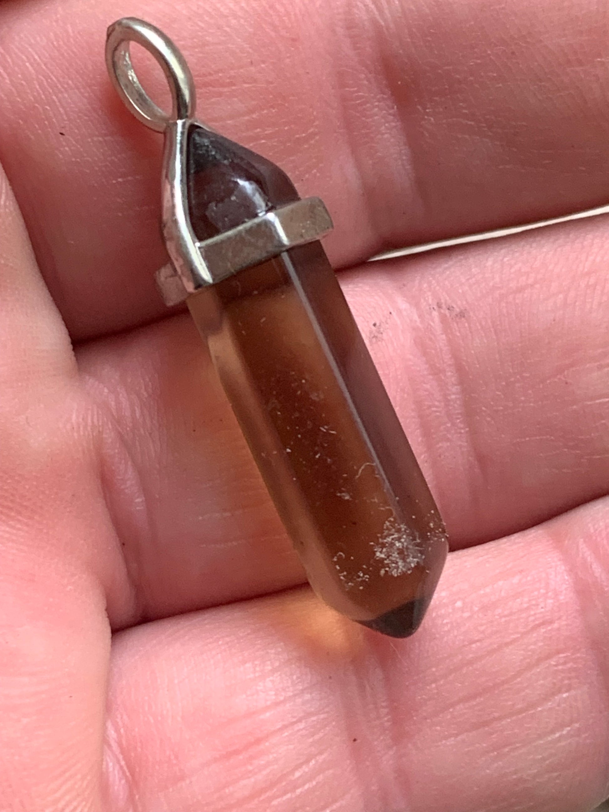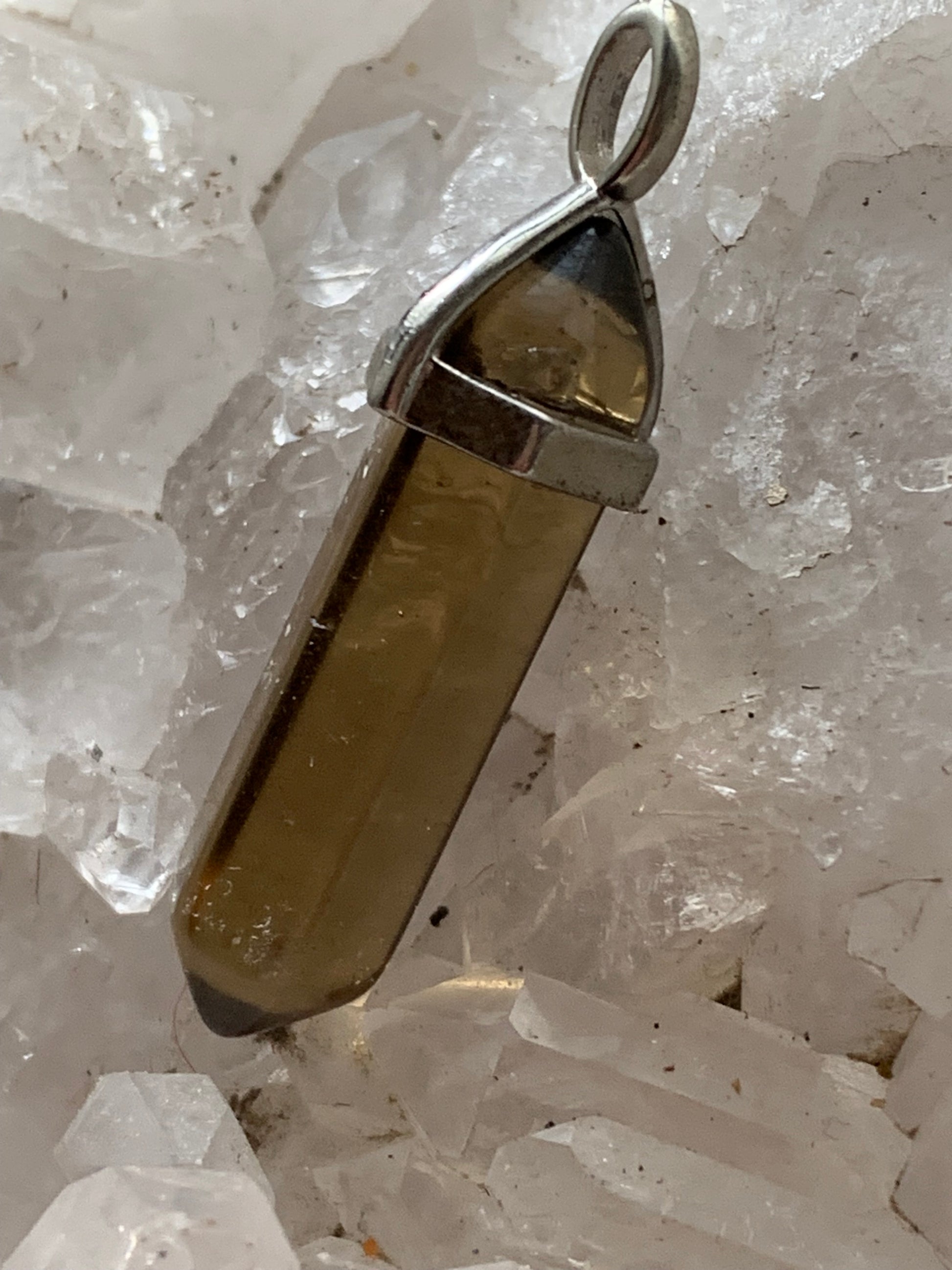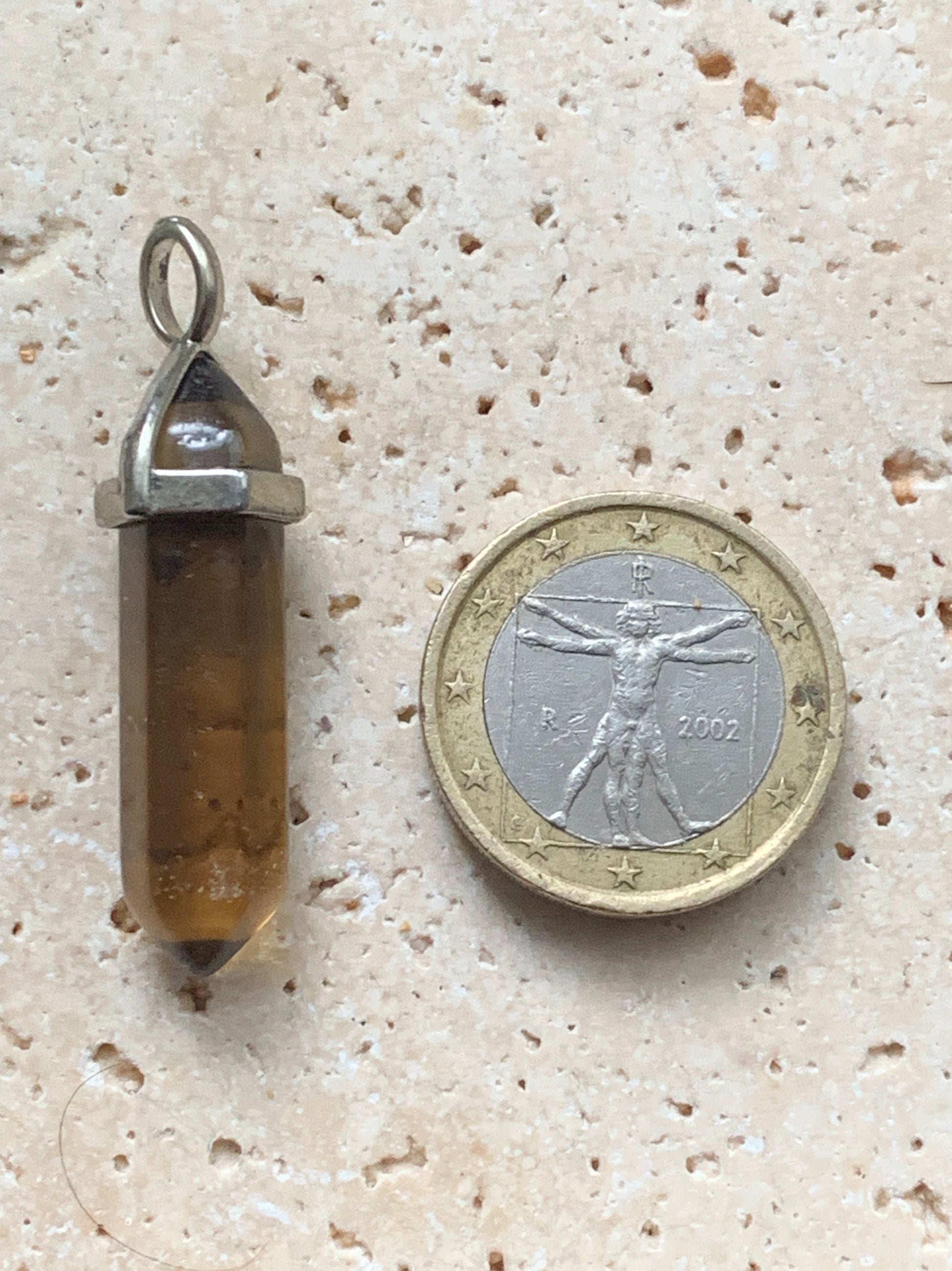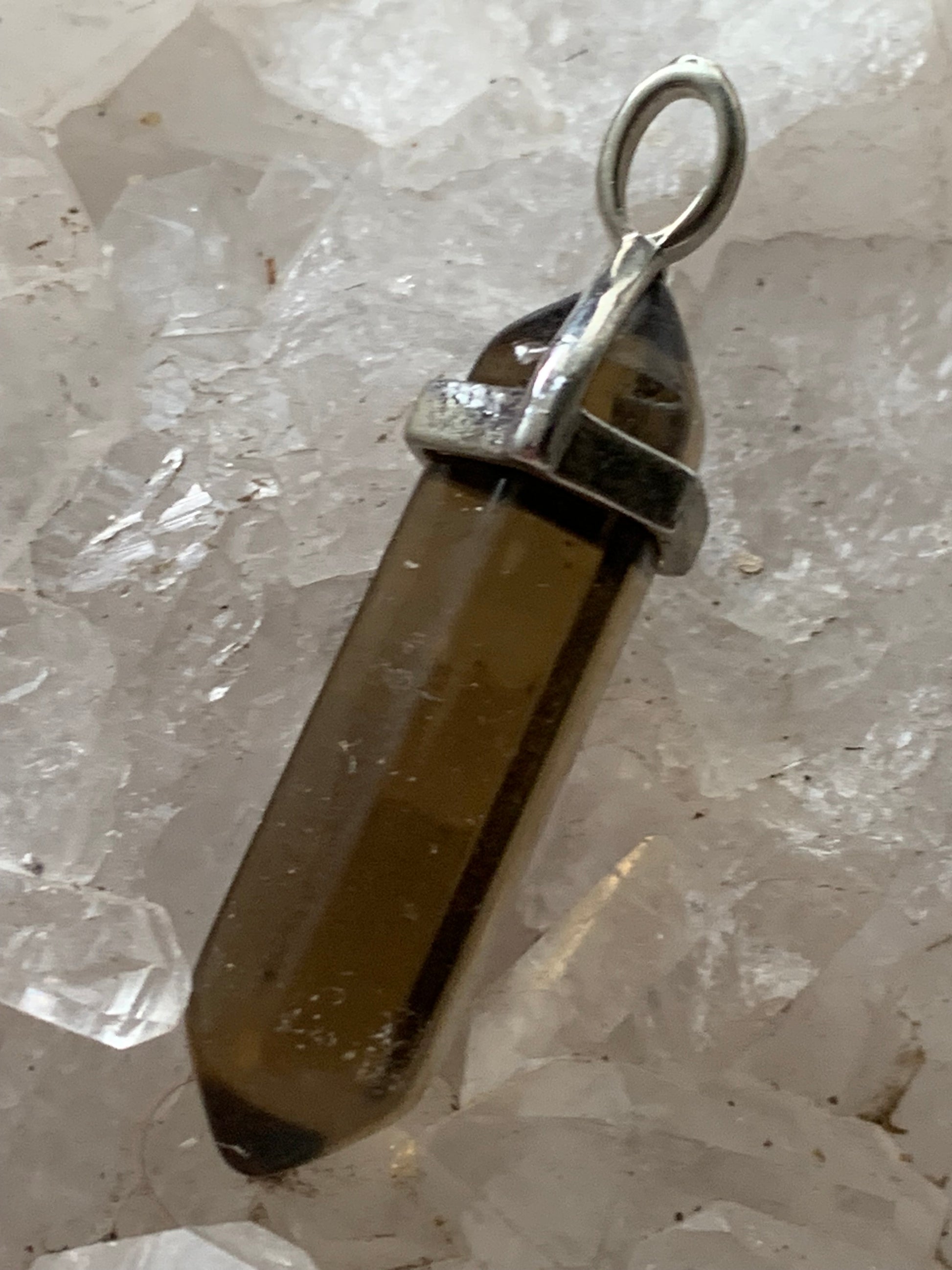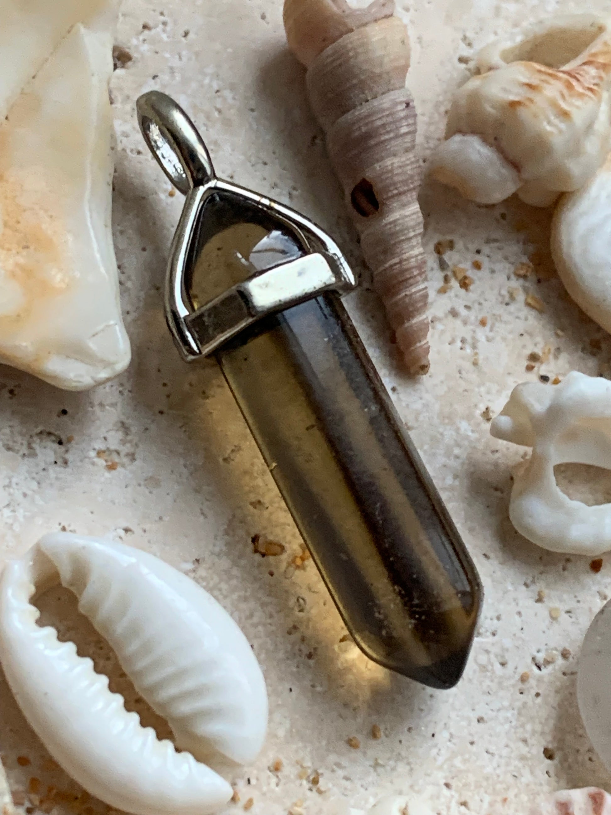 Cristal de roche fumé/ quartz fumé bi-déterminé, pendentif de 41mm x8 x8. Fait sur métal (laiton), finition argenté. Vendu avec cordon réglable de couleur noire !