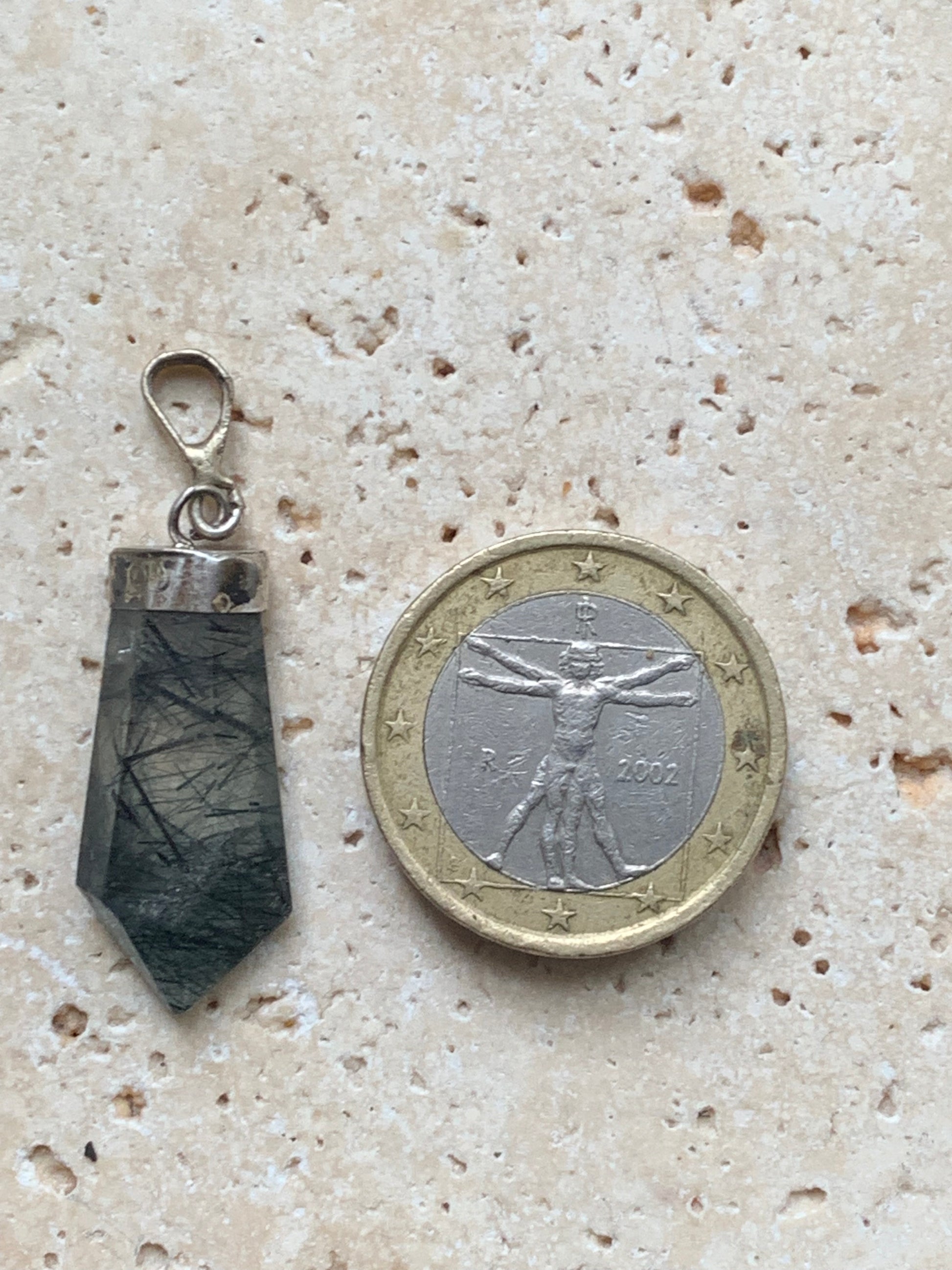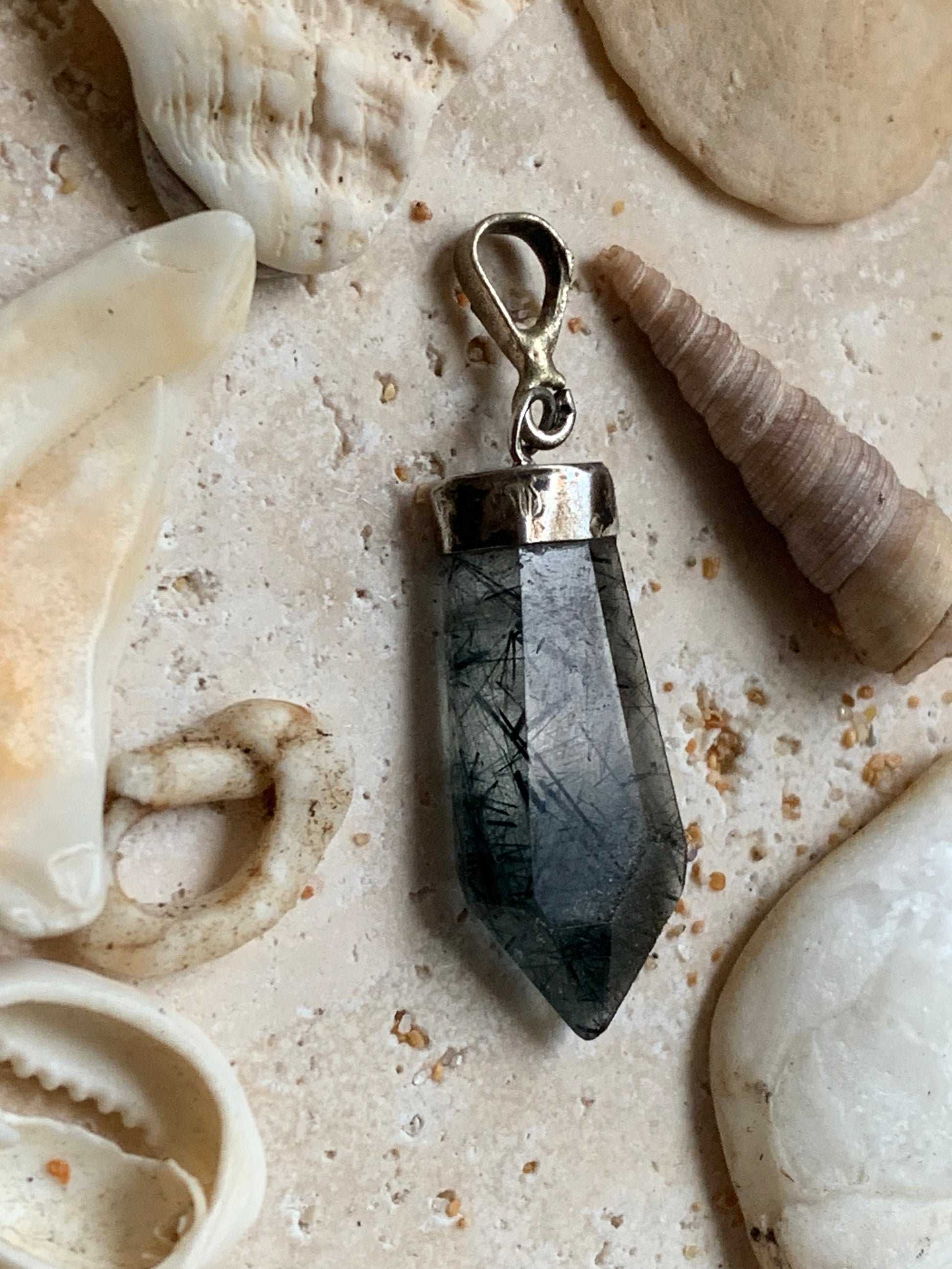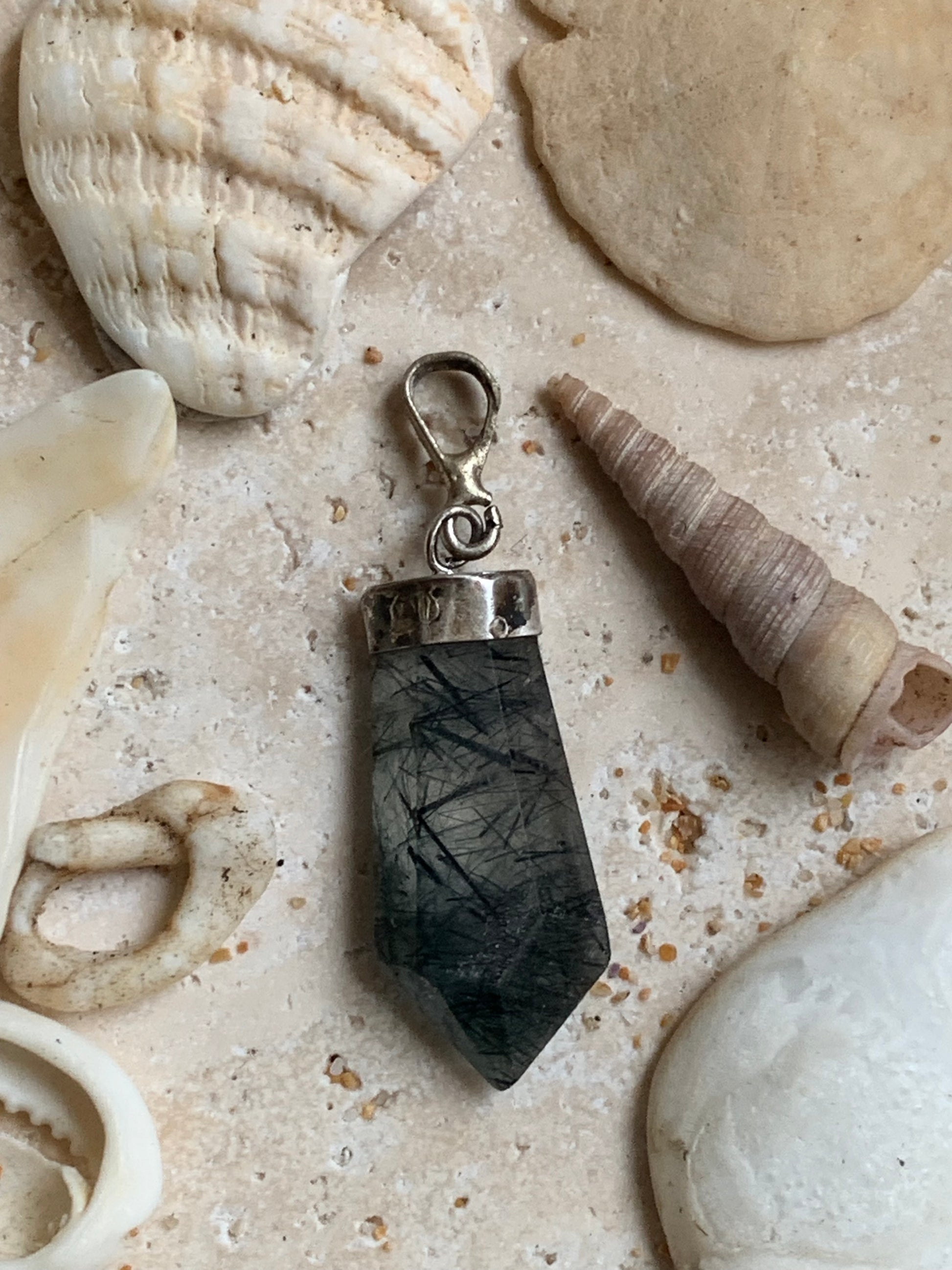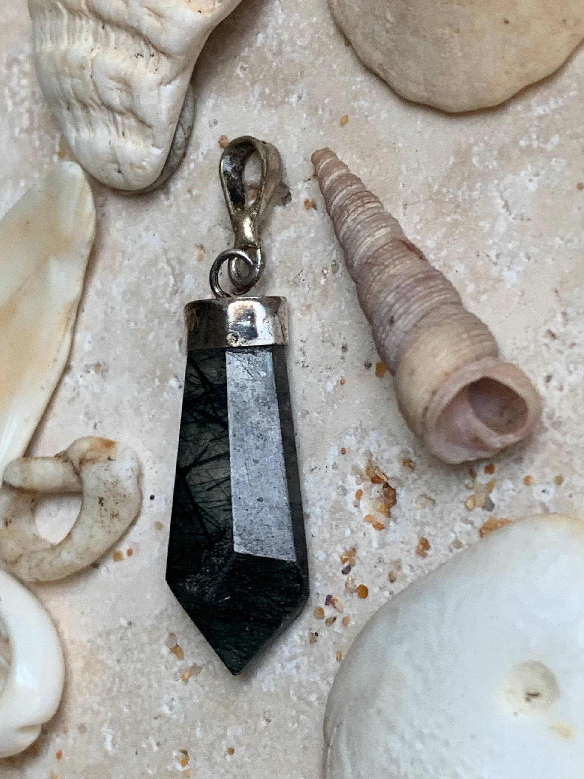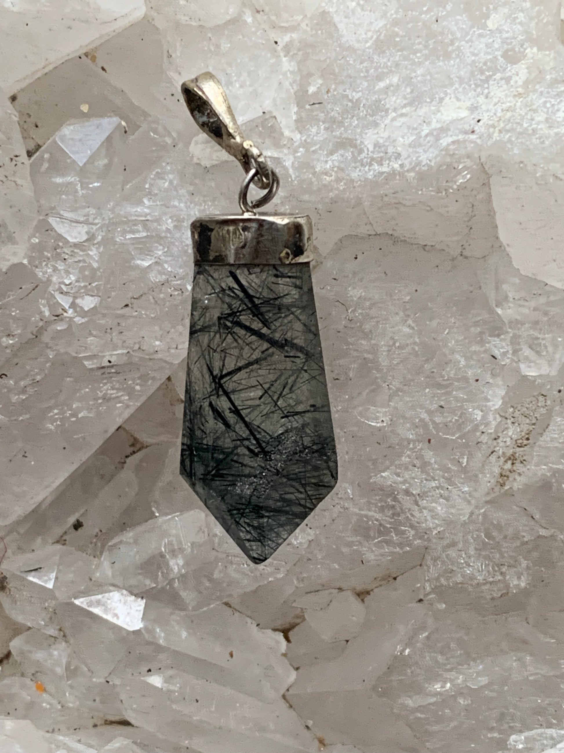 Cristal de roche/ quartz avec inclusions de tourmaline noire ! Pendentif en Argent, 39 mm de hauteur x 12 de largeur x 5 d'épaisseur. Vendu avec cordon réglable de couleur noire !
