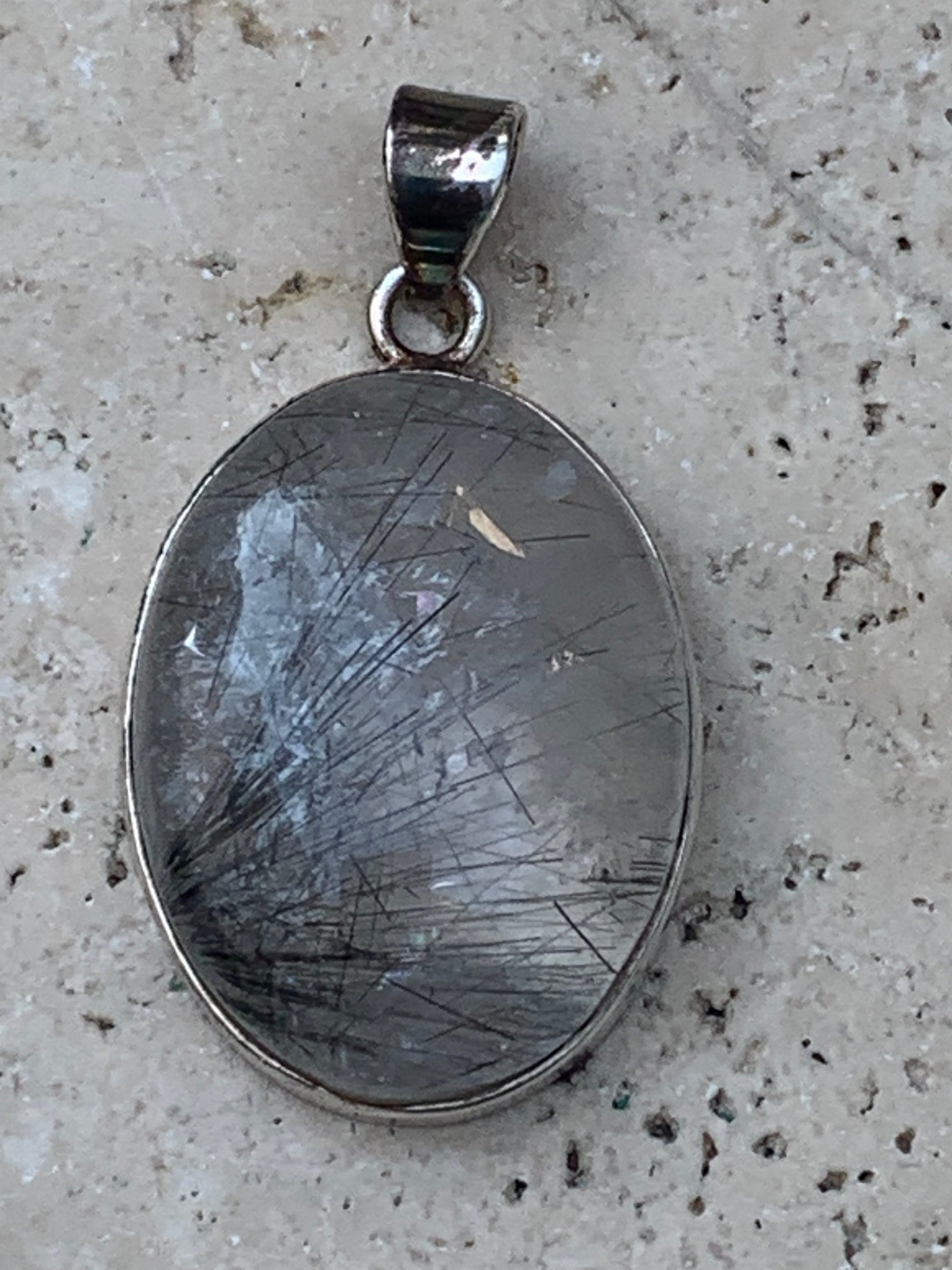 Cristal de roche/ quartz avec inclusions de tourmaline noire ! Pendentif en Argent, 43 mm de hauteur x 25 de largeur x 10 d'épaisseur. Vendu avec cordon réglable de couleur noire !