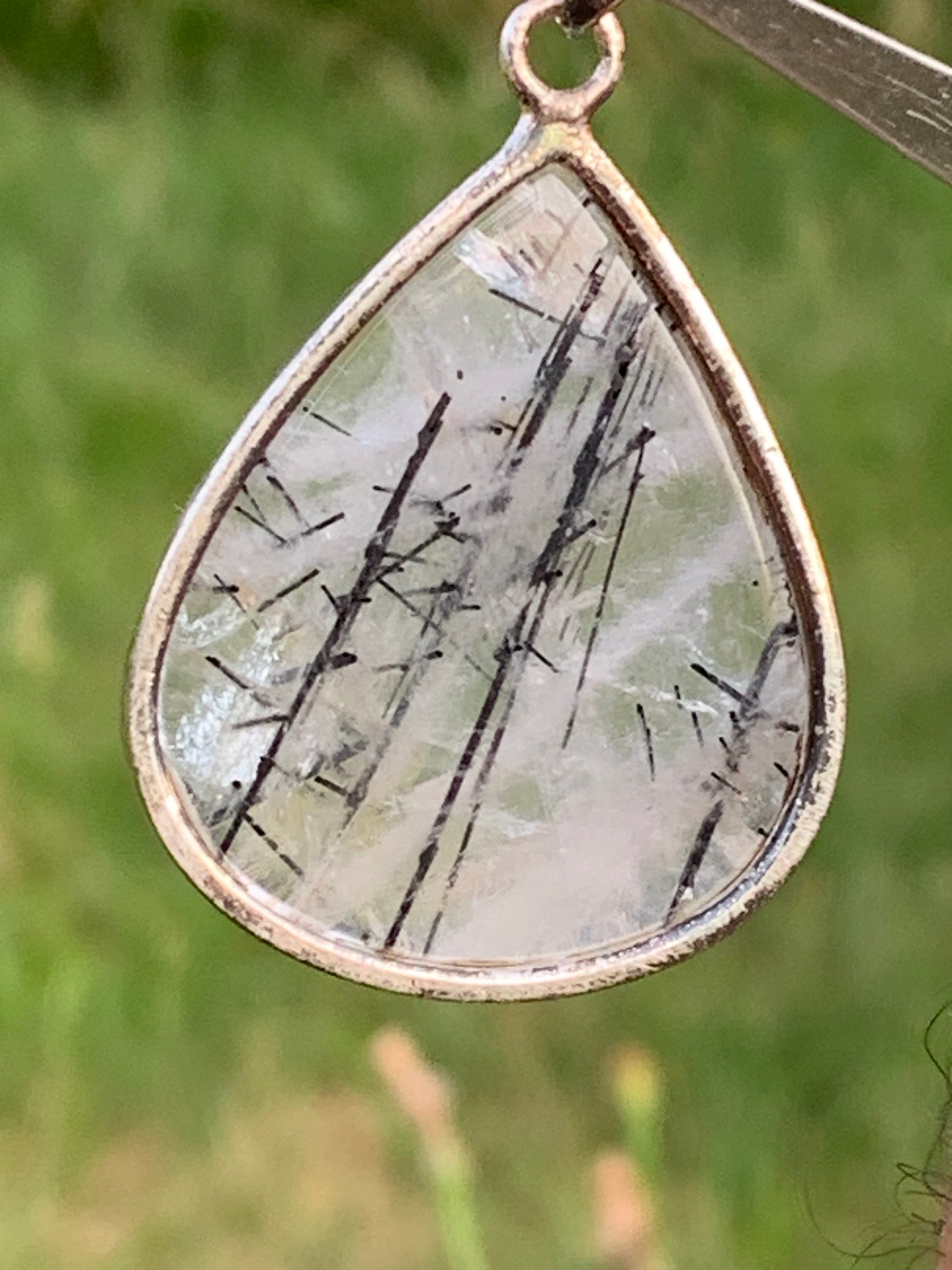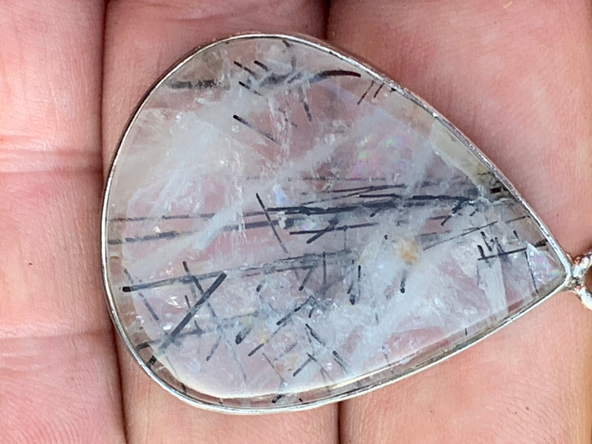 Cristal de roche/ quartz avec inclusions de tourmaline noire ! Pendentif en Argent, 48mm de hauteur x30 x7. Vendu avec cordon réglable de couleur noire !