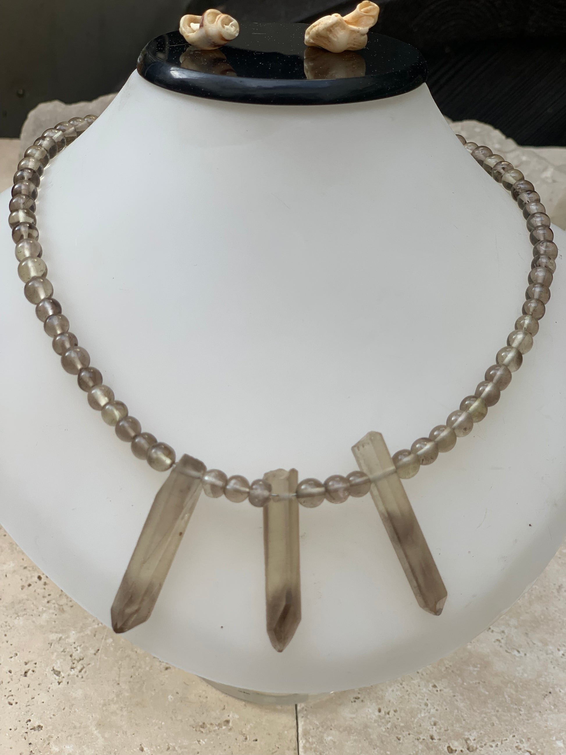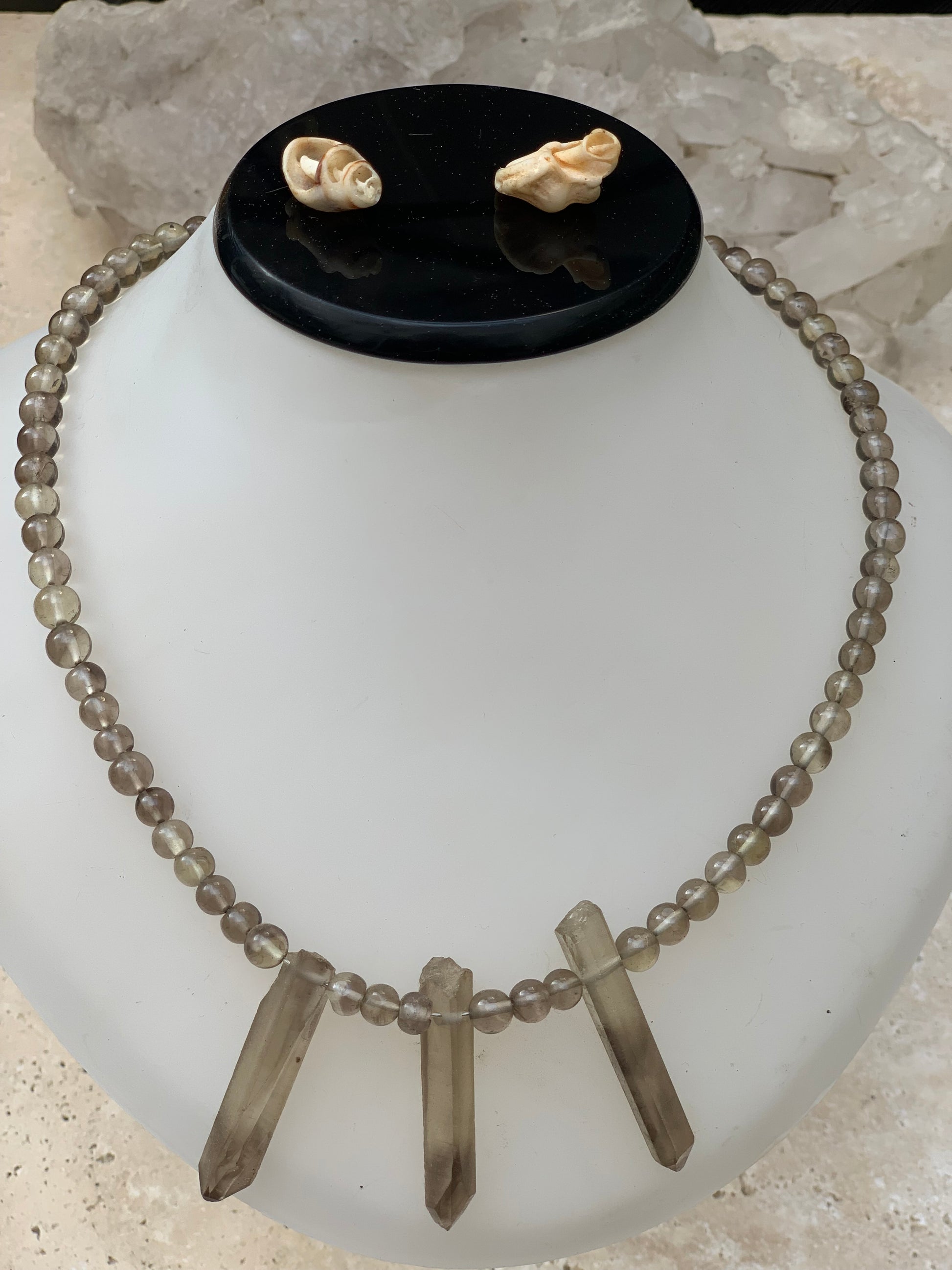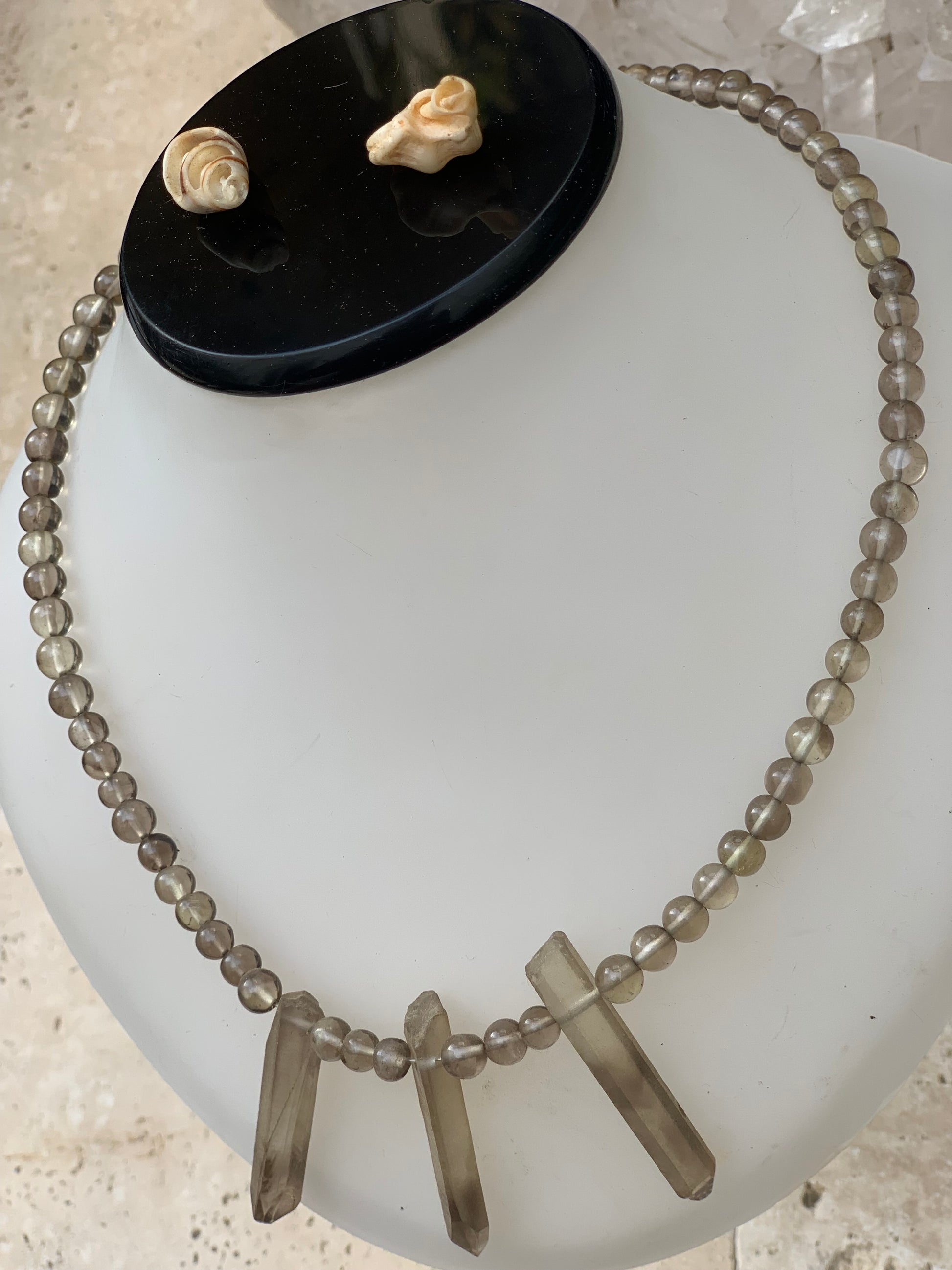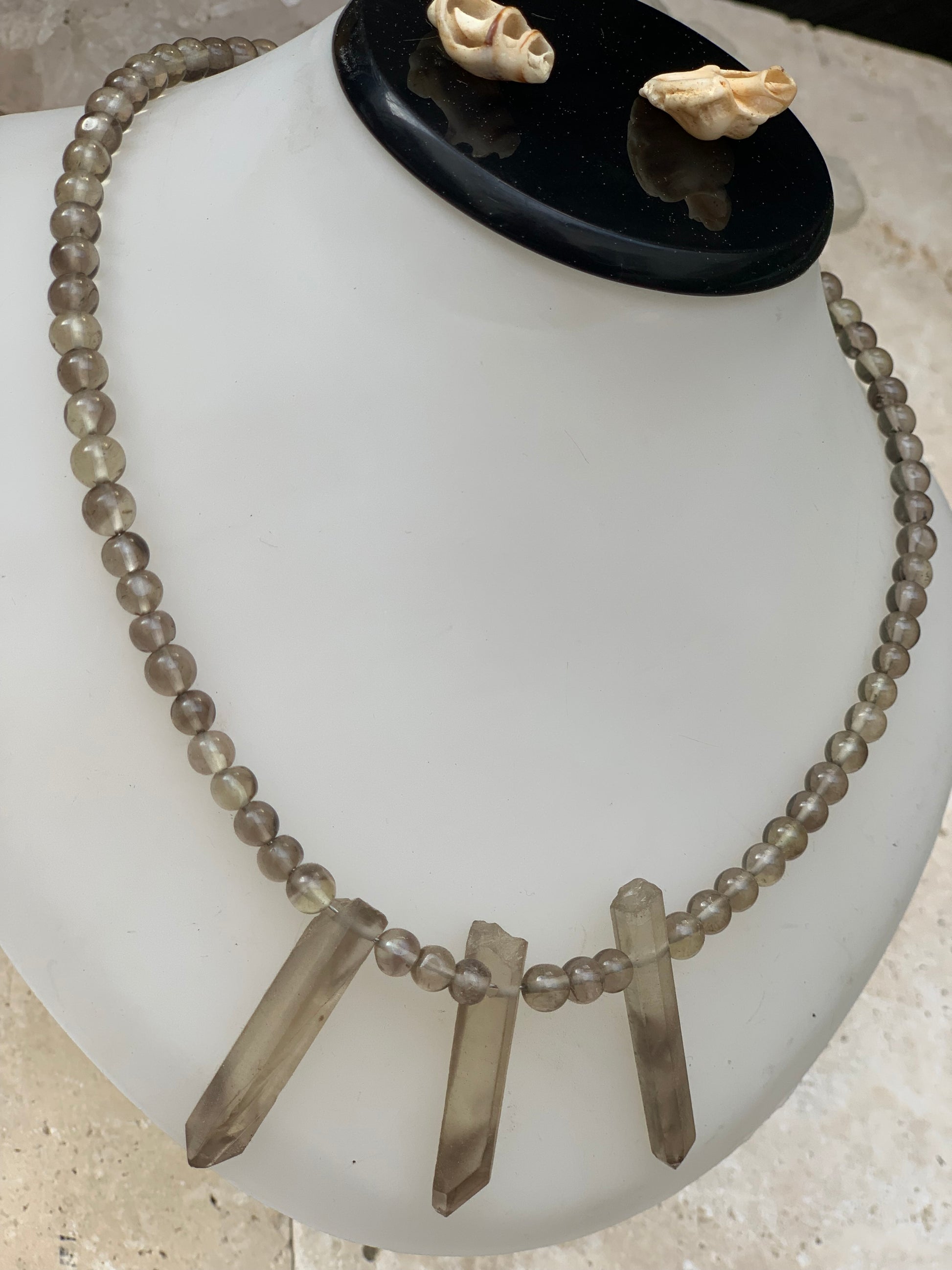Cristal de roche/ Quartz fumé, en collier de 42 centimètres. Perle rondes de 4 à 7 millimètres avec 3 cristaux naturels en panoramique, fermoir de type 'crochet' !