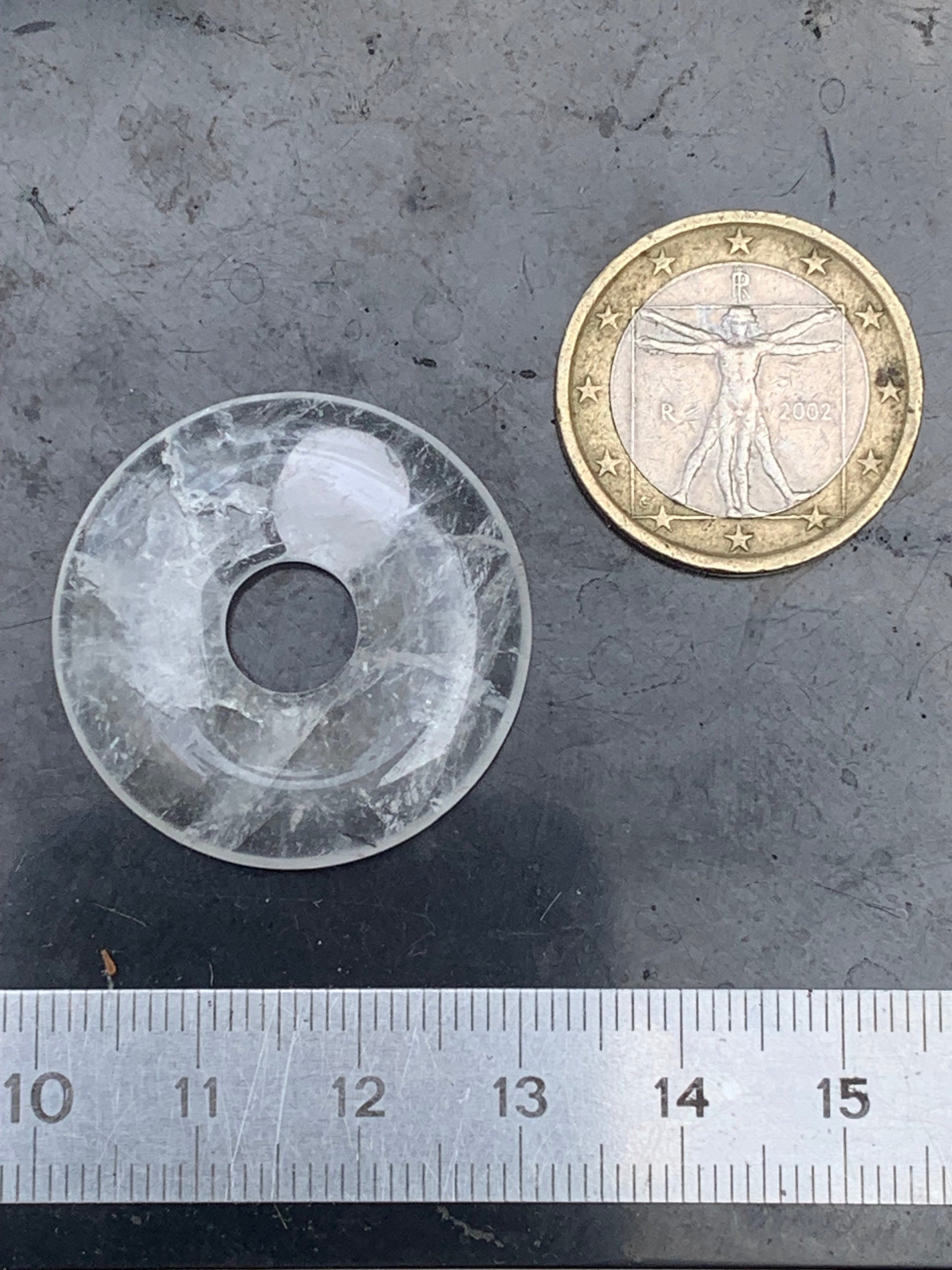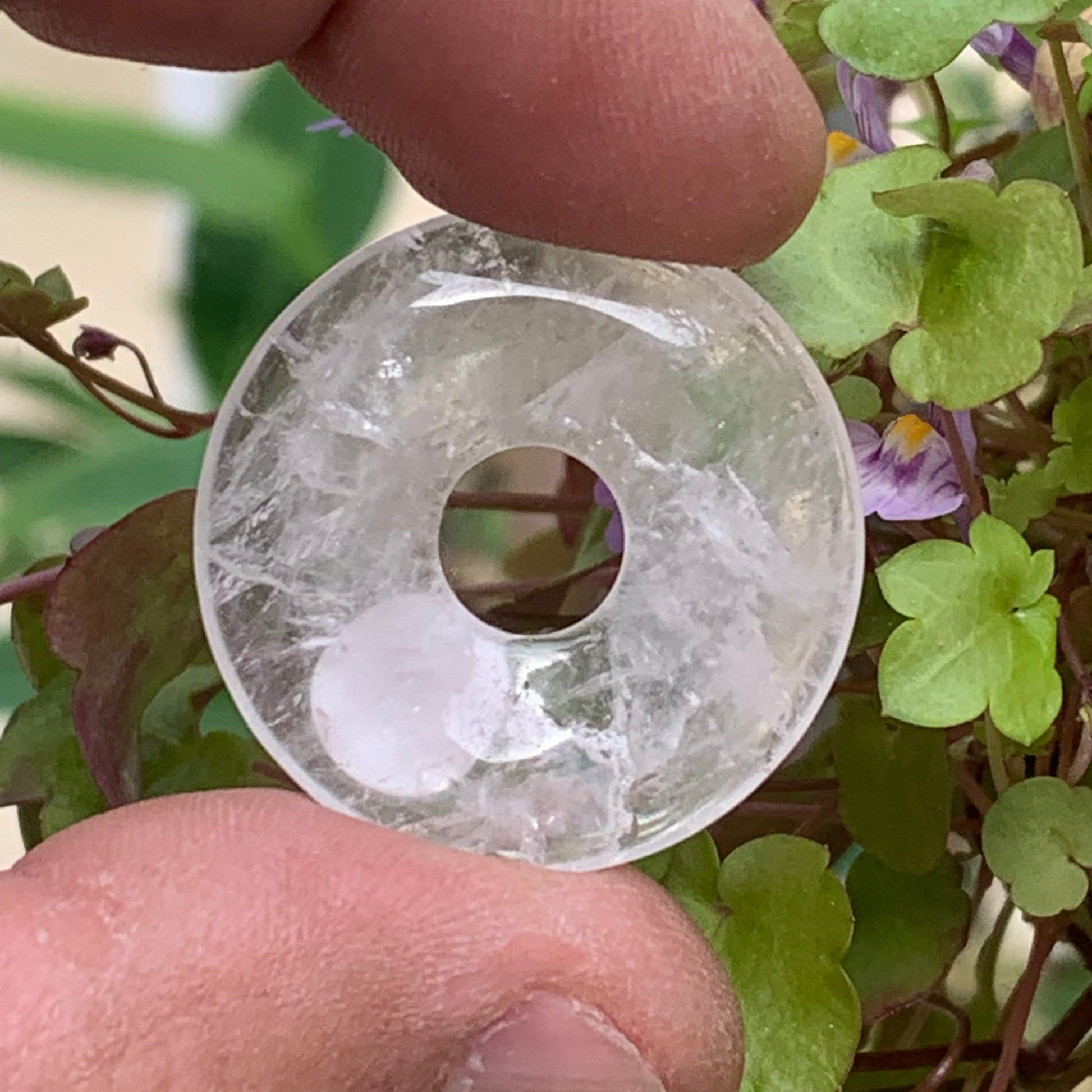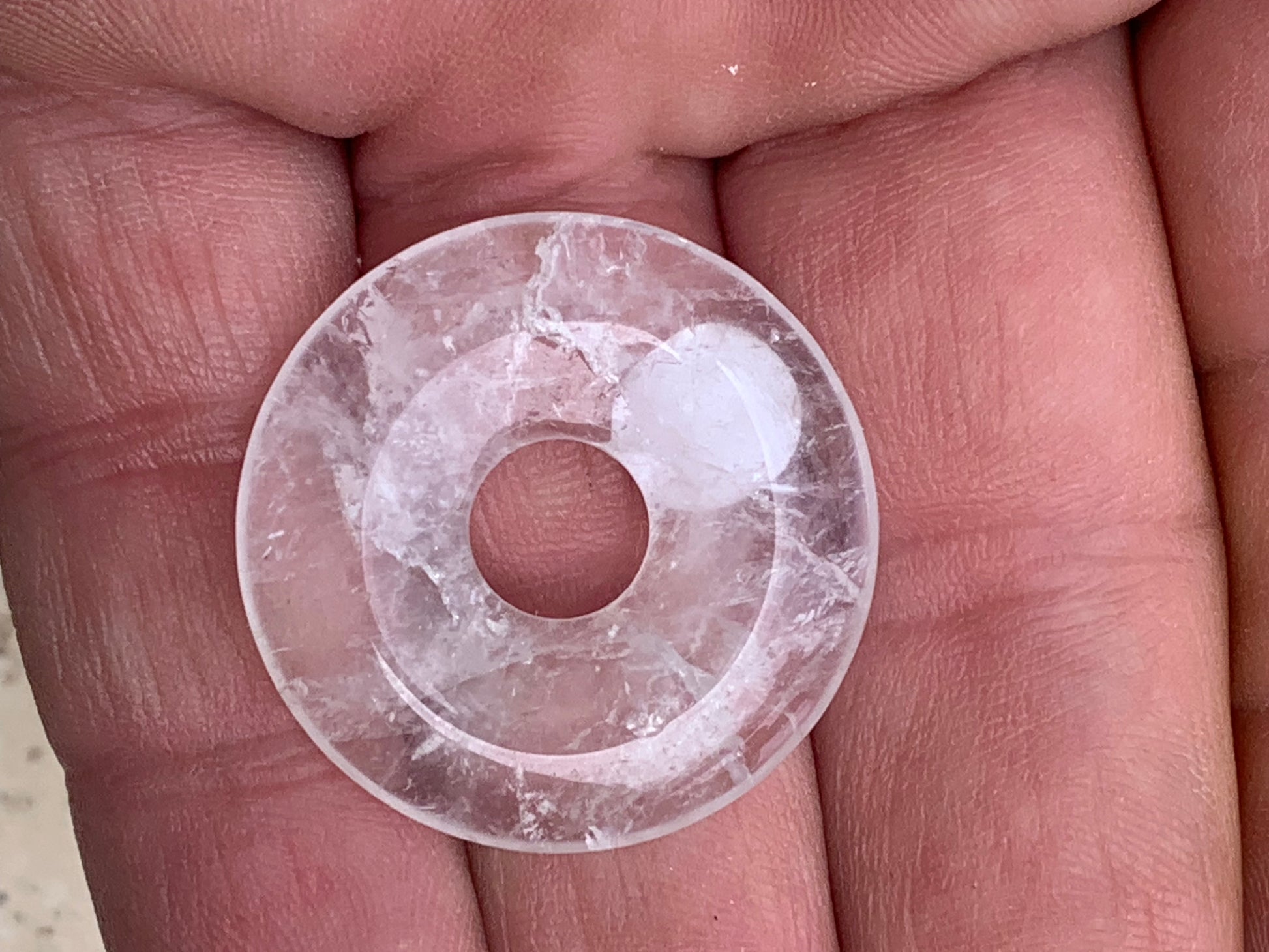 Cristal de roche/ Quartz, pendentif Donuts, 30mm de hauteur x 30 de largeur x 6 d'épaisseur. Vendu avec cordon réglable de couleur noire !