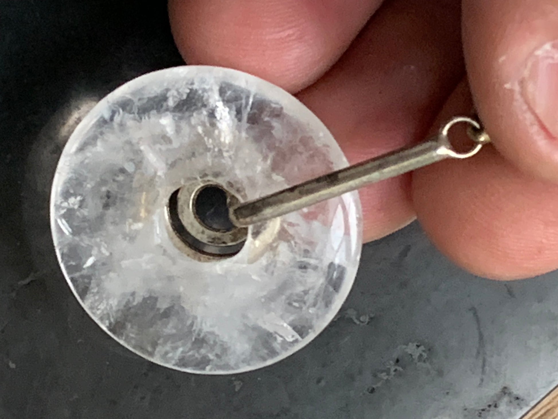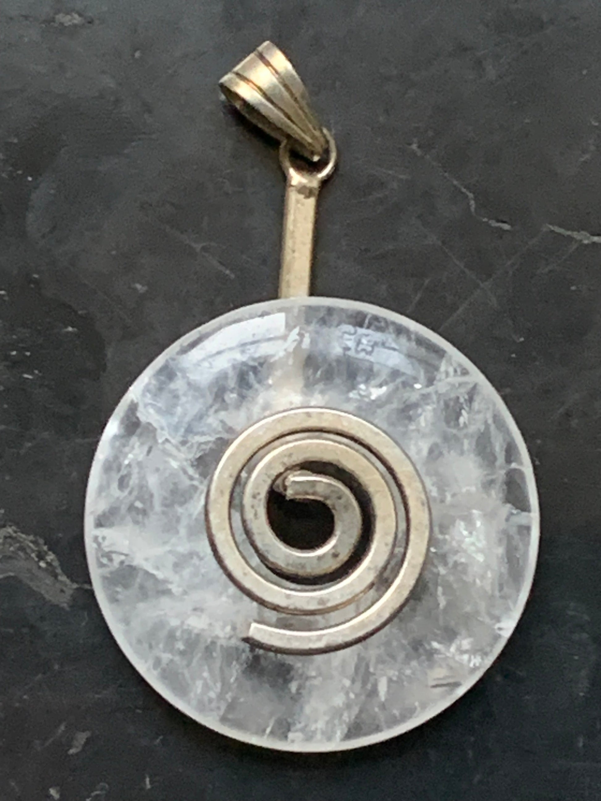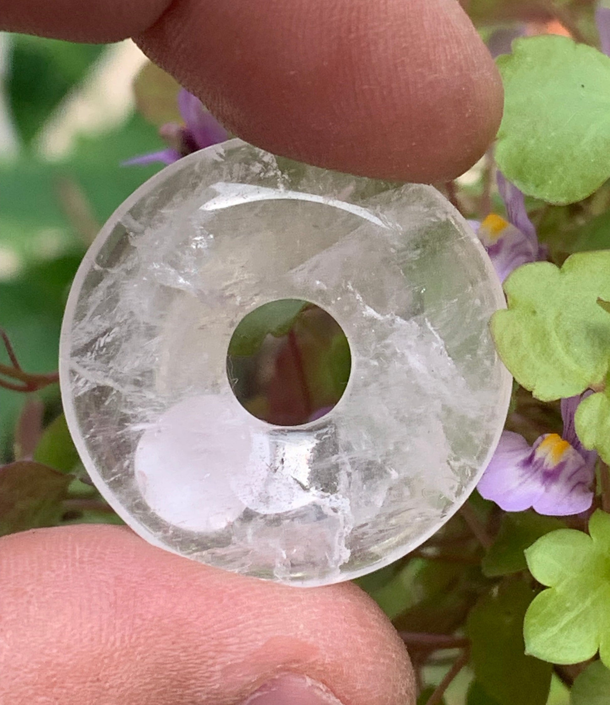 Cristal de roche/ Quartz, pendentif Donuts, 30mm de hauteur x 30 de largeur x 6 d'épaisseur. Vendu avec cordon réglable de couleur noire !
