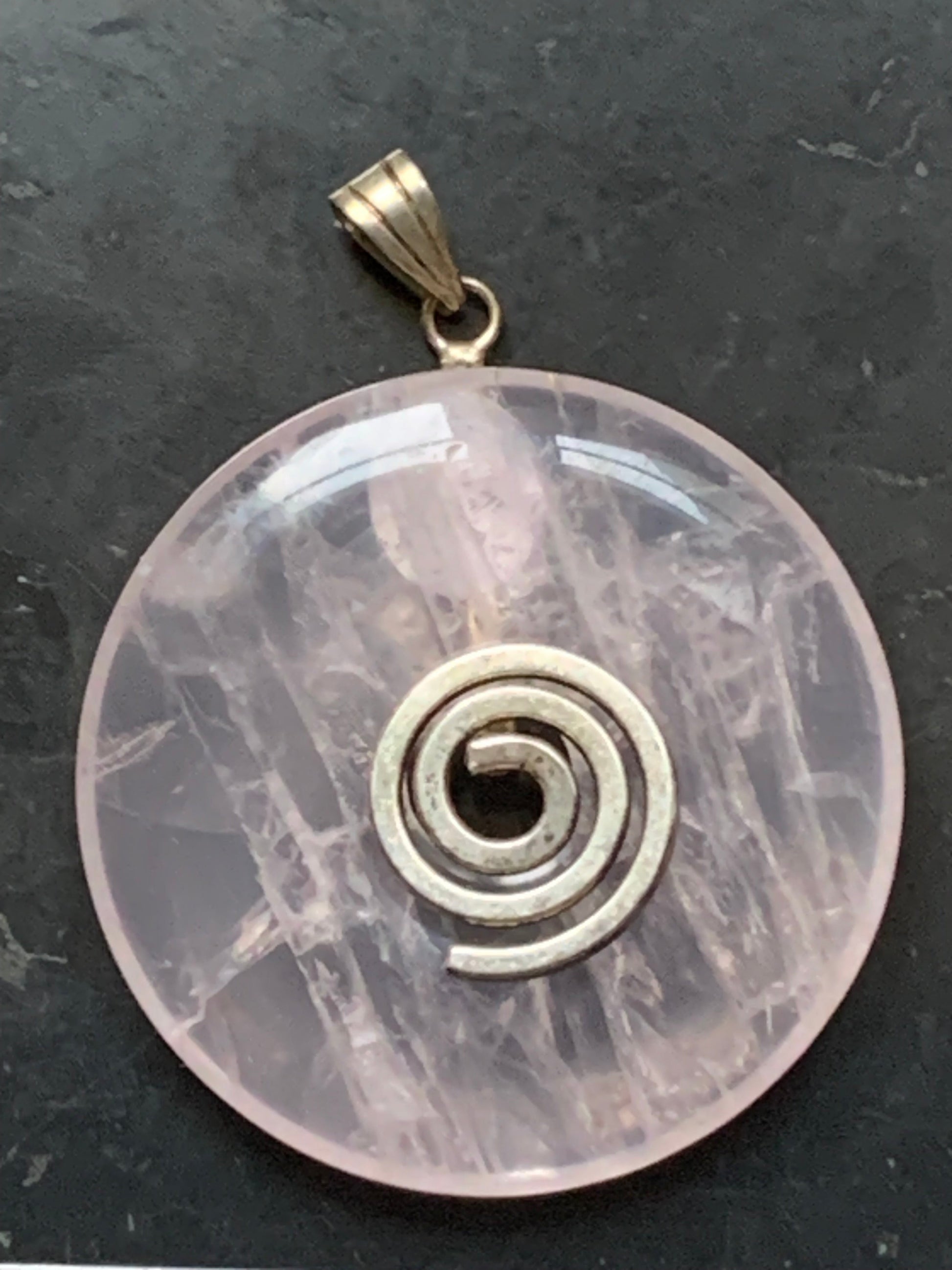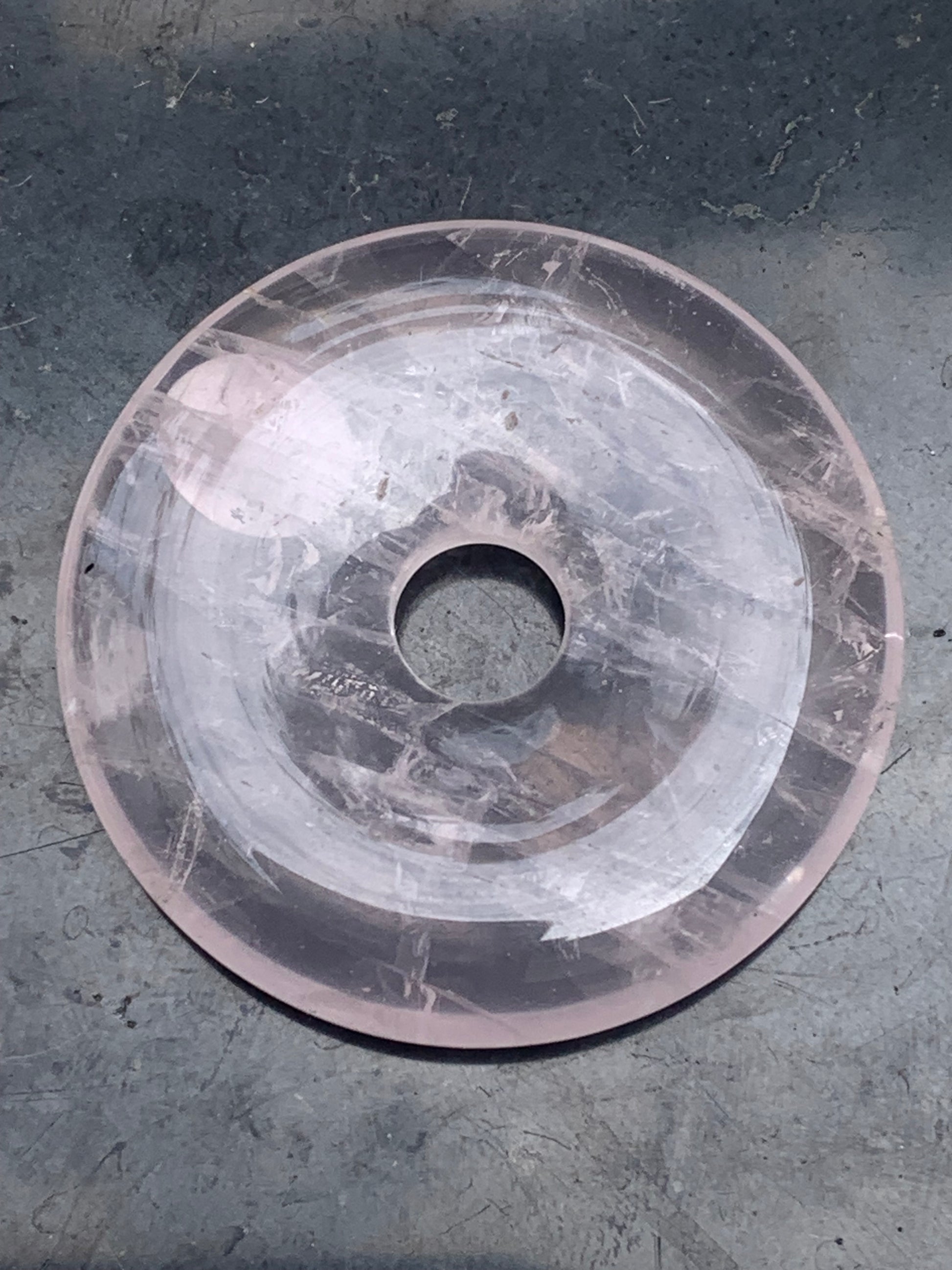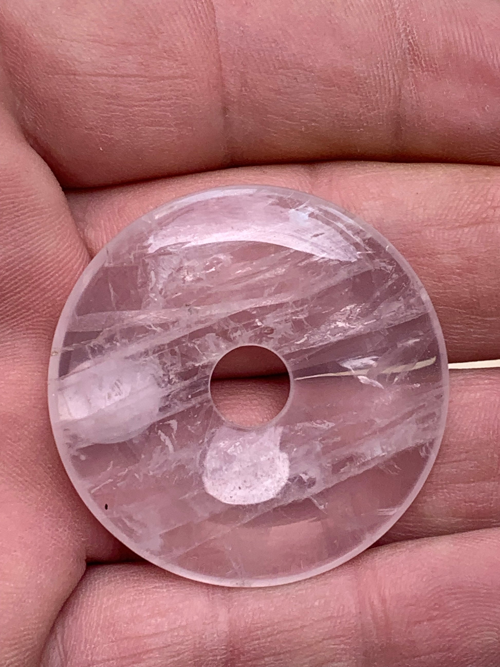 Cristal de roche/ Quartz rose, pendentif Donuts, 40mm de hauteur x 40 de largeur x 7 d'épaisseur. Vendu avec cordon réglable de couleur noire !