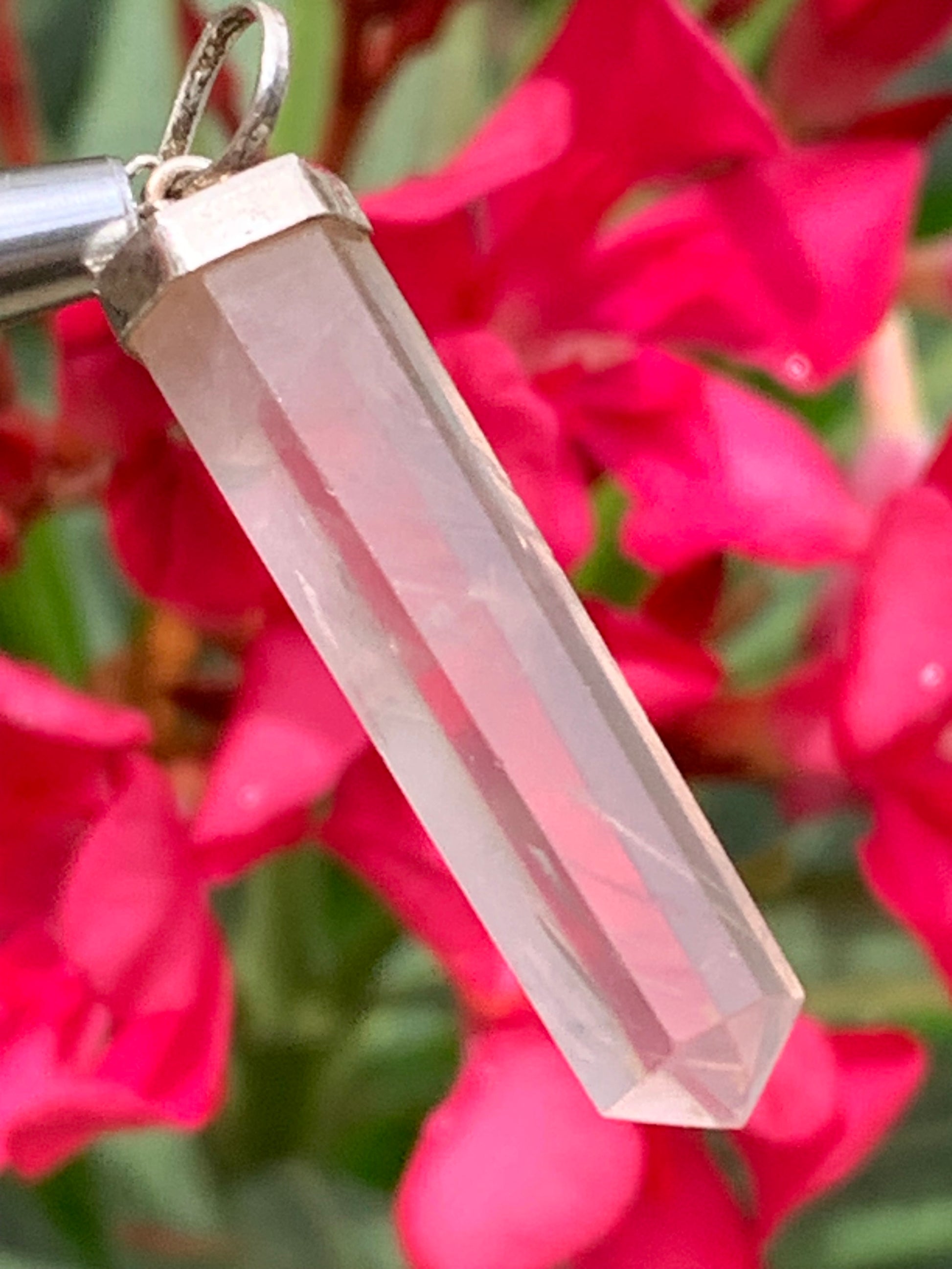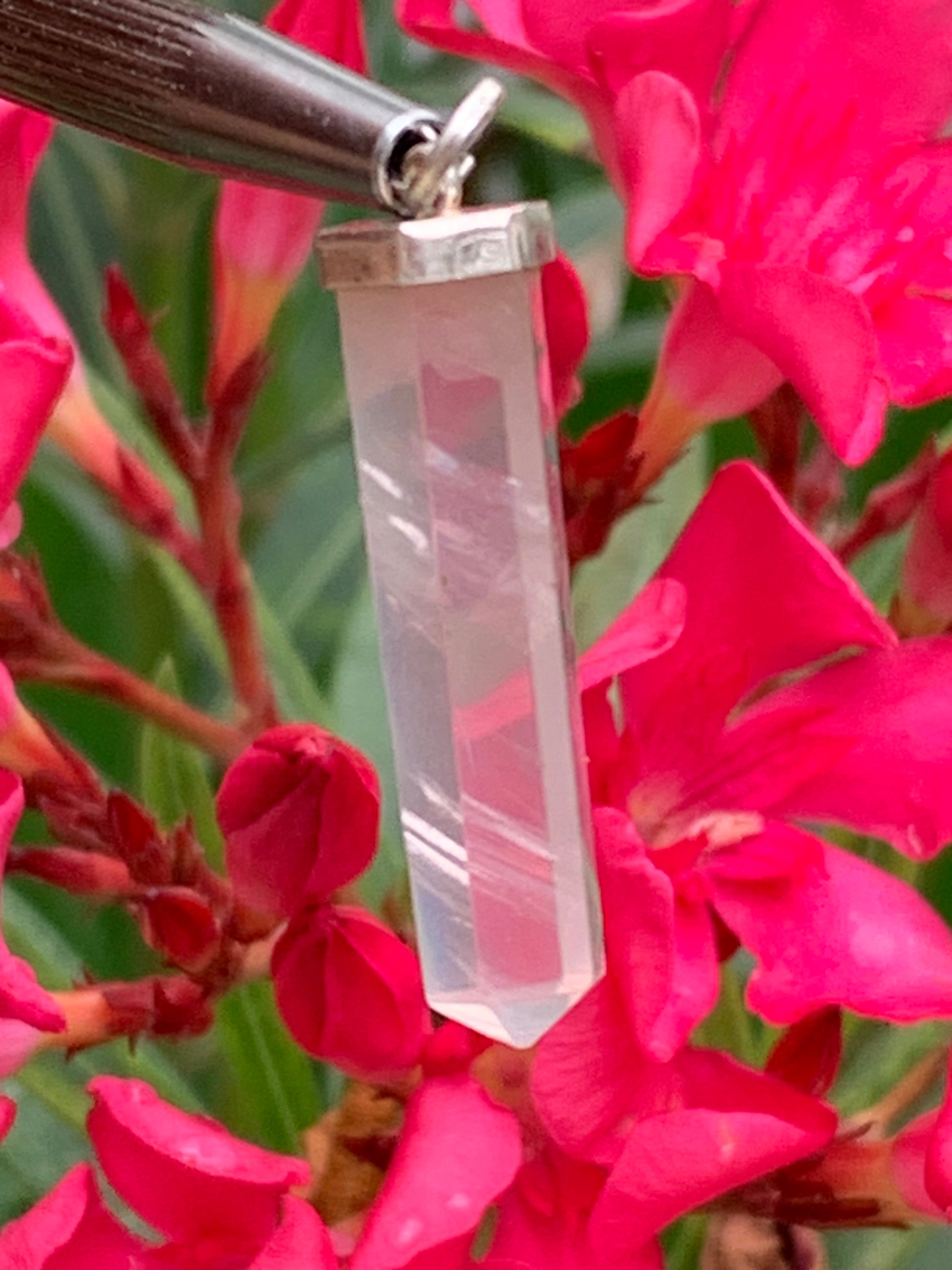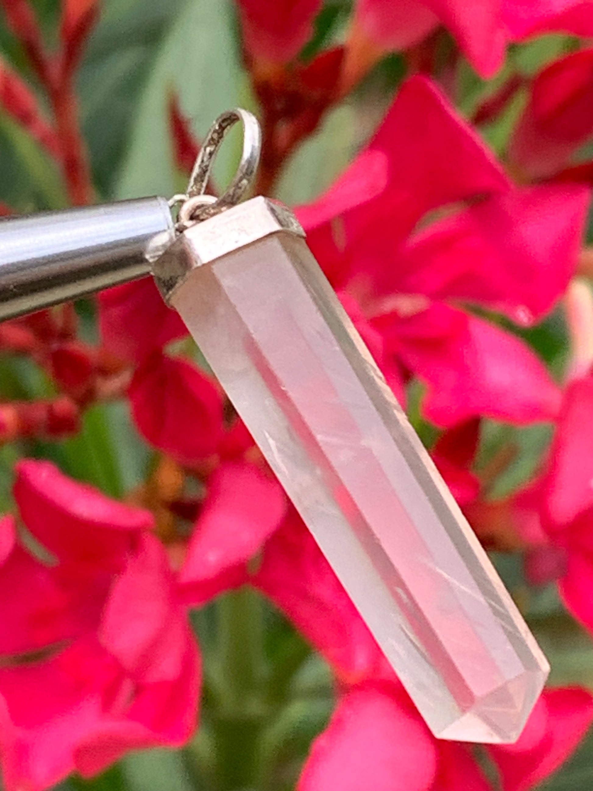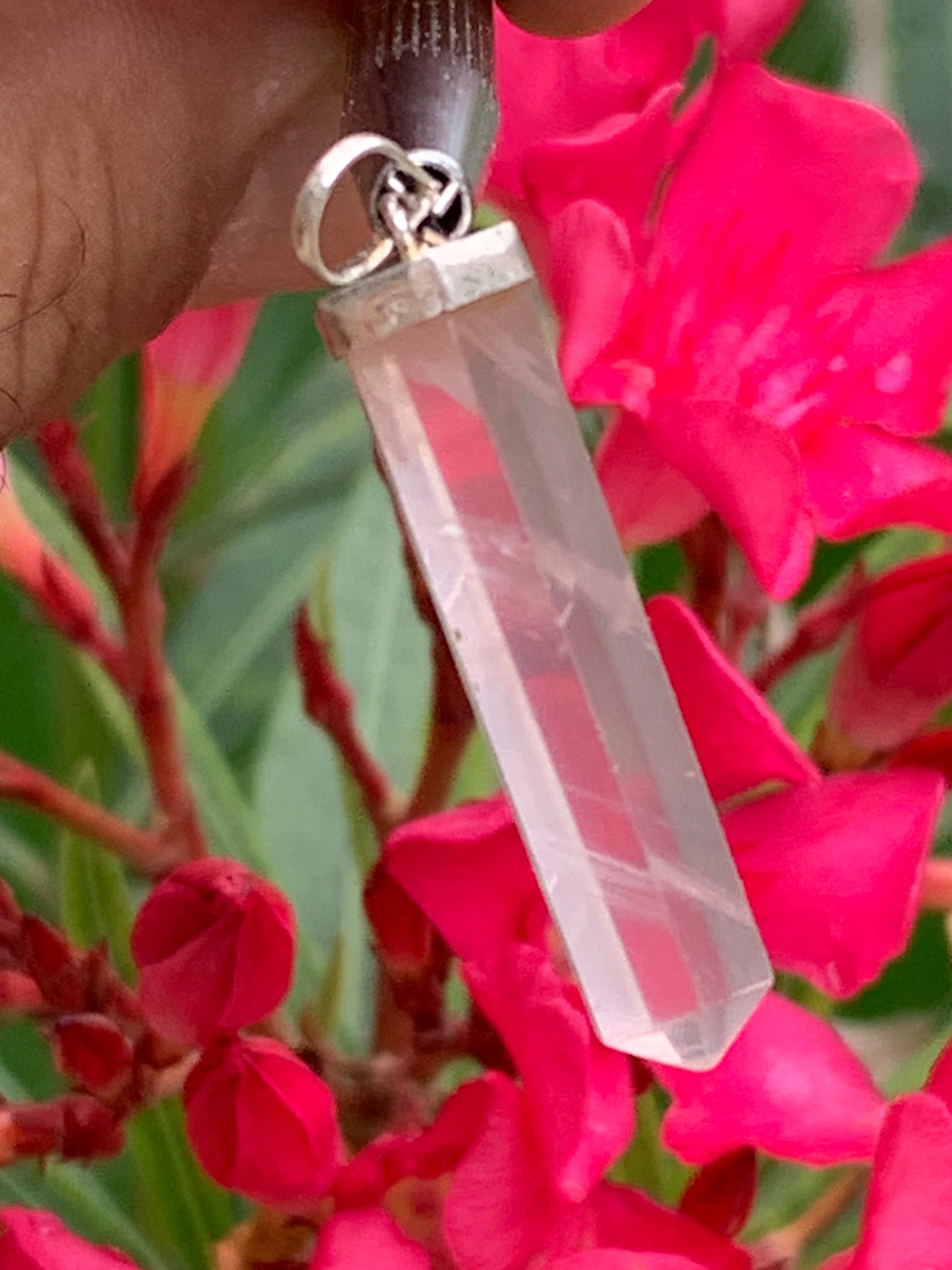 Cristal de roche/ Quartz rose ! Pendentif pointe/ laser en Argent, de 42mm de hauteur x 8 de diamètre. Vendu avec cordon réglable de couleur noire !