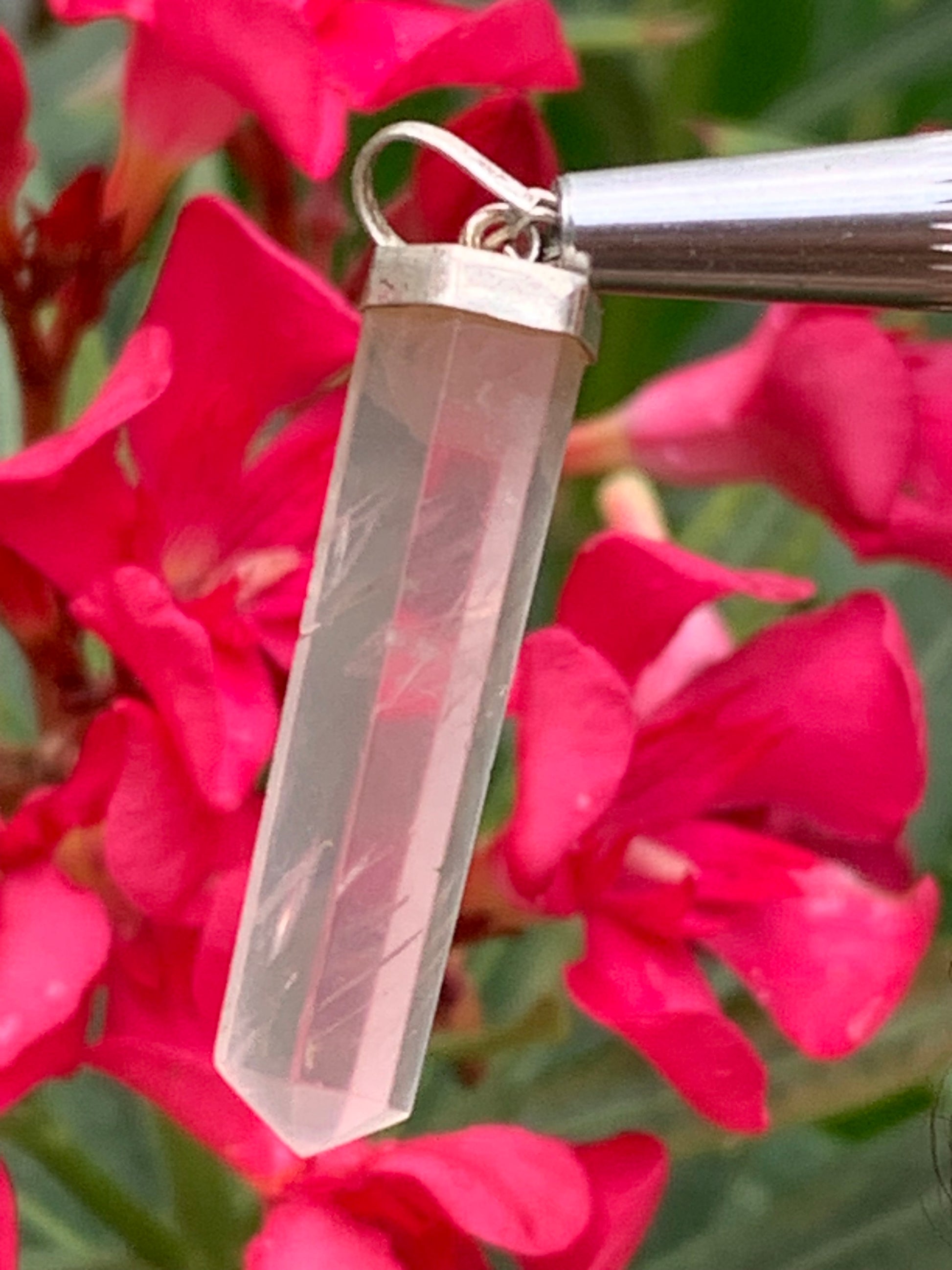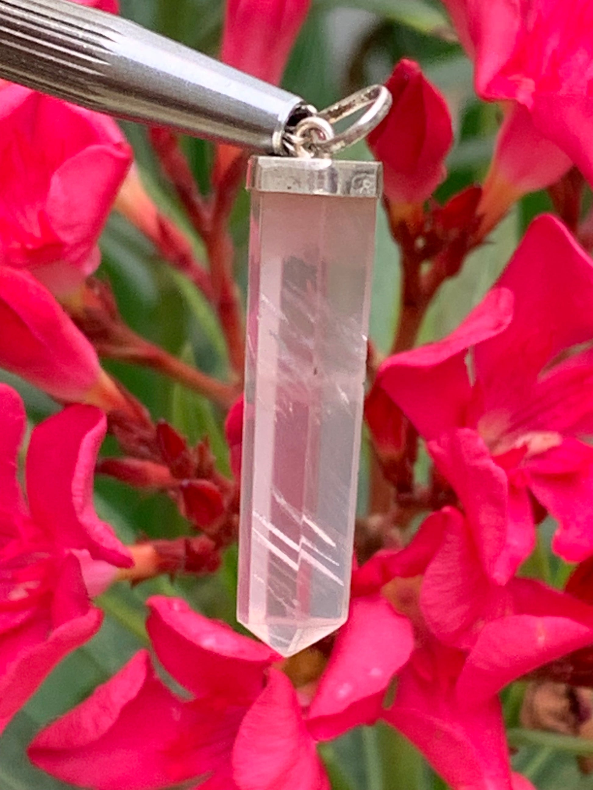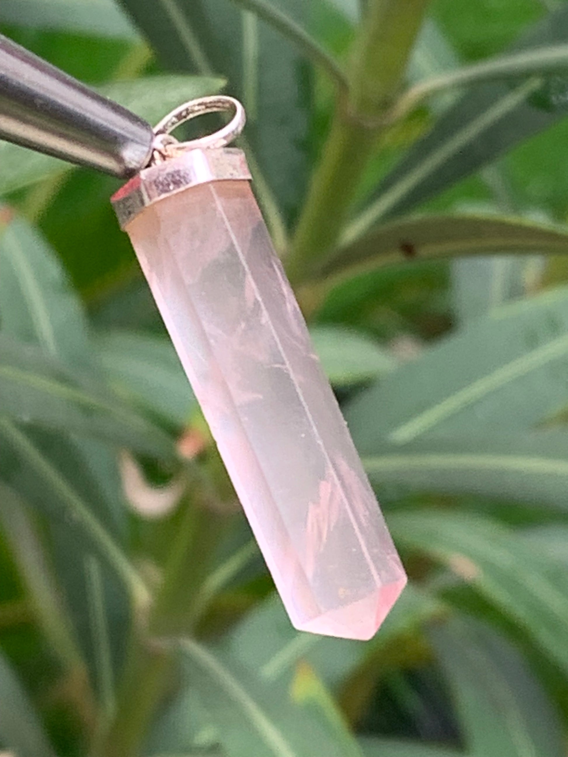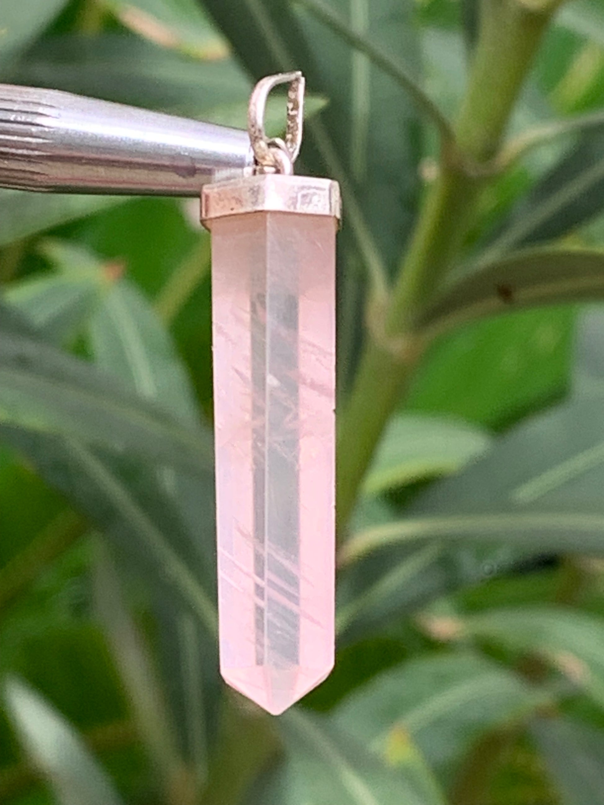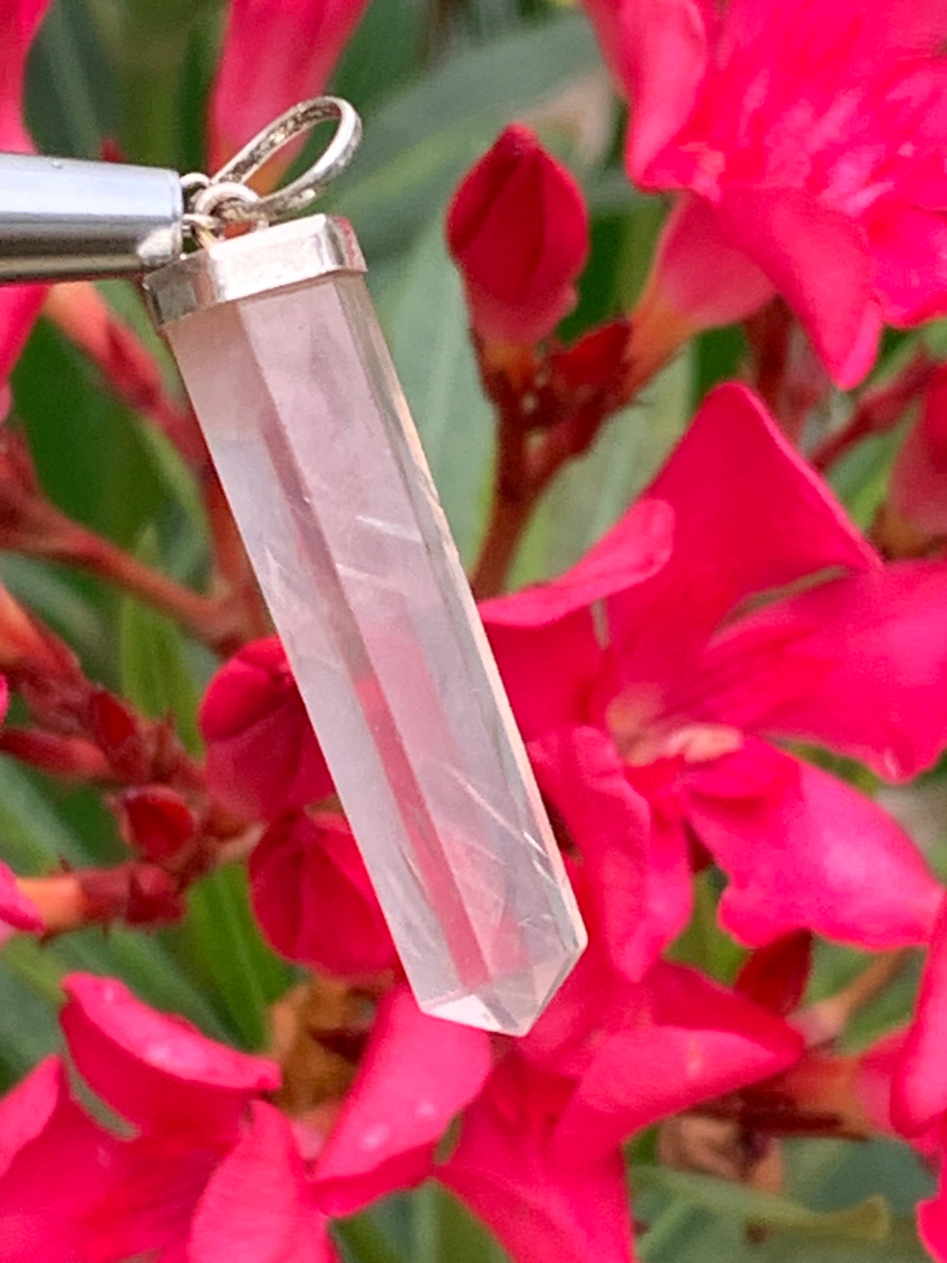 Cristal de roche/ Quartz rose ! Pendentif pointe/ laser en Argent, de 42mm de hauteur x 8 de diamètre. Vendu avec cordon réglable de couleur noire !