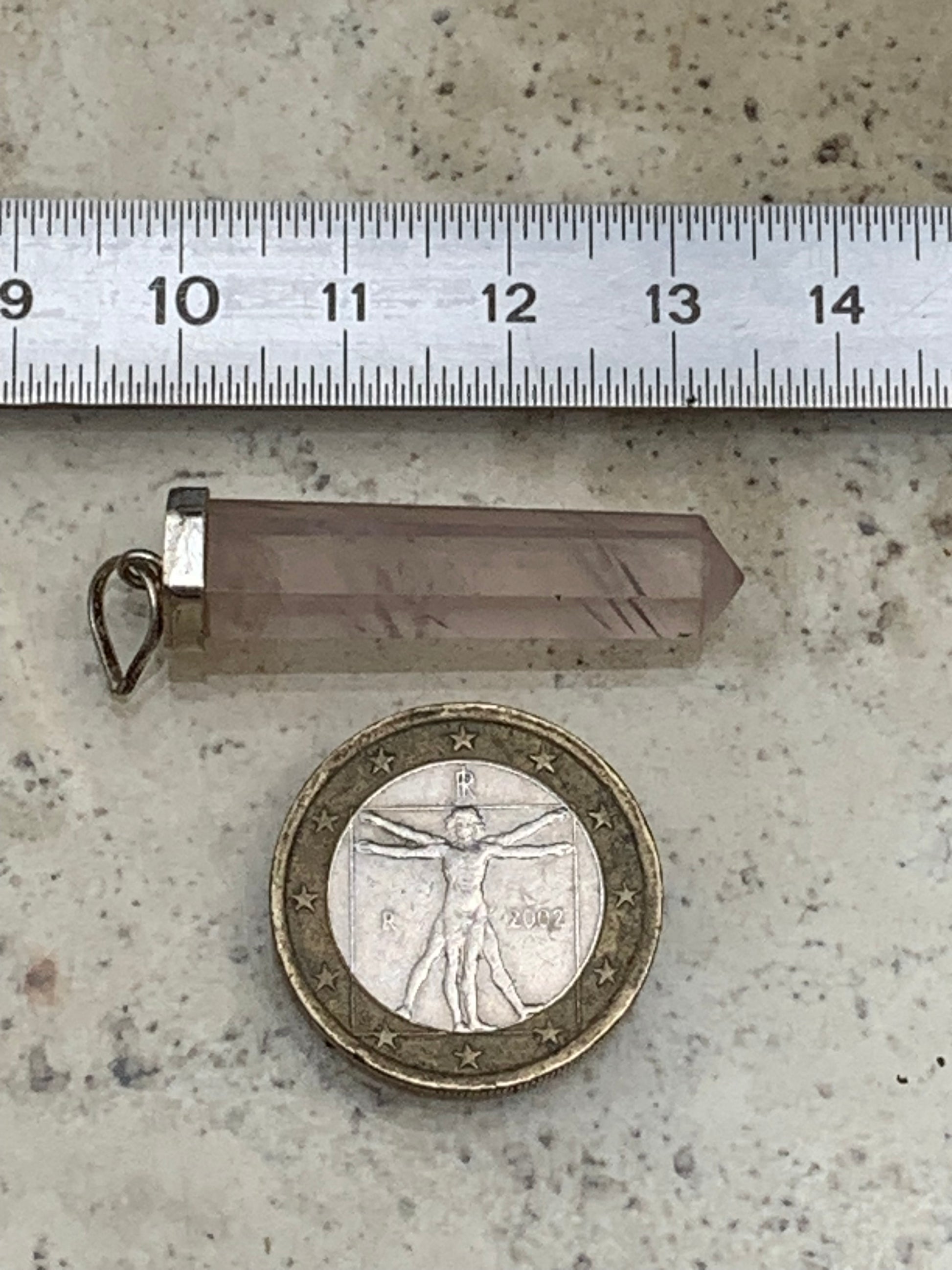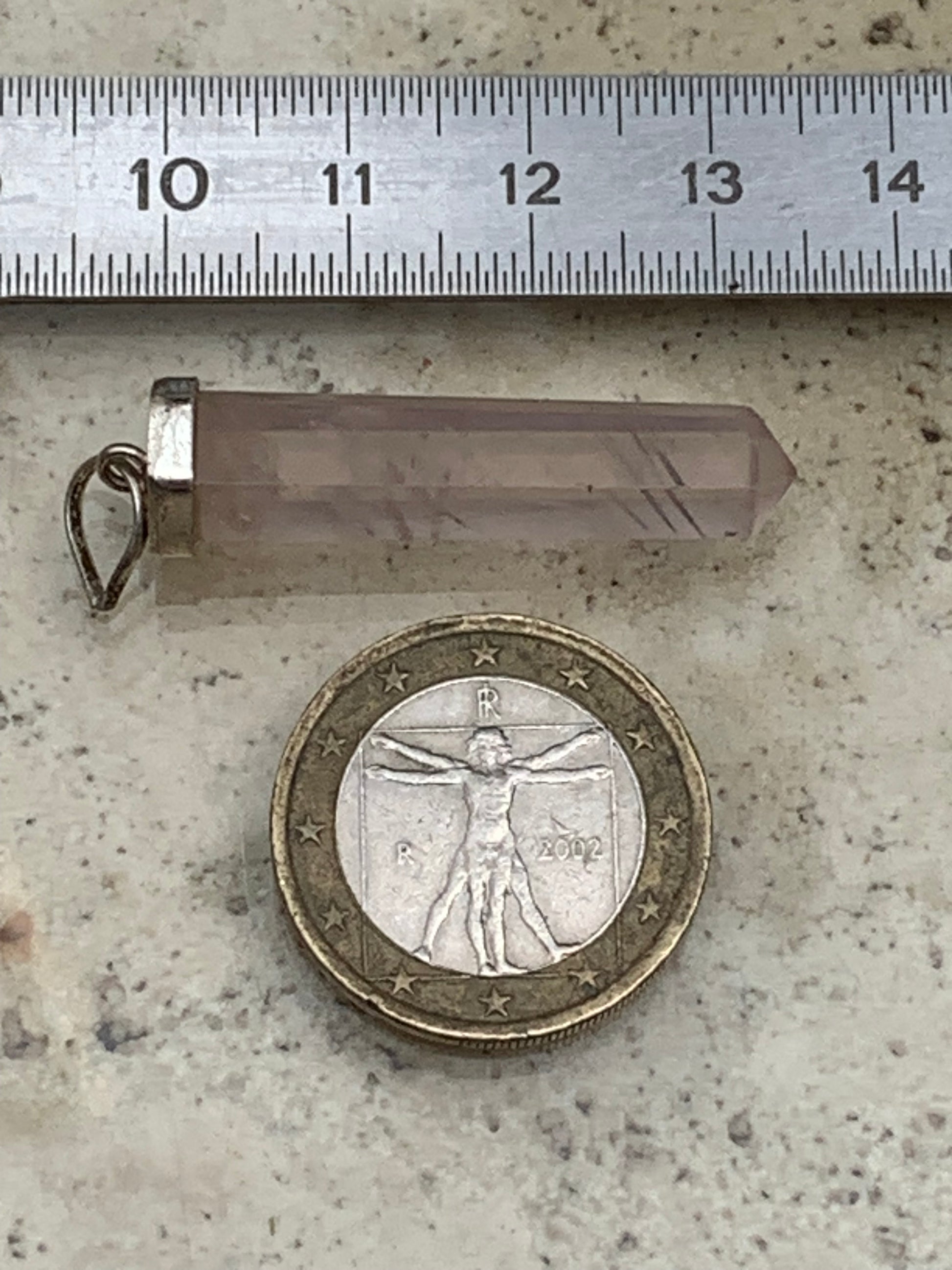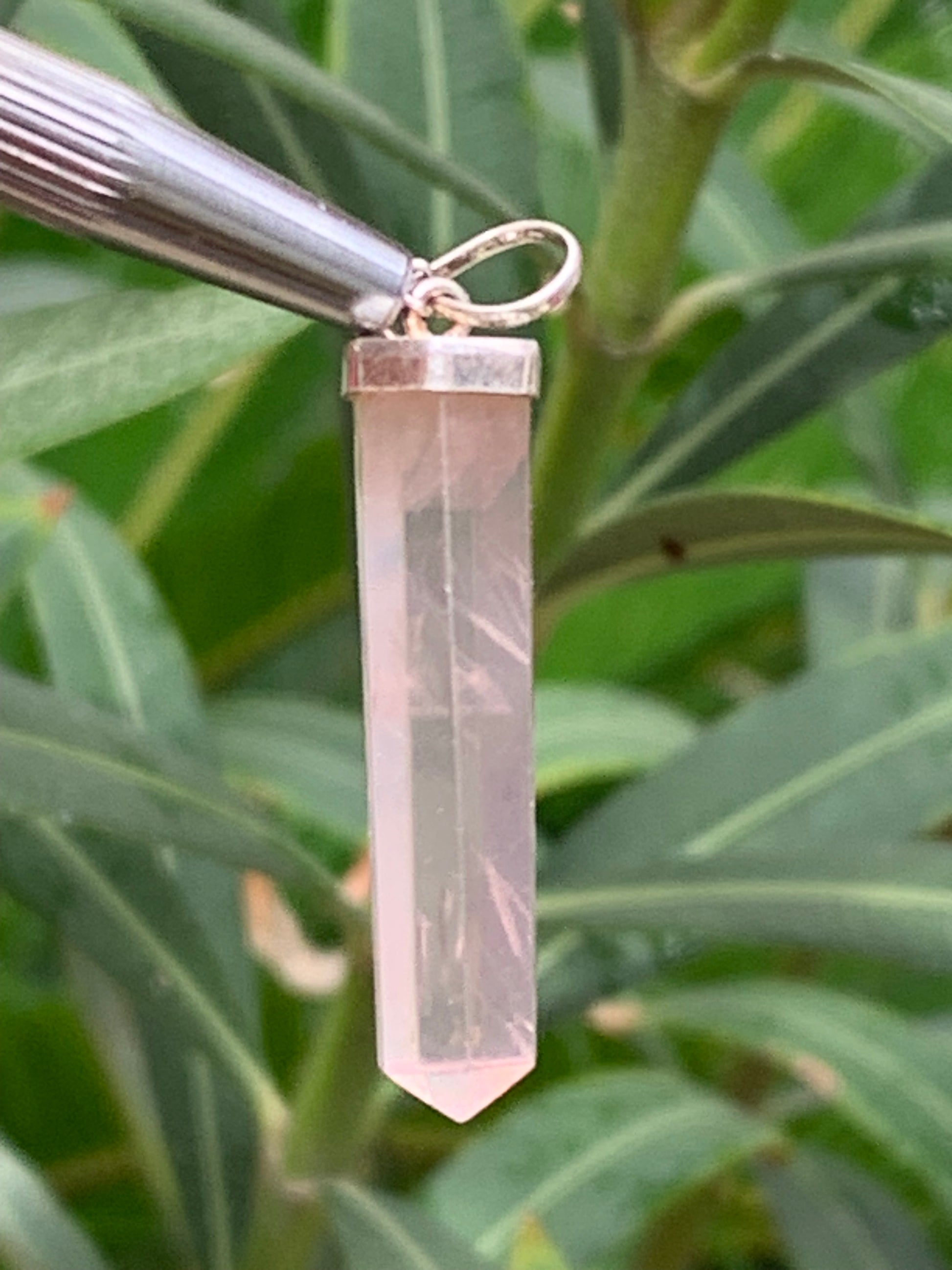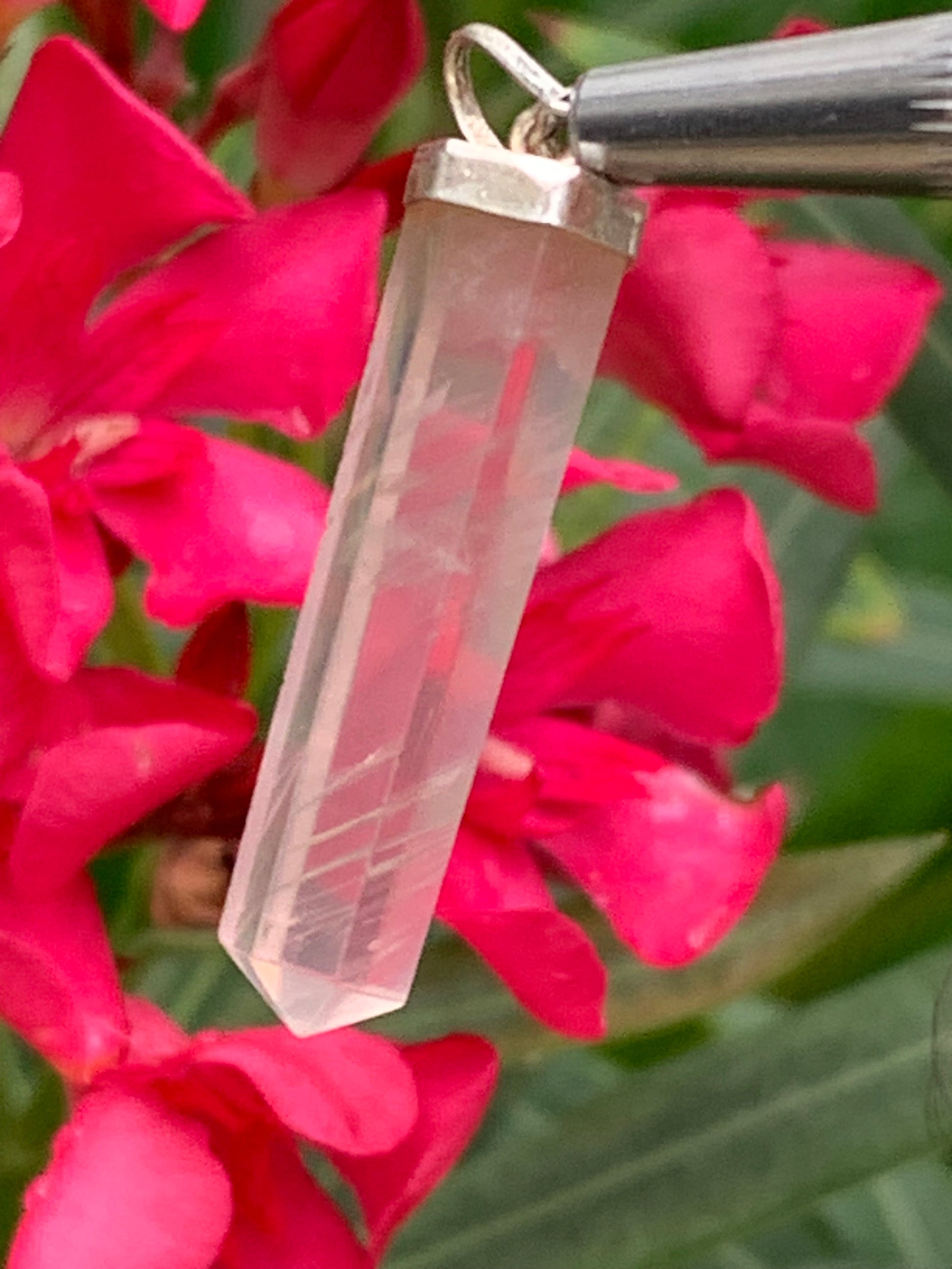 Cristal de roche/ Quartz rose ! Pendentif pointe/ laser en Argent, de 42mm de hauteur x 8 de diamètre. Vendu avec cordon réglable de couleur noire !