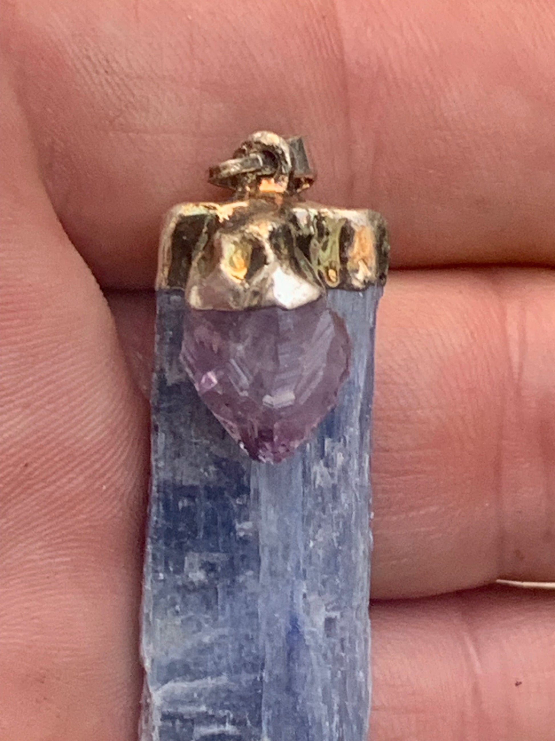 Cyanite disthène + Améthyste, pendentif de 65 millimètres x15x14. Vendu avec ou sans cordon noir et réglable de 60 cm !