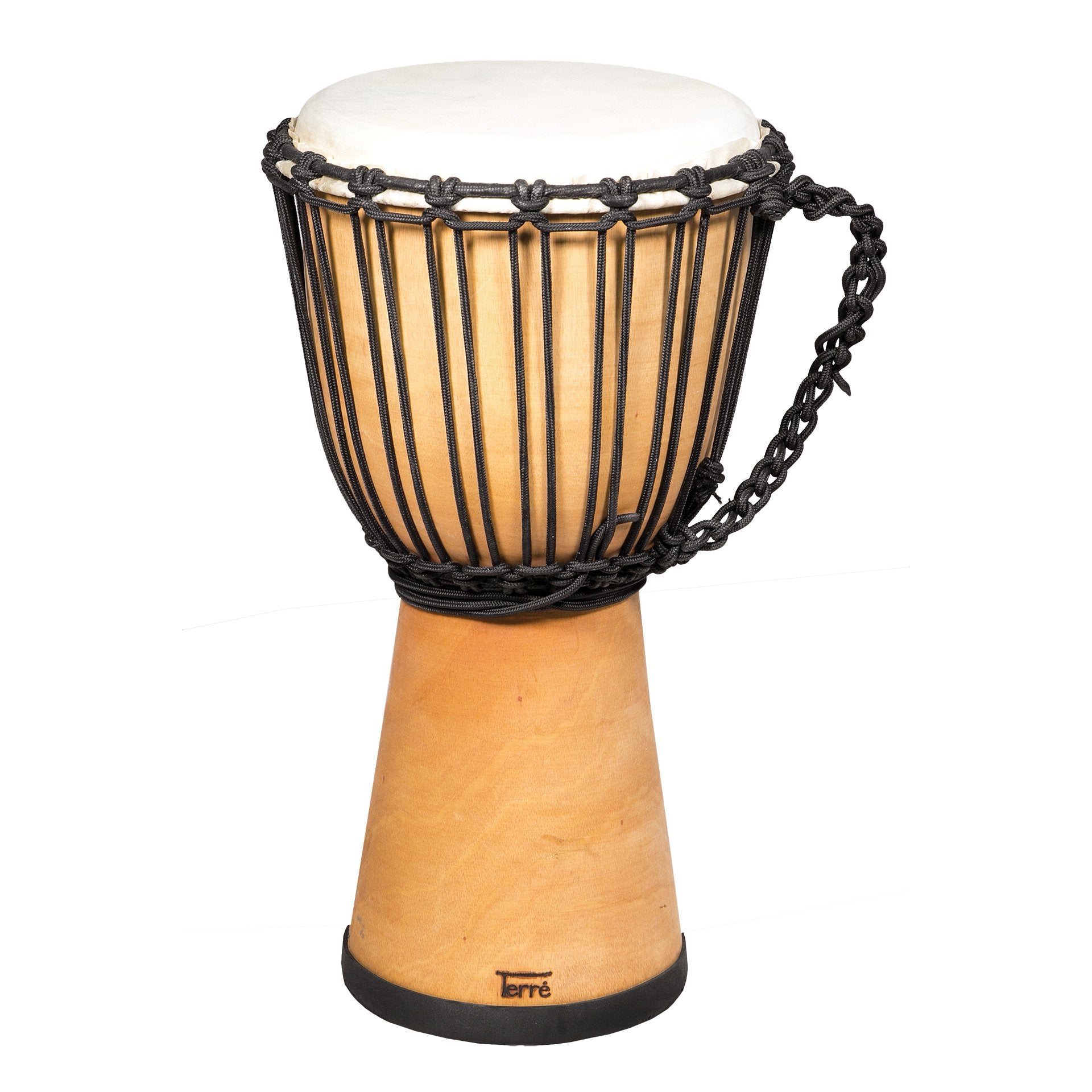 Sur le ventre du tambour se trouvent une poignée de transport tressée et une réserve de cordon de tension. Grâce aux évidements sur la base, le djembé peut également être joué sans inclinaison.