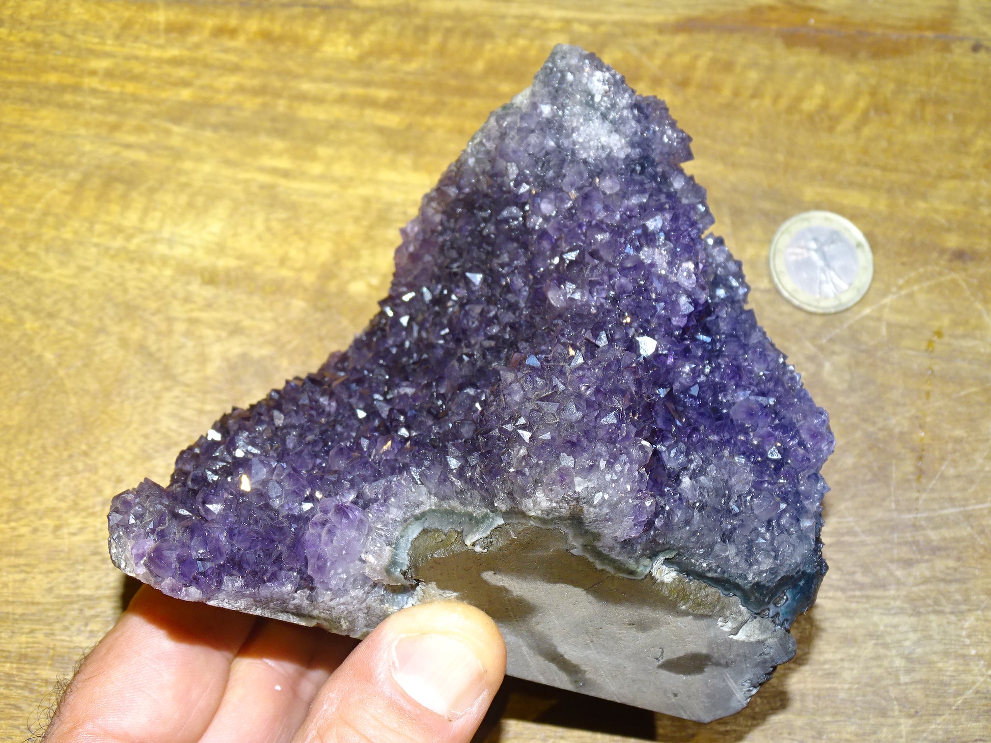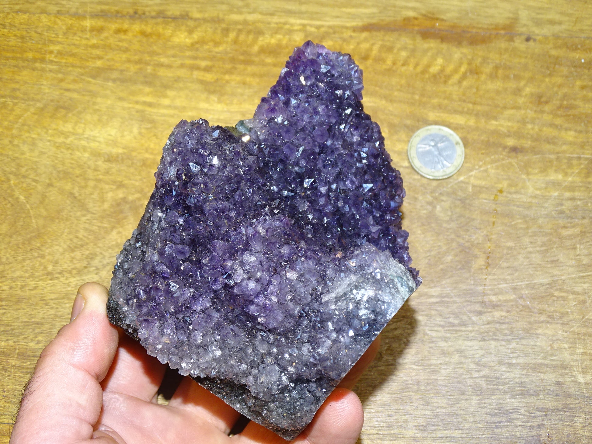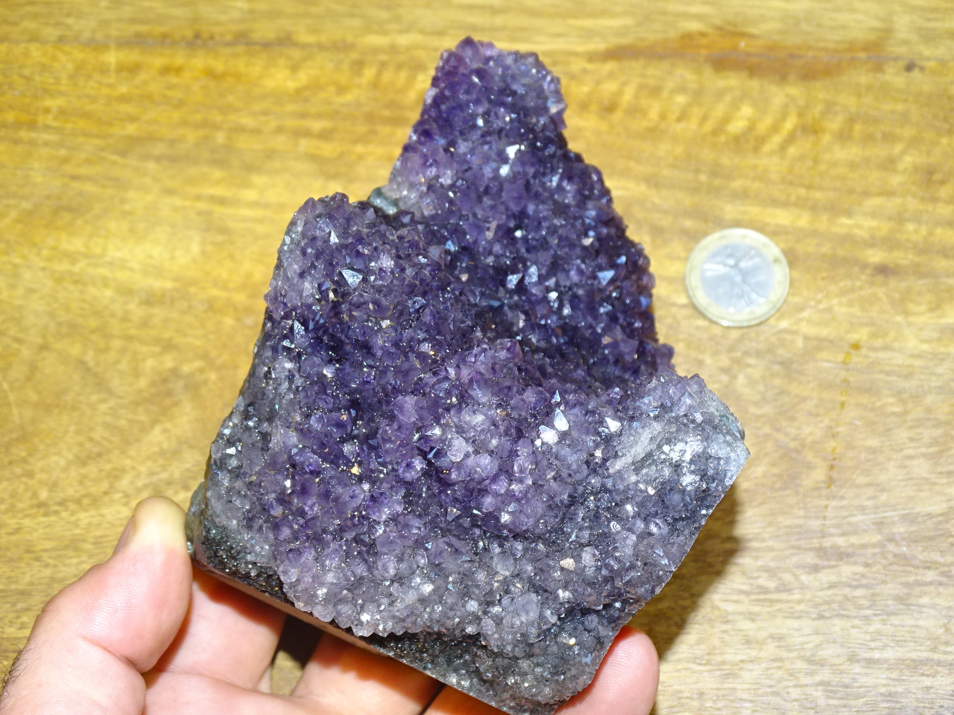 Druse en améthyste de 1,05 kilogramme, 120 x 90 x 90 millimètres. Se tient debout comme un humain... Superbe qualité AA, en provenance du Brésil. Incroyables effets positifs pour vos collections, expositions...parfait !