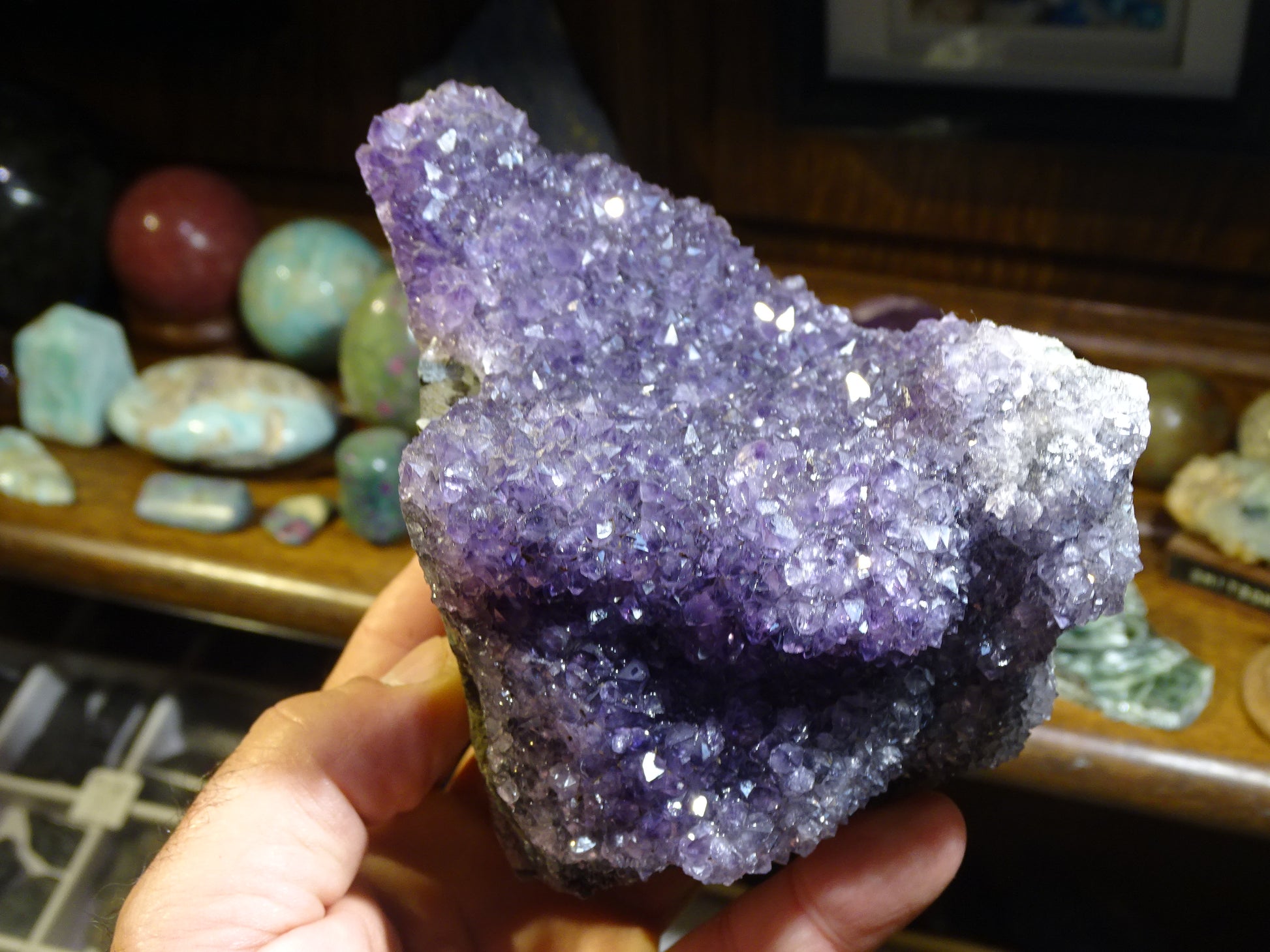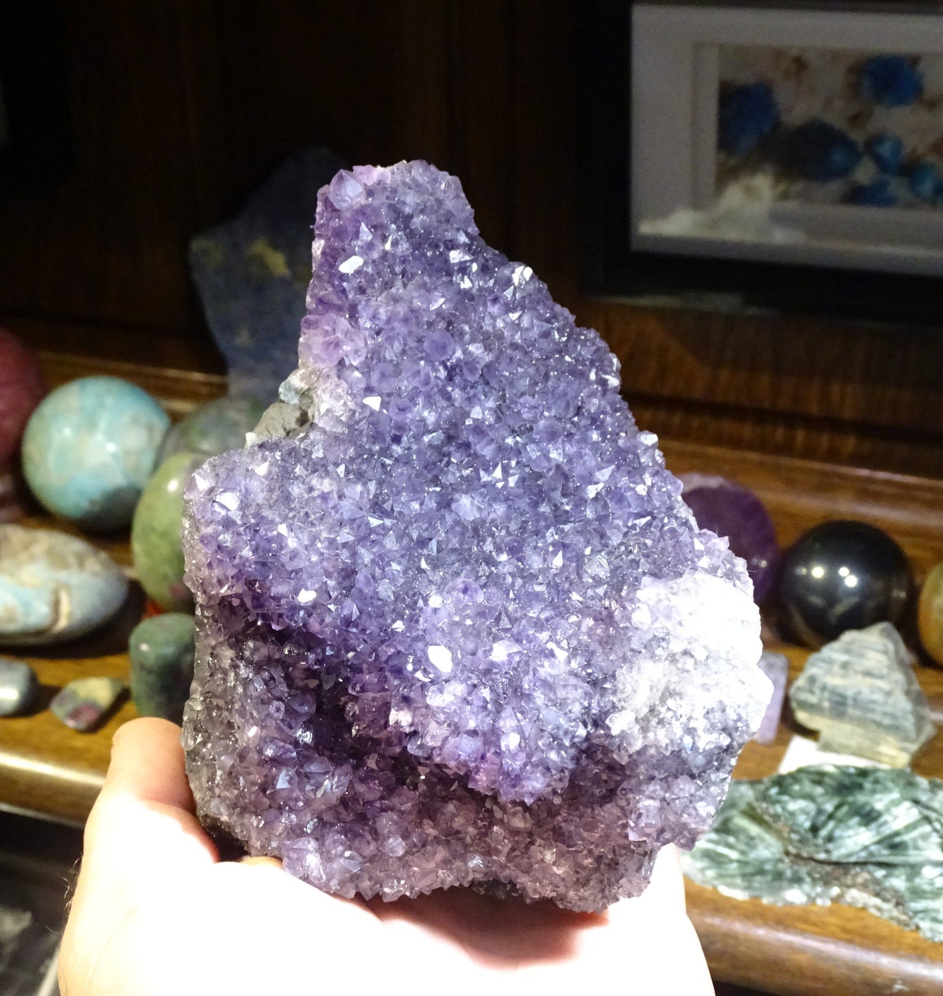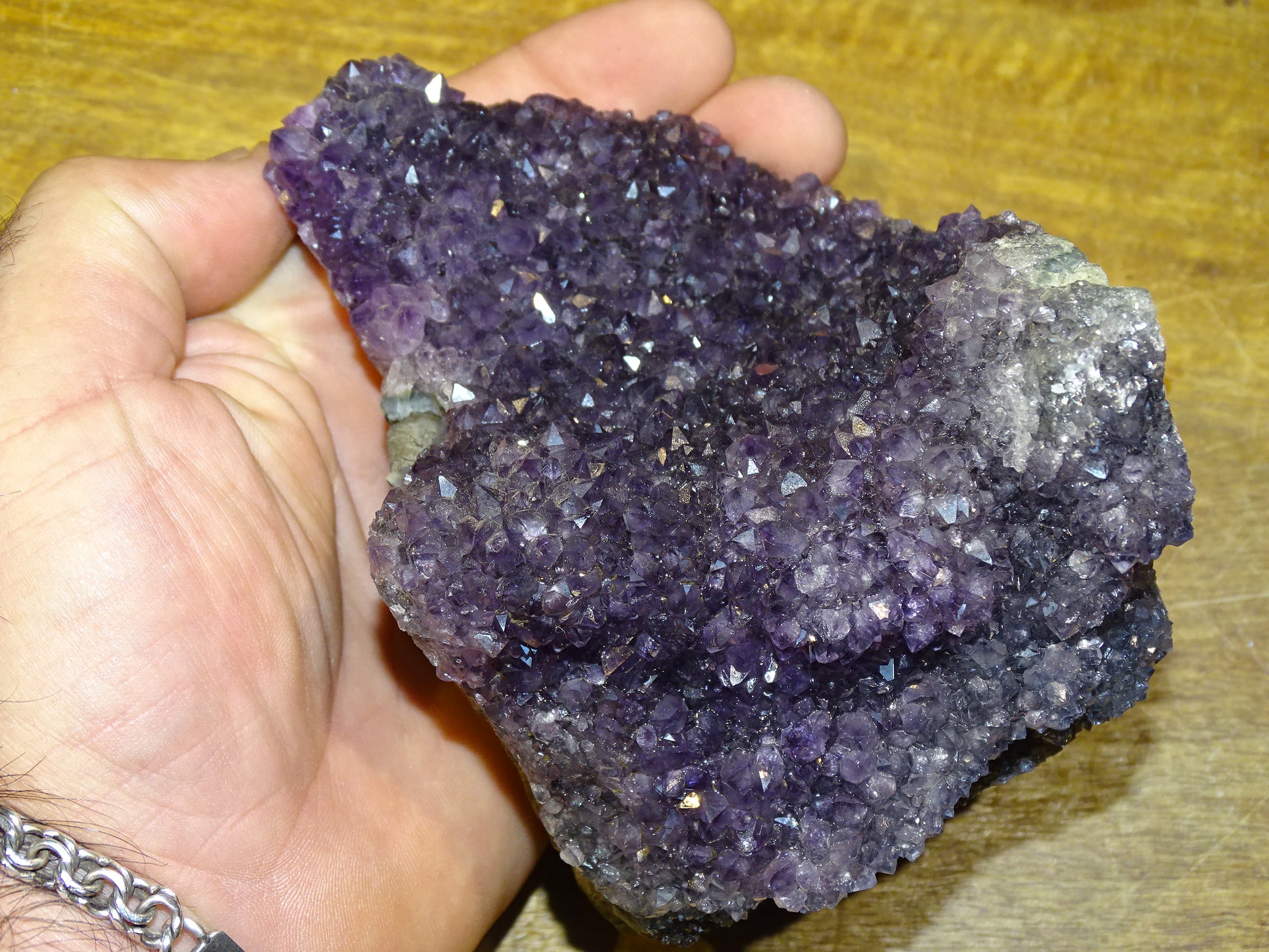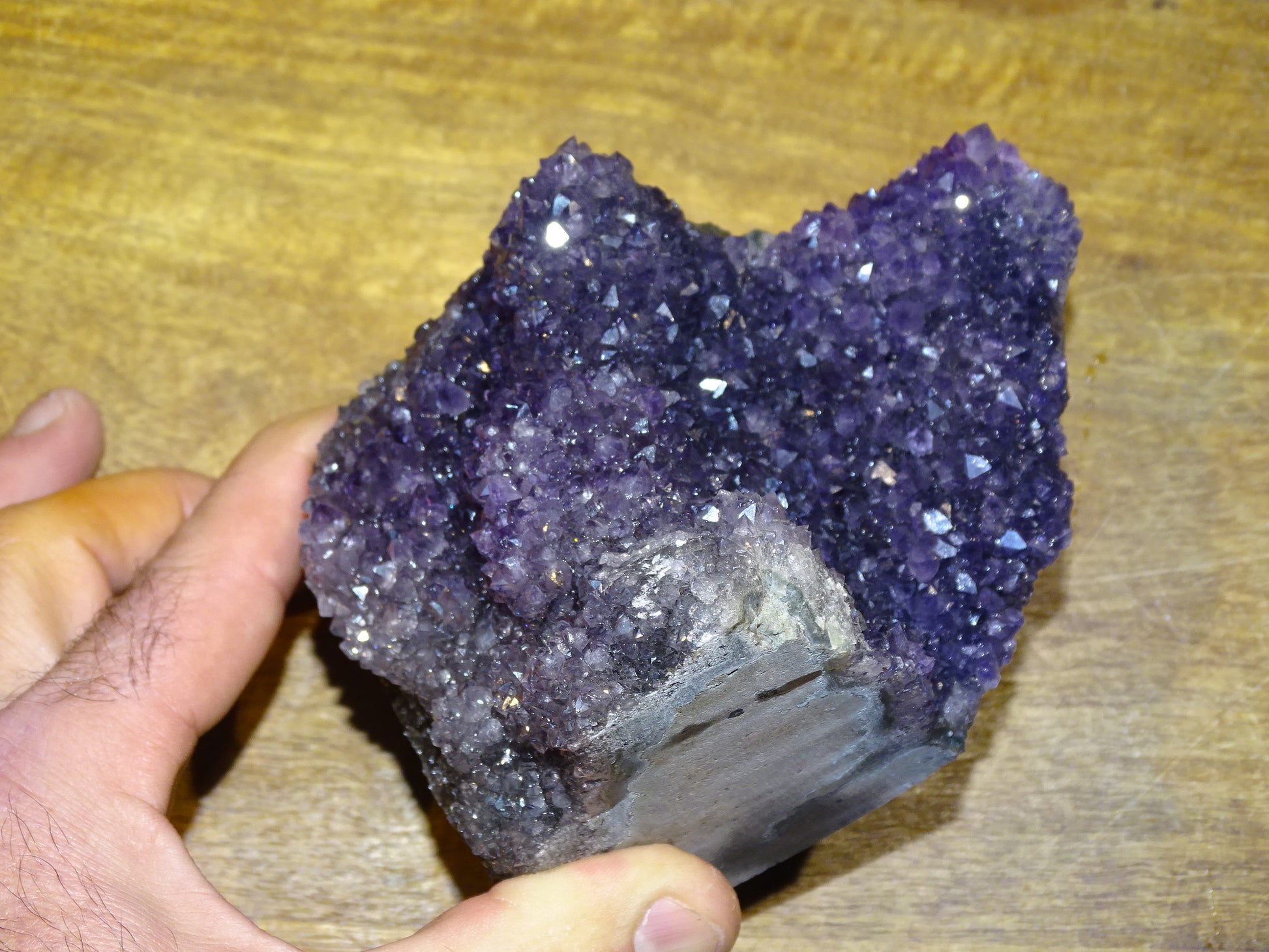Druse en améthyste de 1,05 kilogramme, 120 x 90 x 90 millimètres. Se tient debout comme un humain... Superbe qualité AA, en provenance du Brésil. Incroyables effets positifs pour vos collections, expositions...parfait !