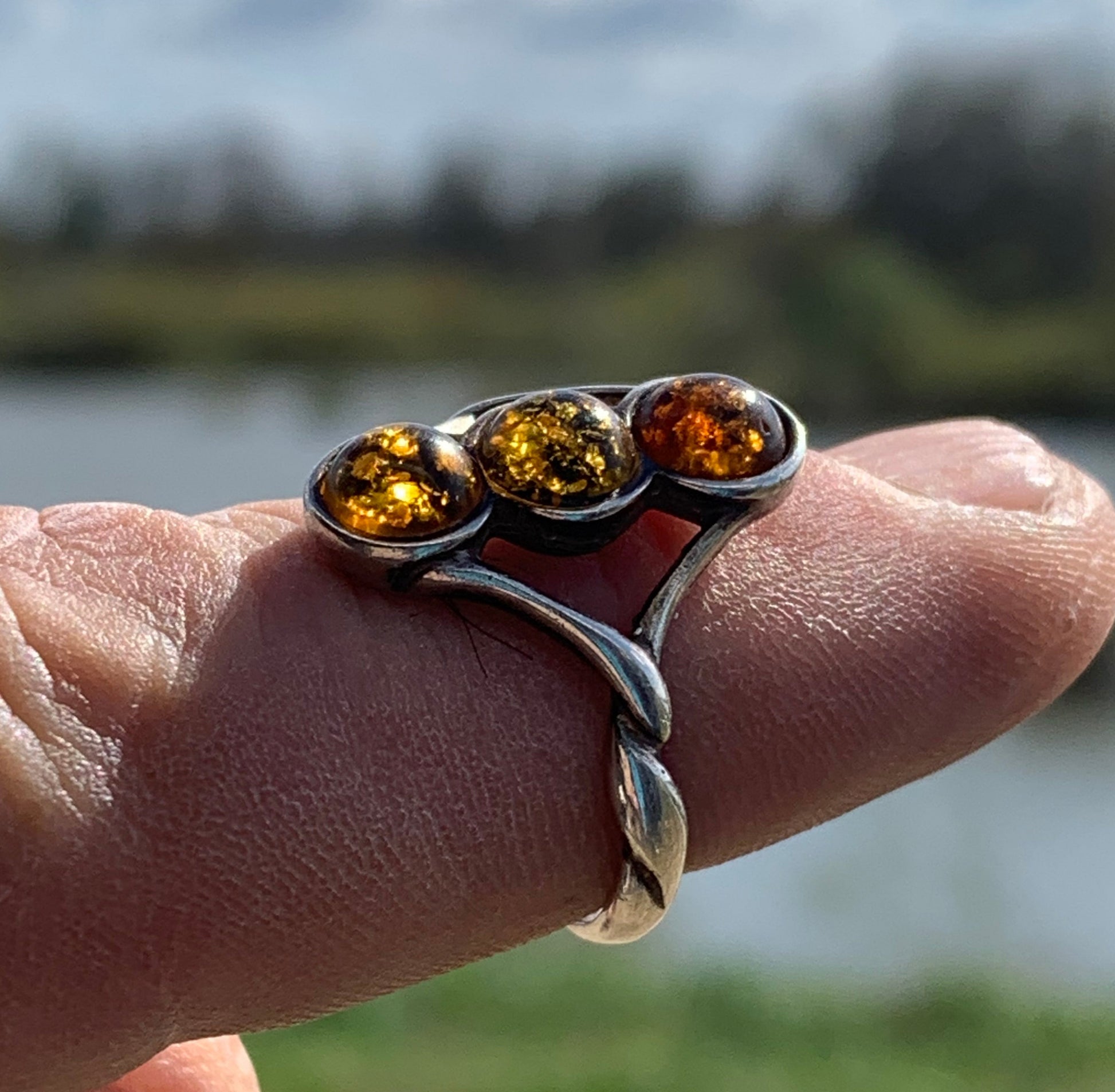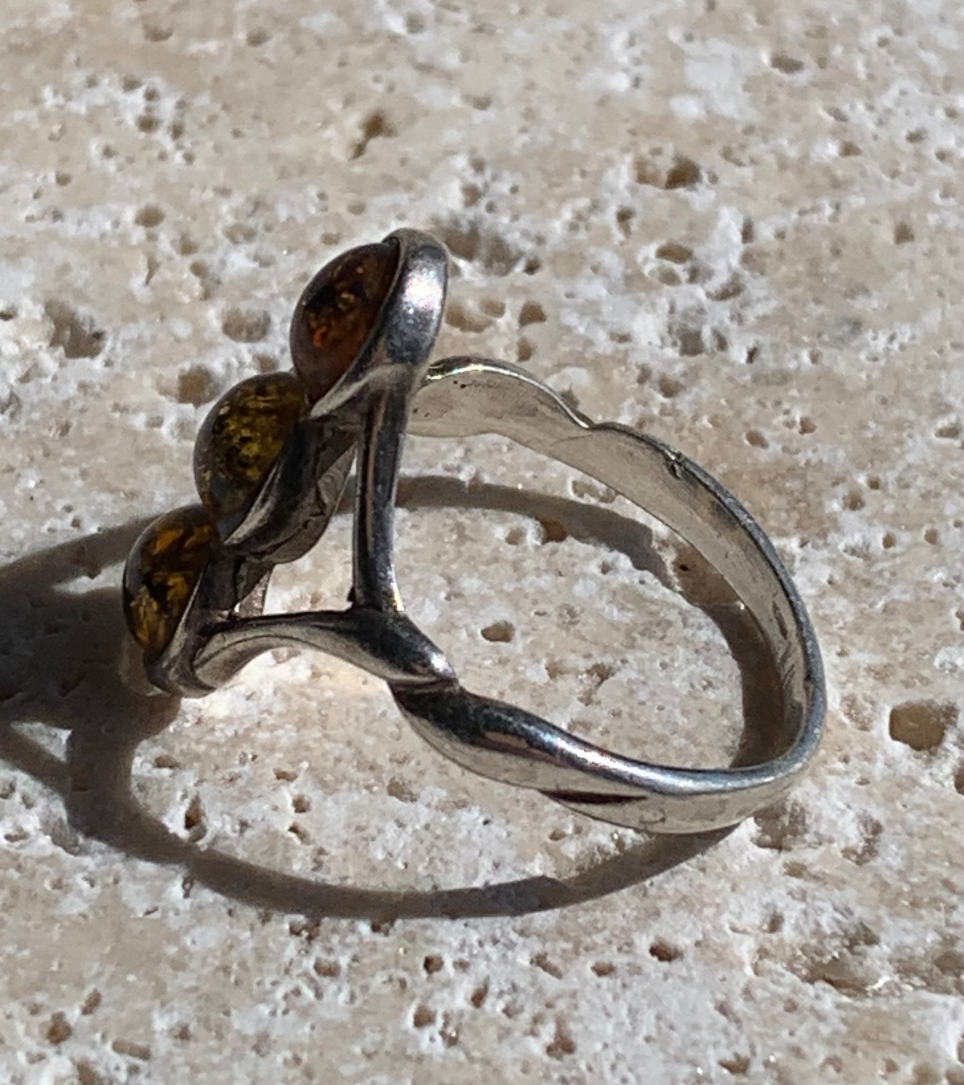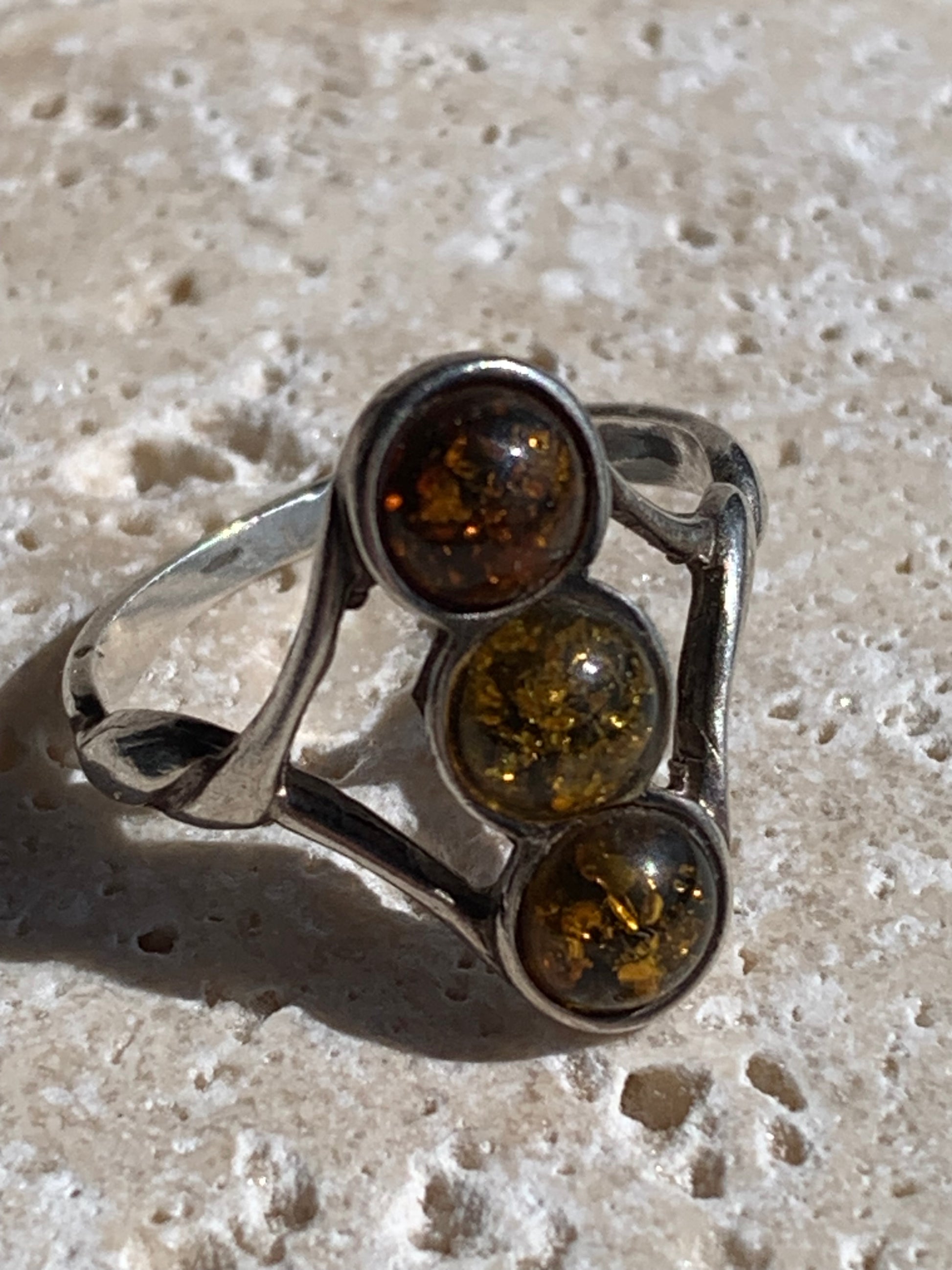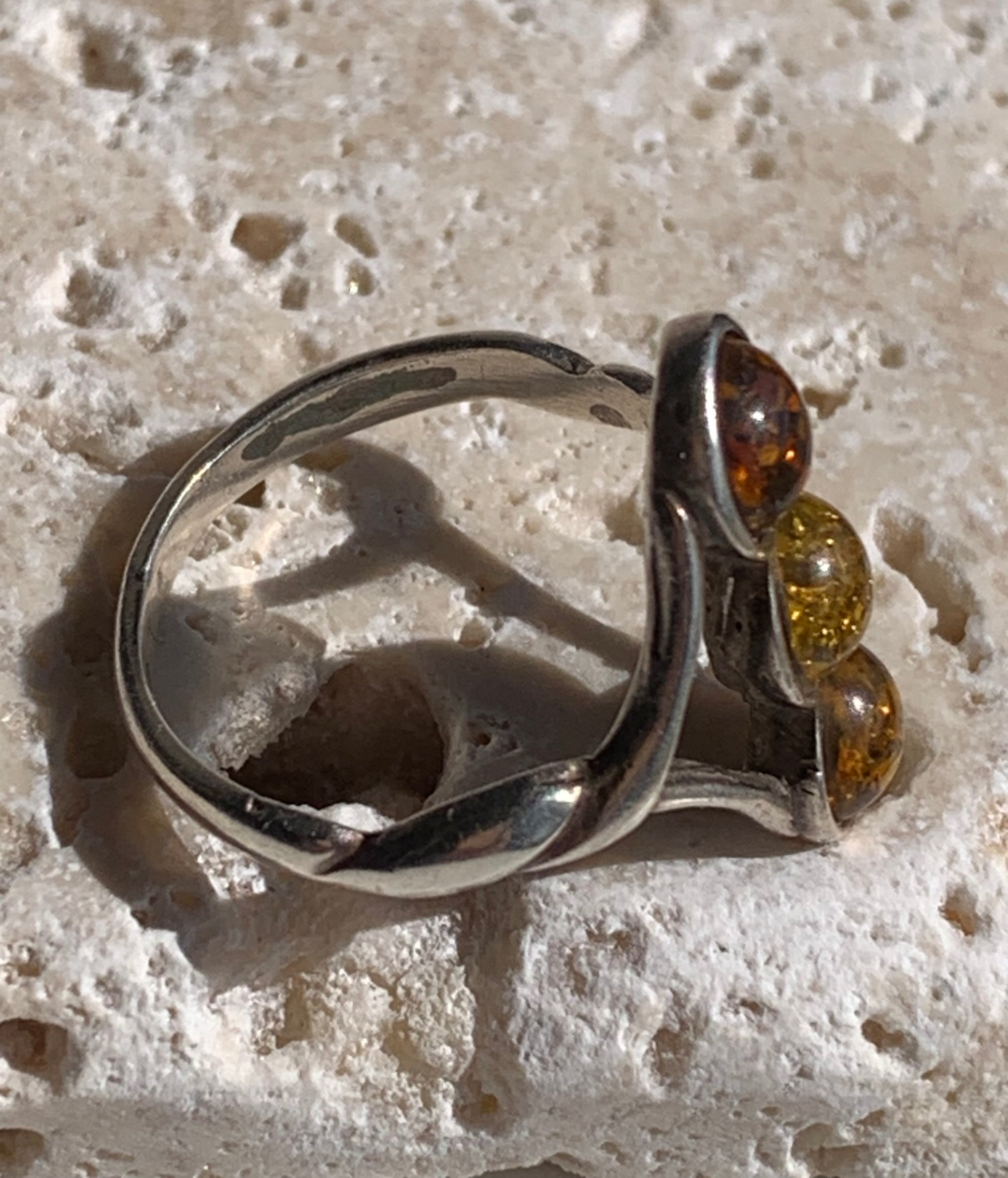 Élégante bague en Ambre, avec anneau torsadé, montée Argent 0.925. Superbes petits cabochons ronds avec 3 couleurs d'ambre. Très belle réalisation avec détails incroyables ! Taille de 57 fr !