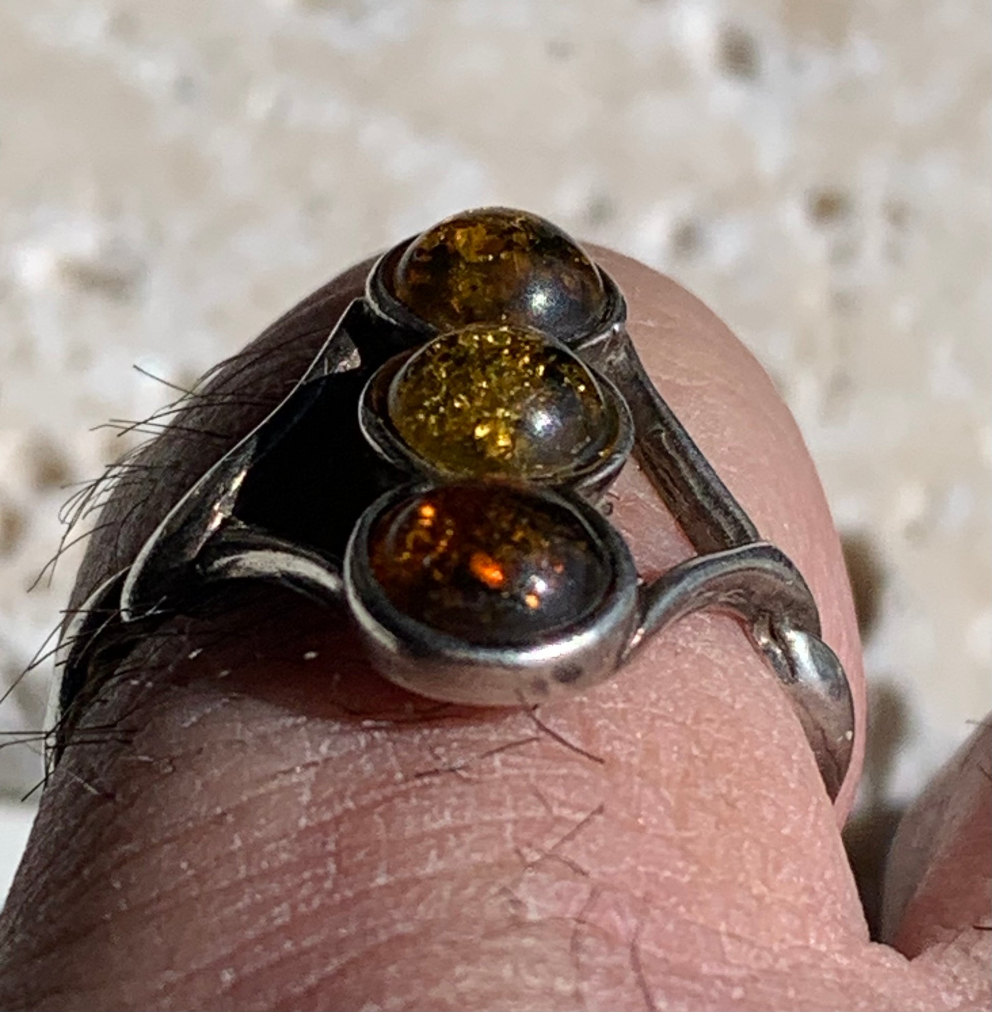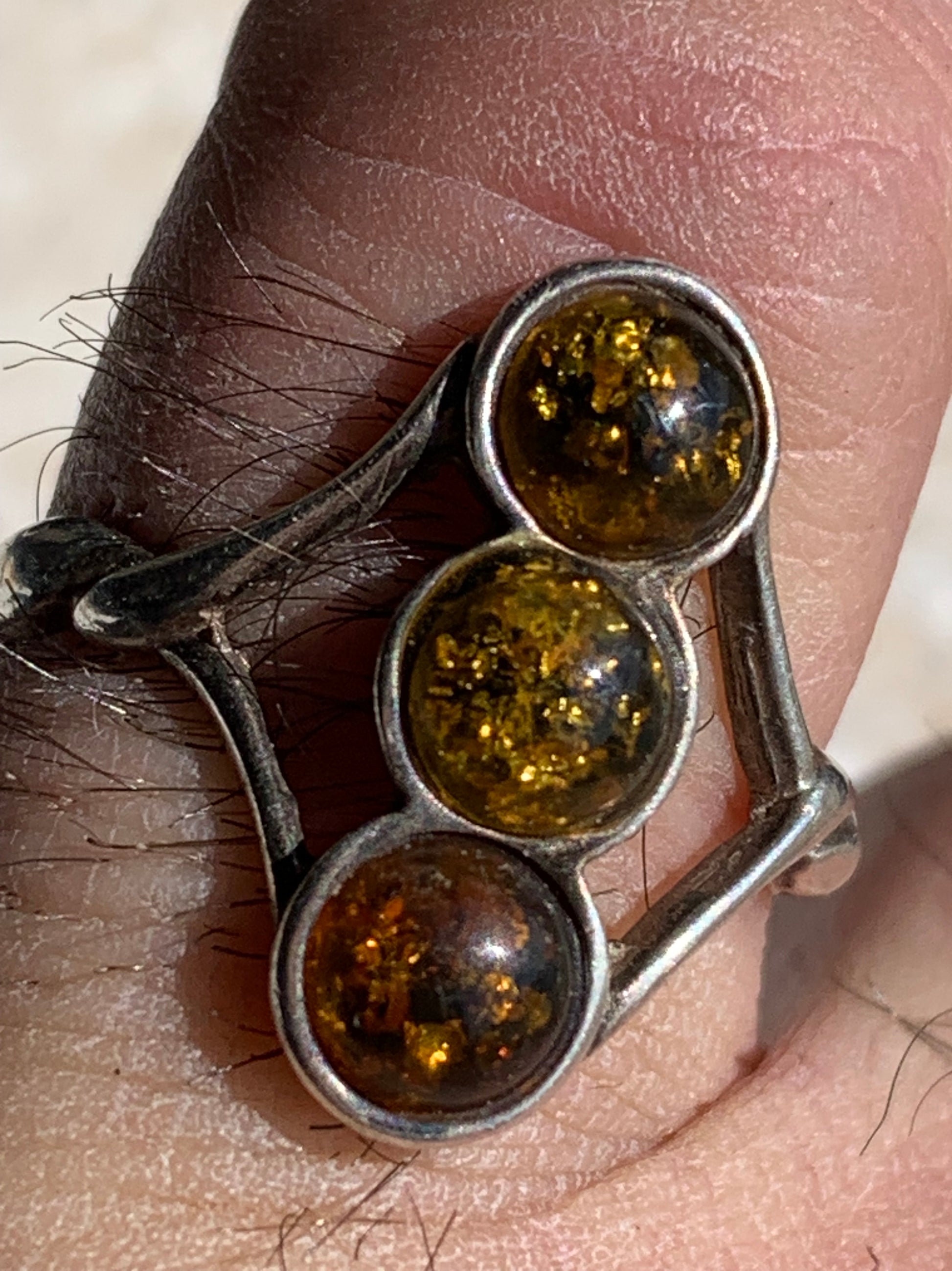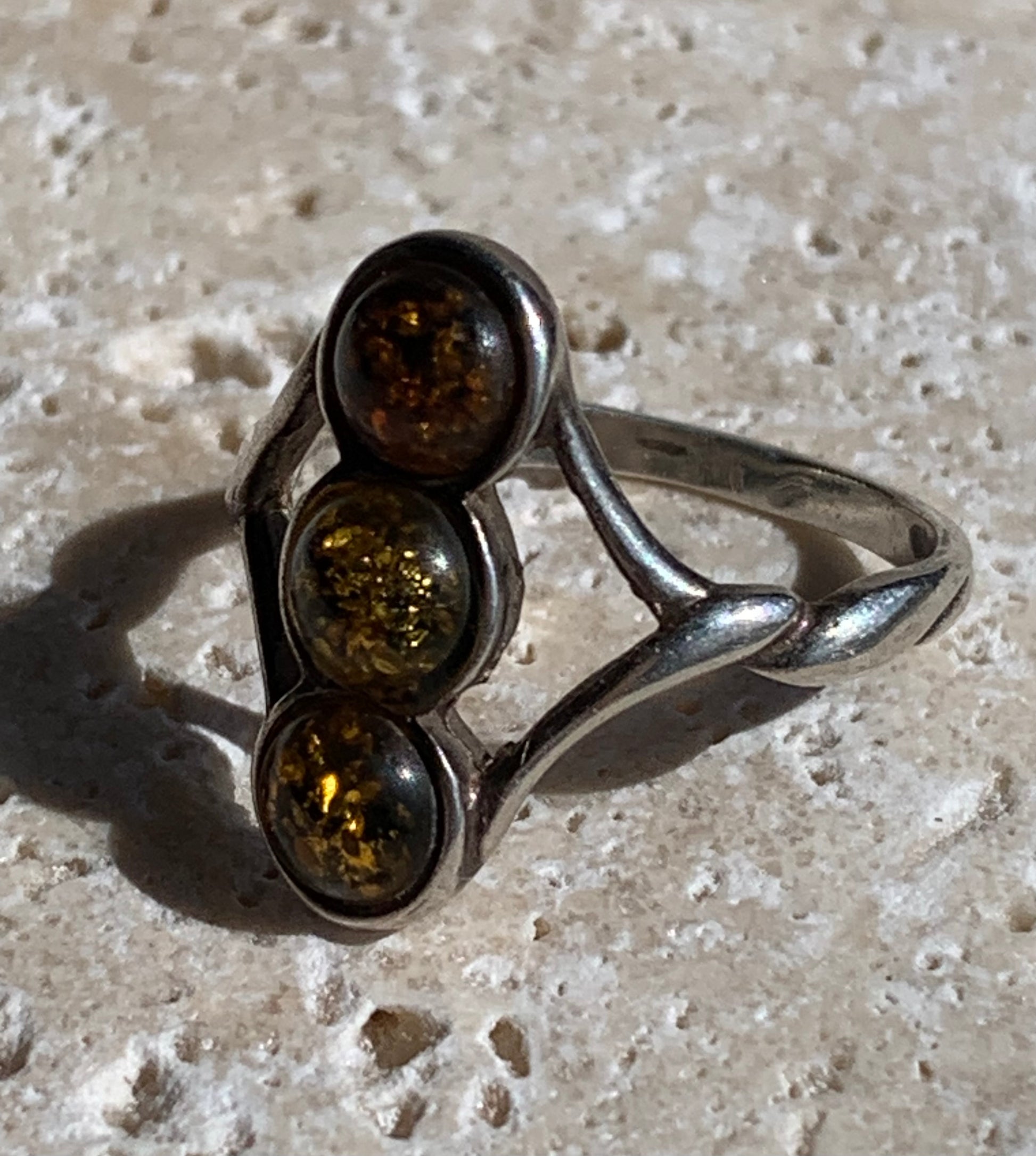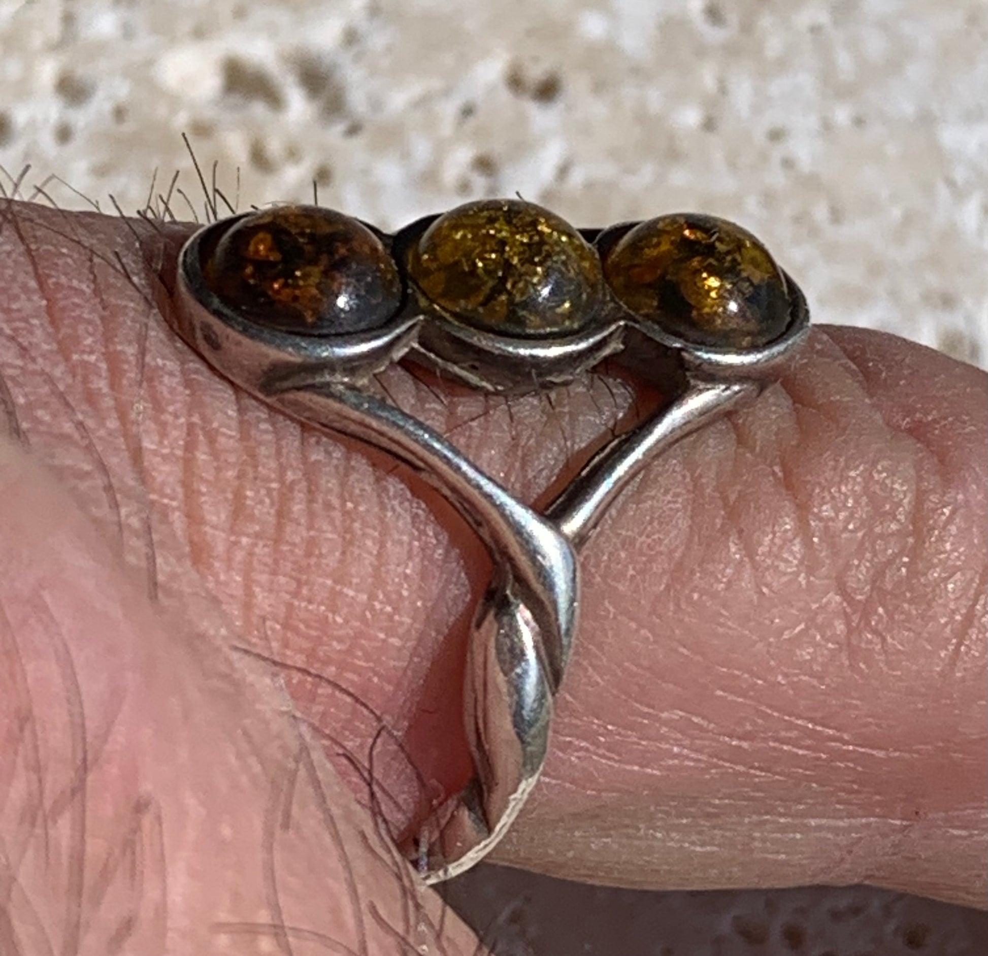 Élégante bague en Ambre, avec anneau torsadé, montée Argent 0.925. Superbes petits cabochons ronds avec 3 couleurs d'ambre. Très belle réalisation avec détails incroyables ! Taille de 57 fr !