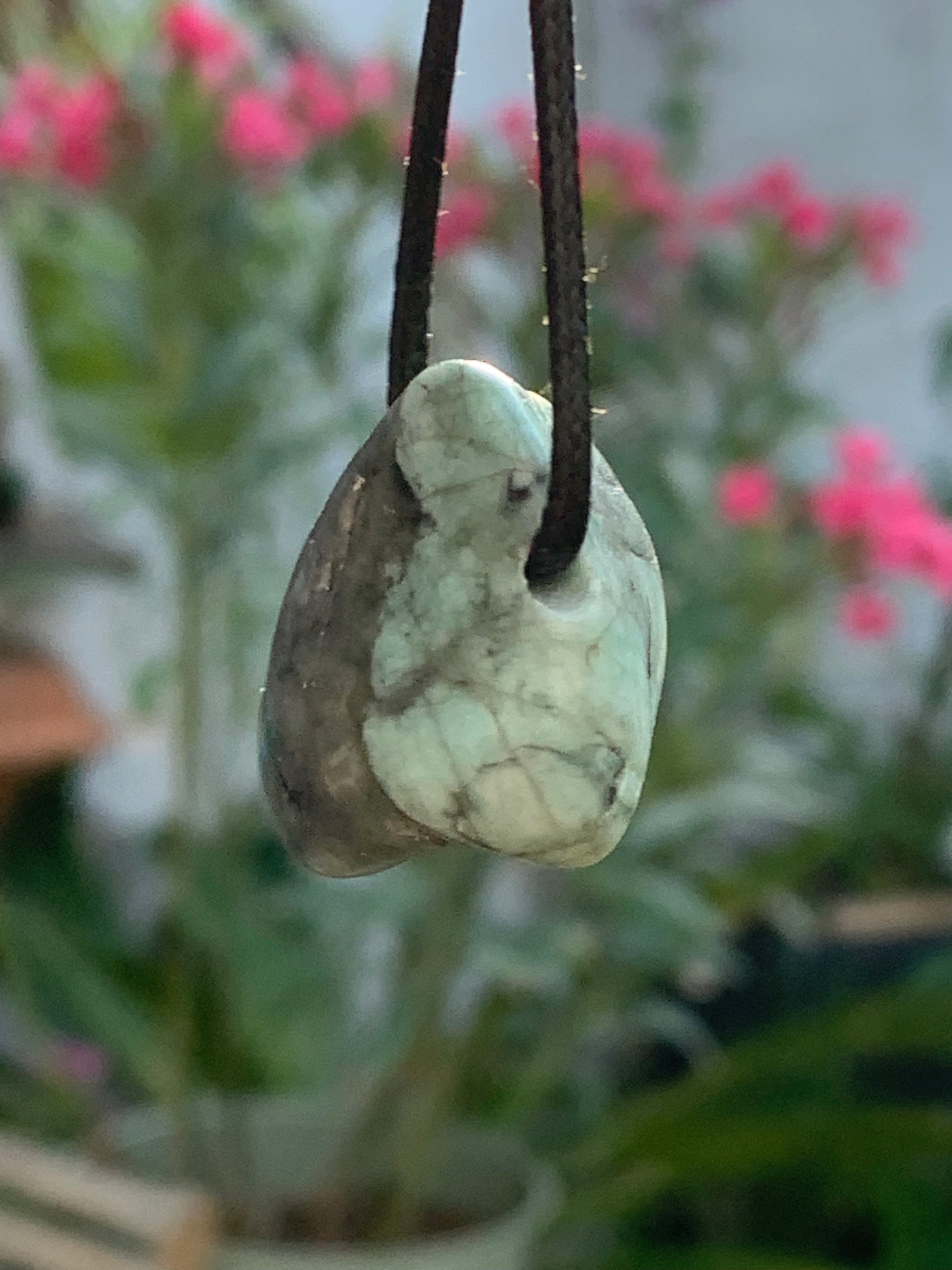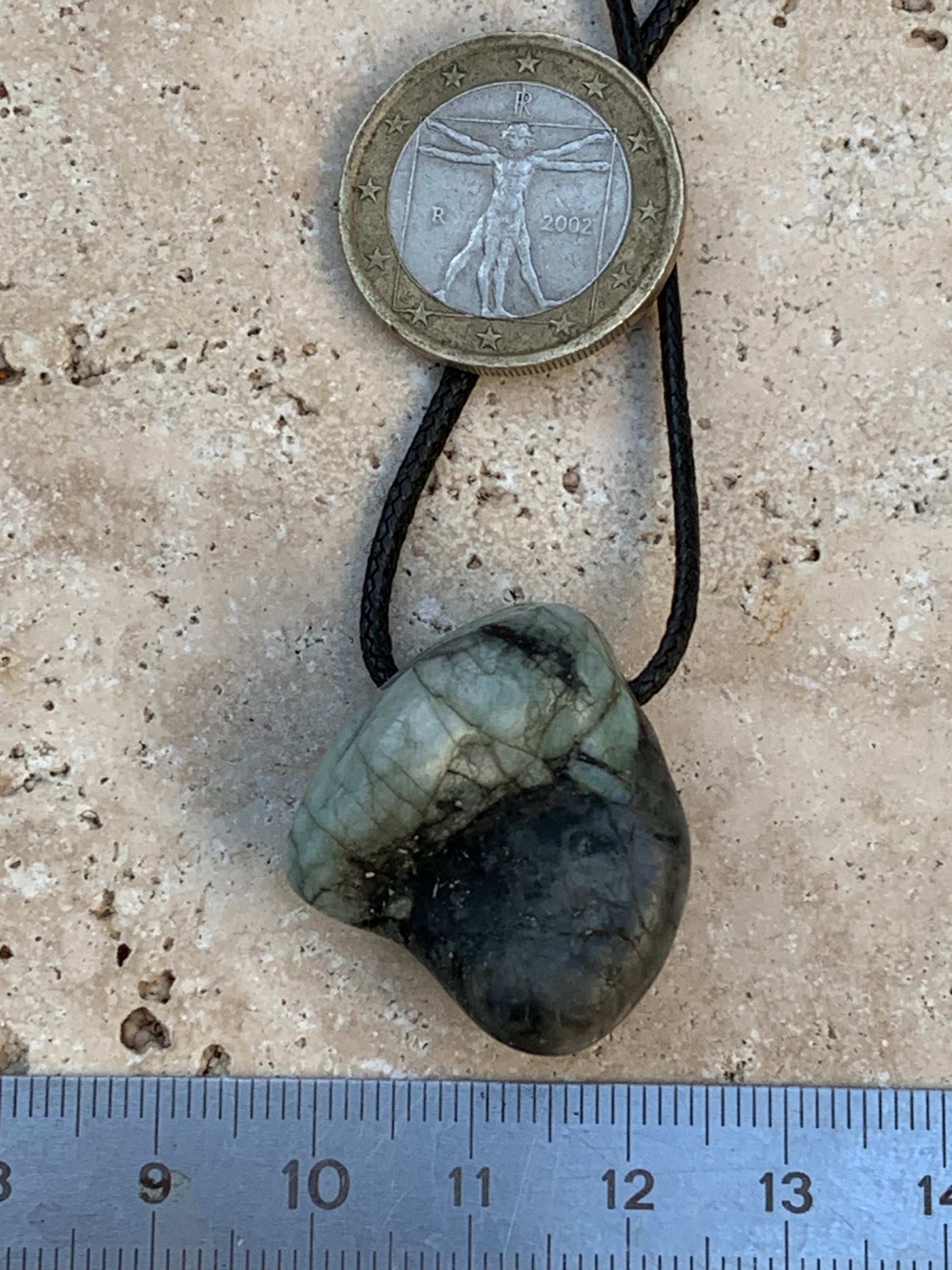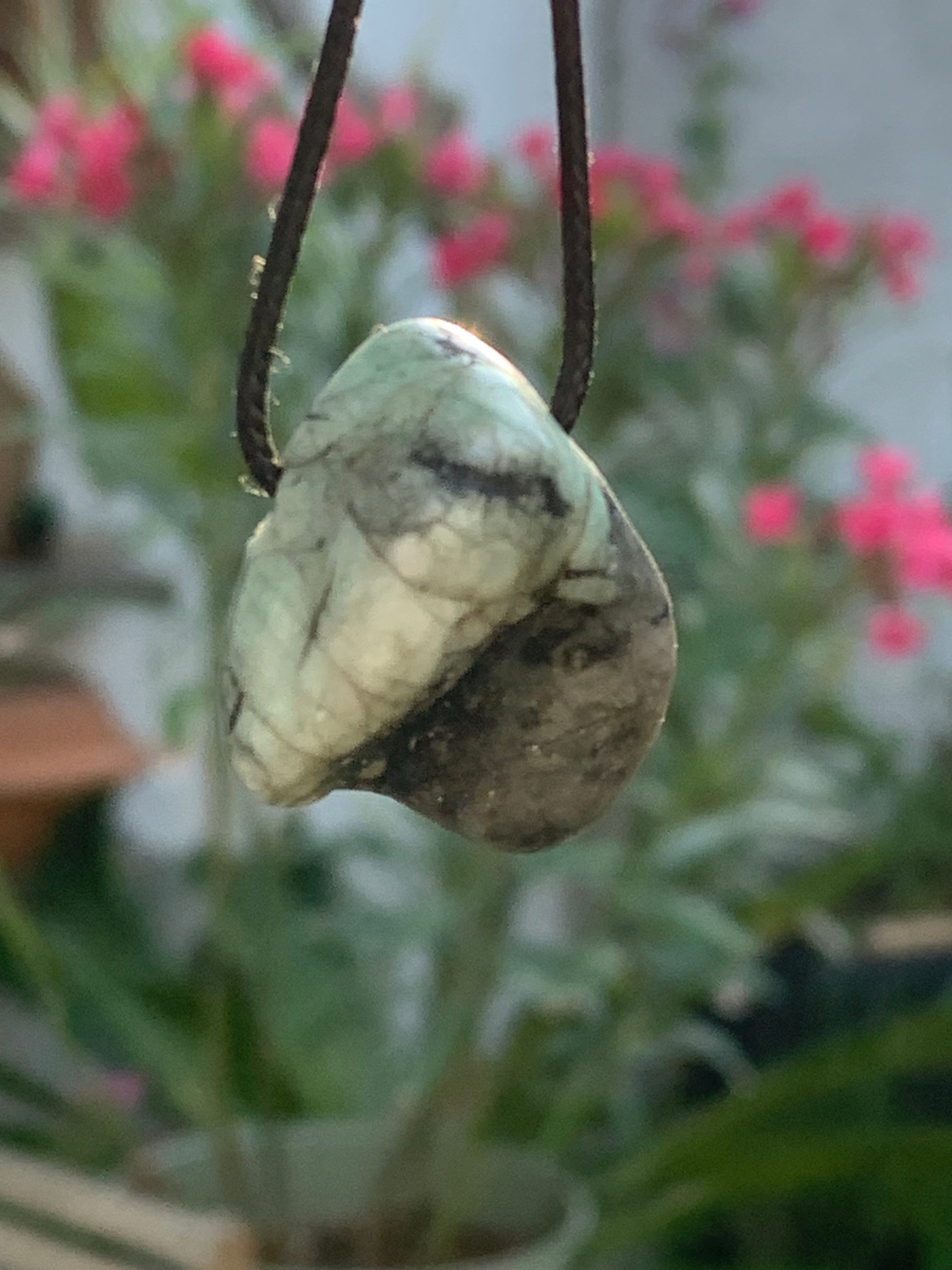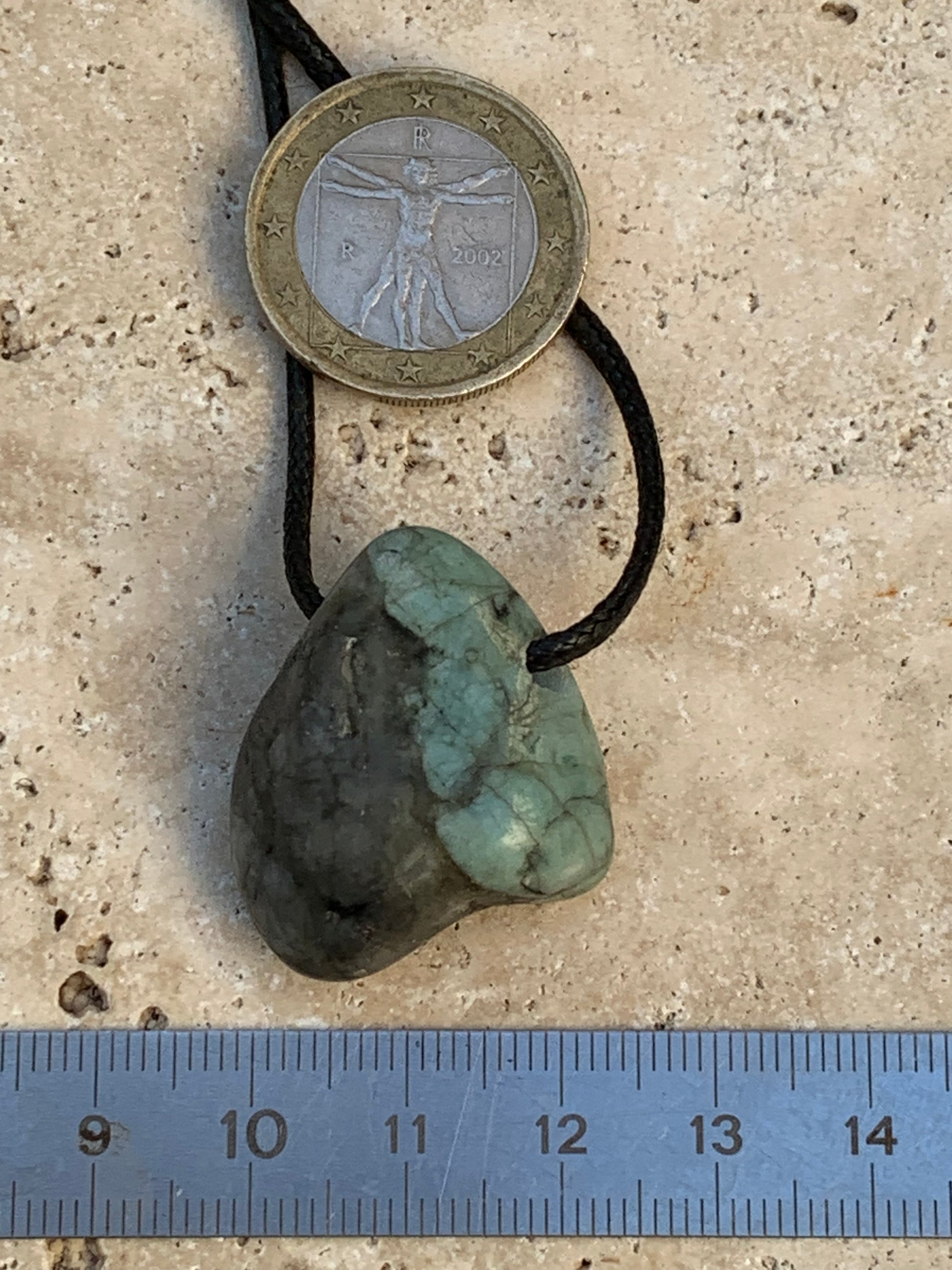 Émeraude, pierre brute percée de 29mm x25 x14 - 12,5 grammes. Vendu avec cordon noir réglable !
