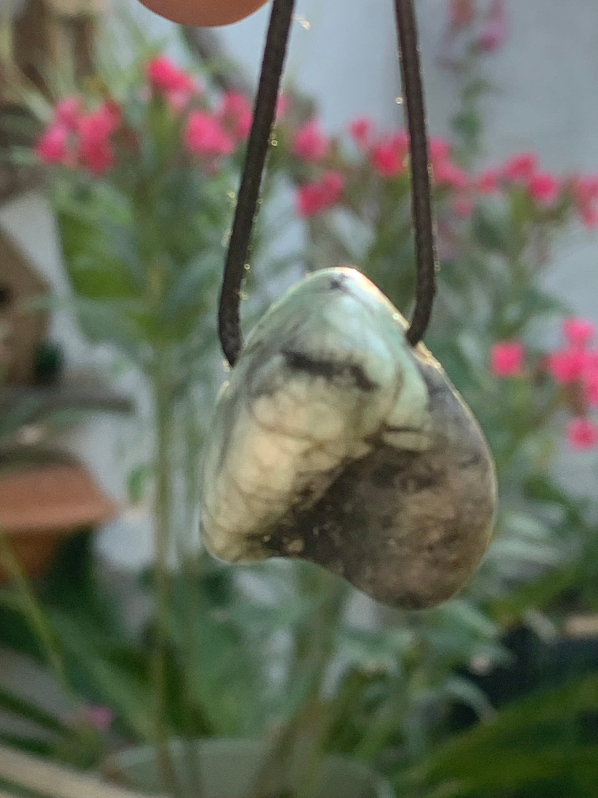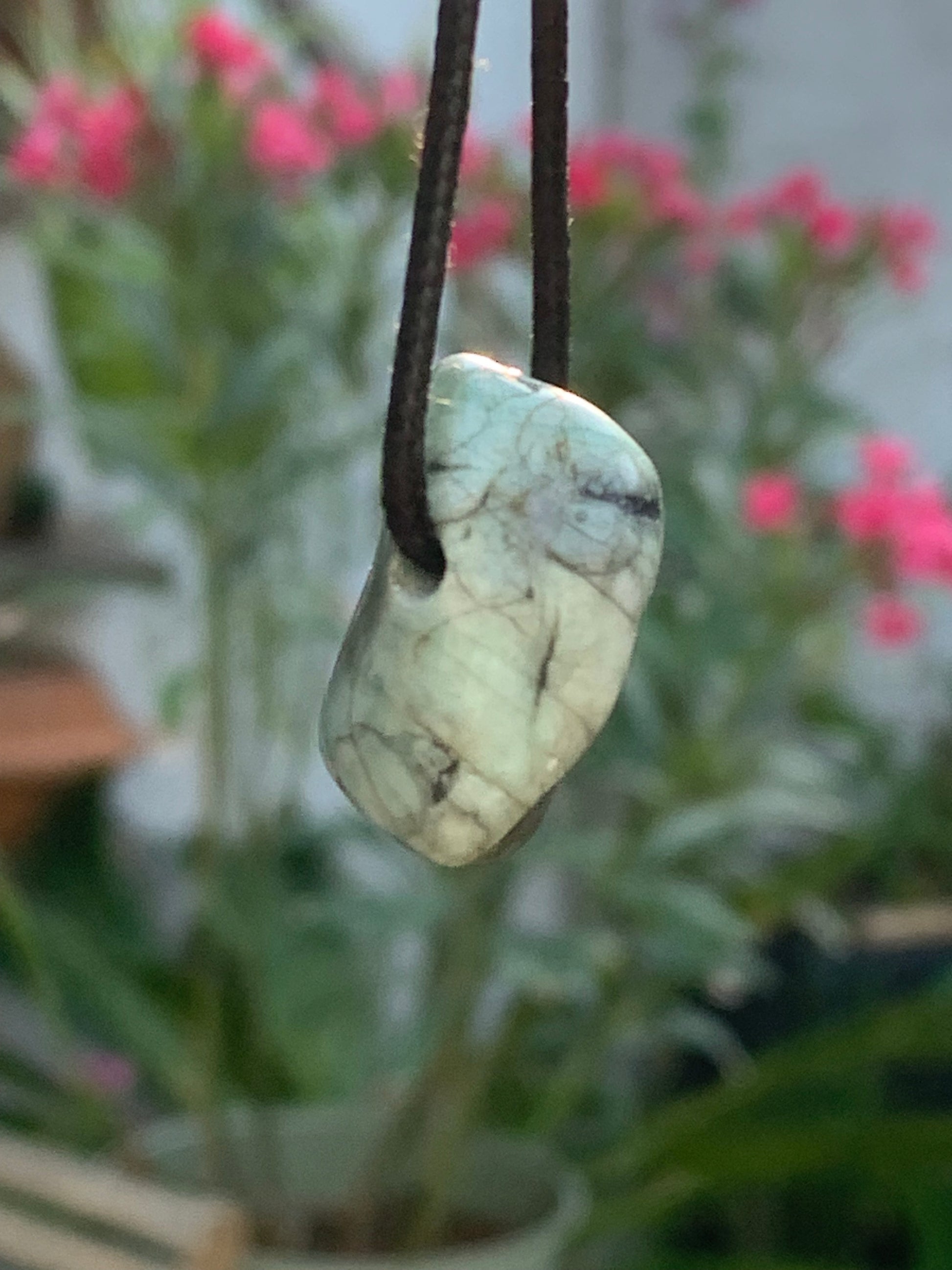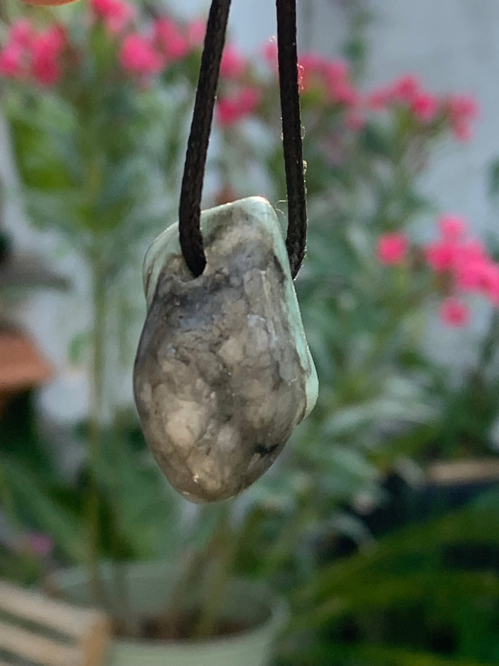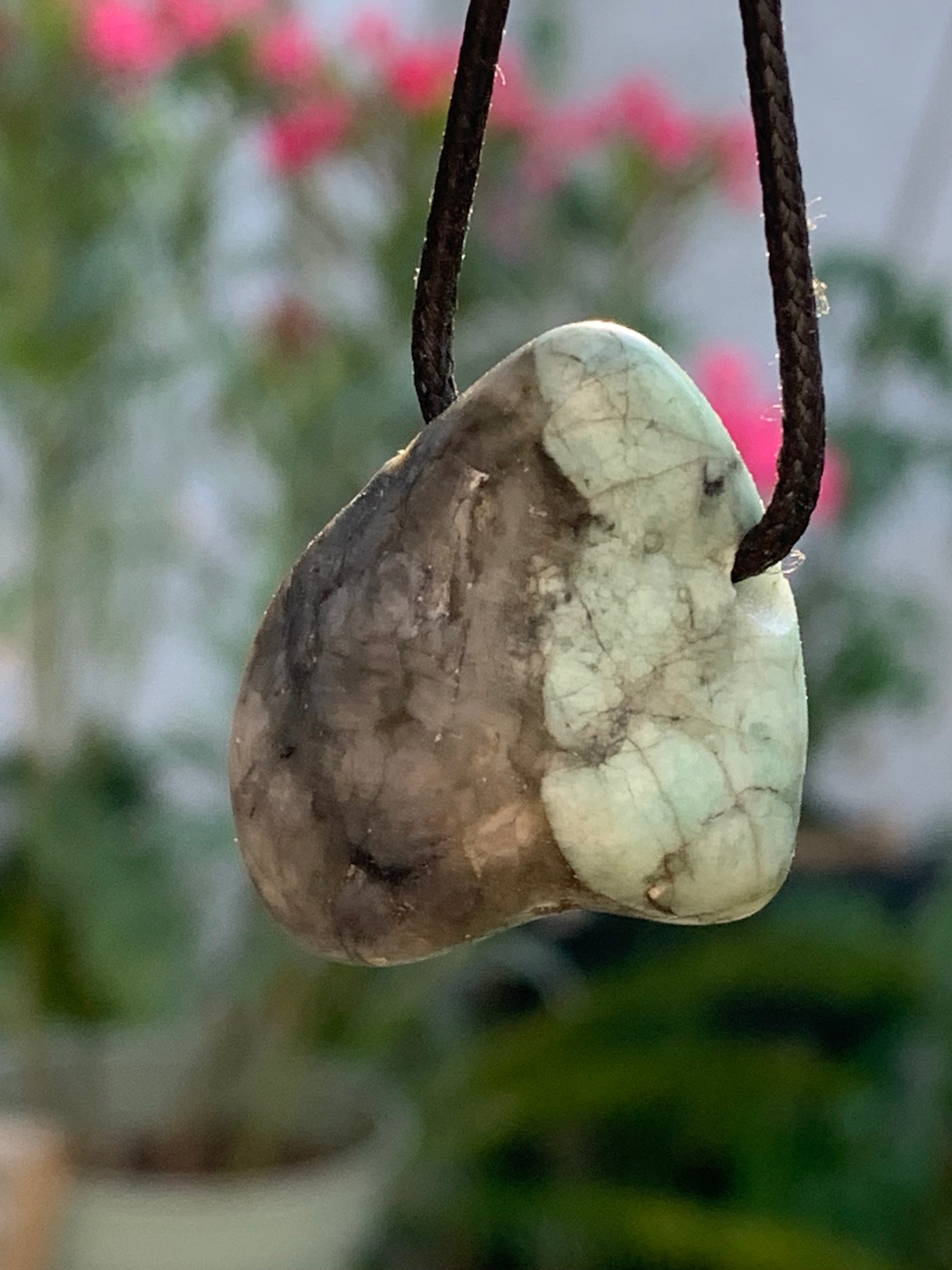 Émeraude, pierre brute percée de 29mm x25 x14 - 12,5 grammes. Vendu avec cordon noir réglable !