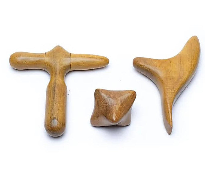 Ensemble de massage composé de 3 outils de massage manuels en bois de santal. Livré dans un sac en coton naturel.