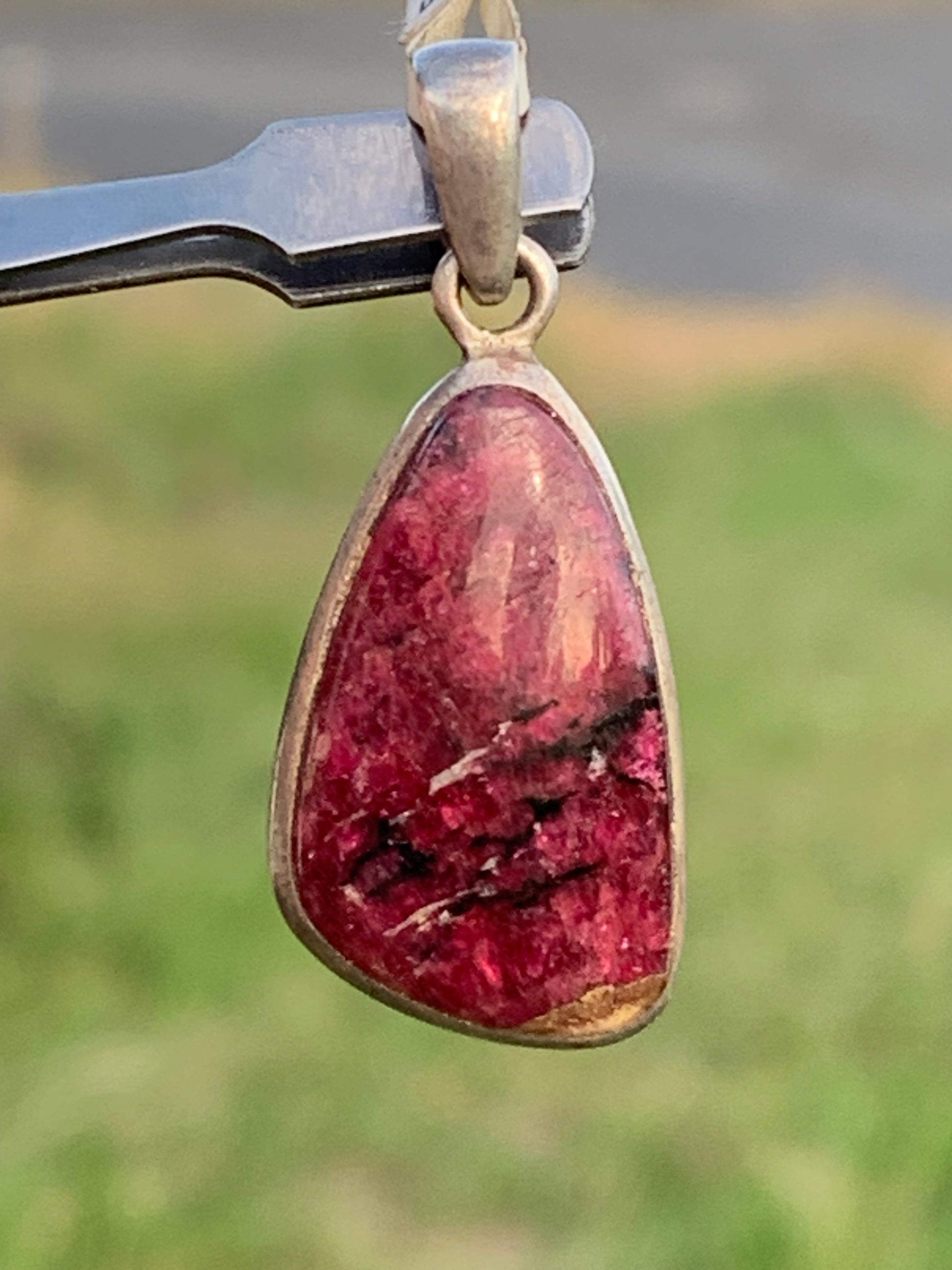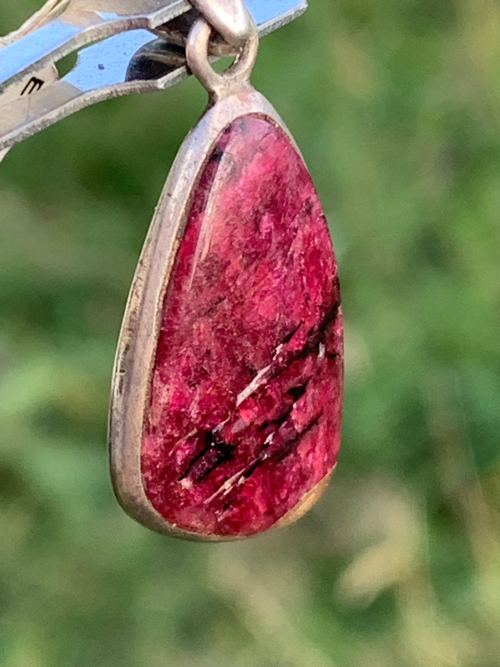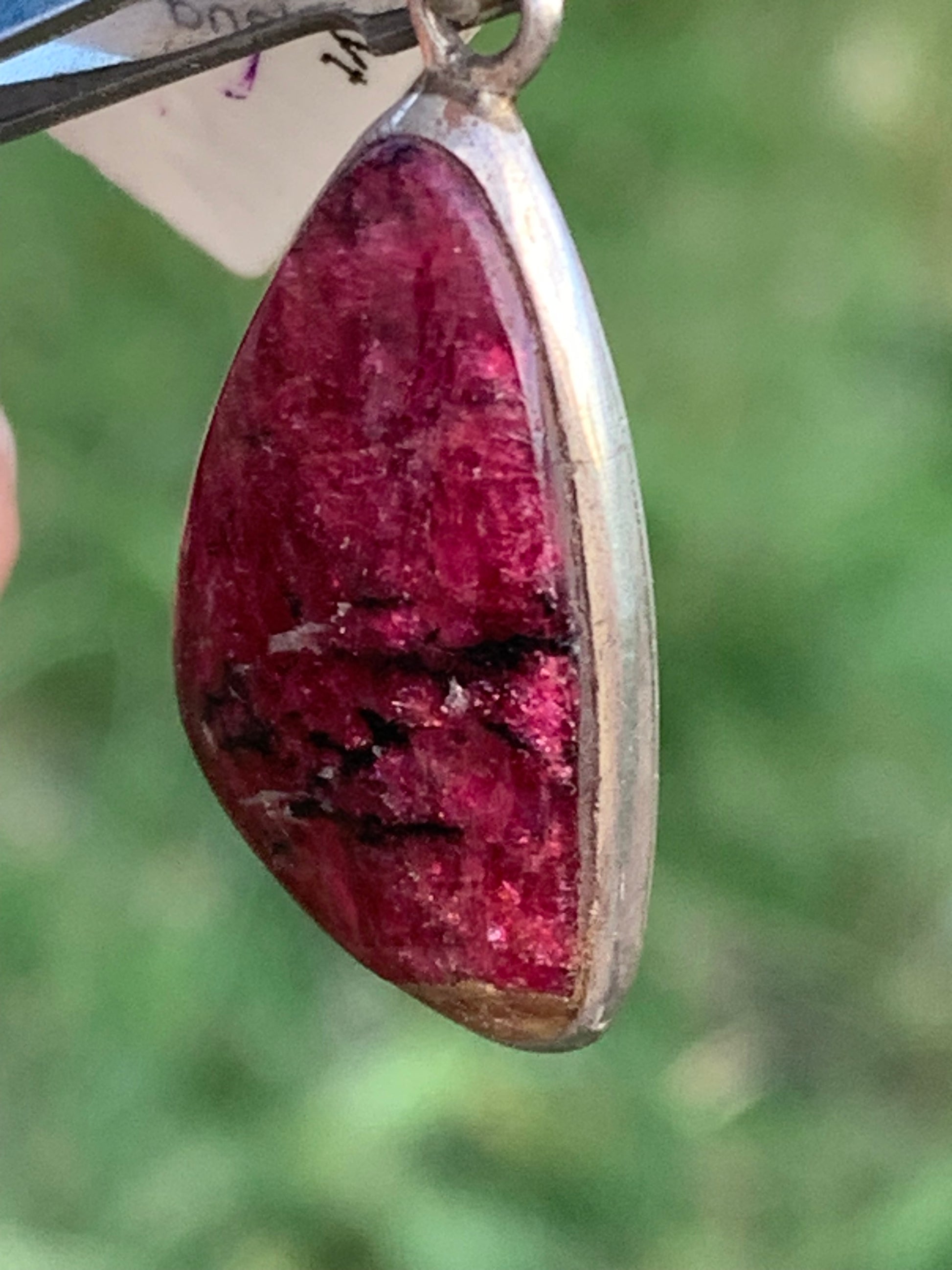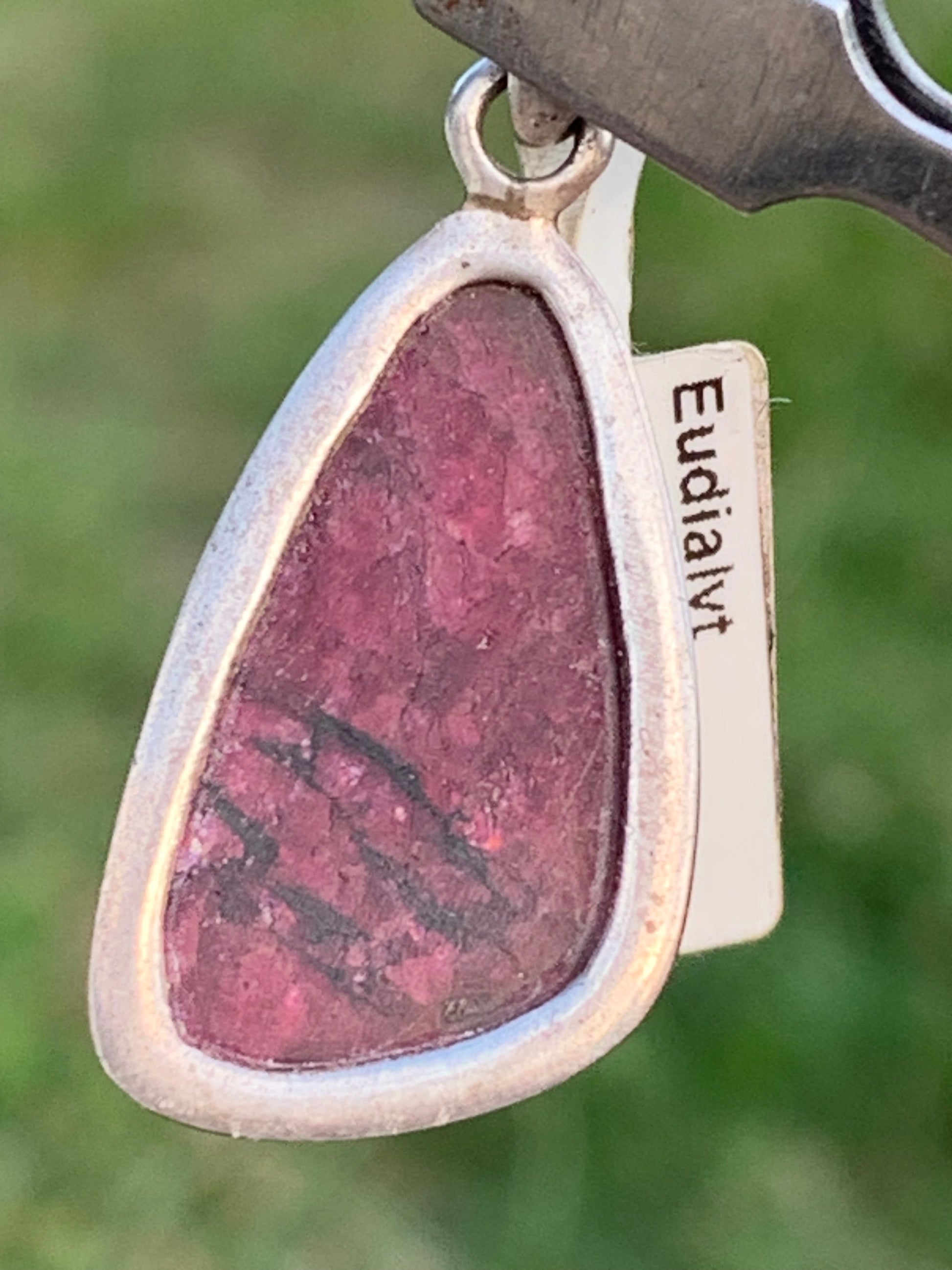 Eudialyte, pendentif en Argent 925 de 35mm de hauteur x 15 de largeur x 5 d'épaisseur - 3,7 grammes. Vendu avec cordon réglable de couleur noire !