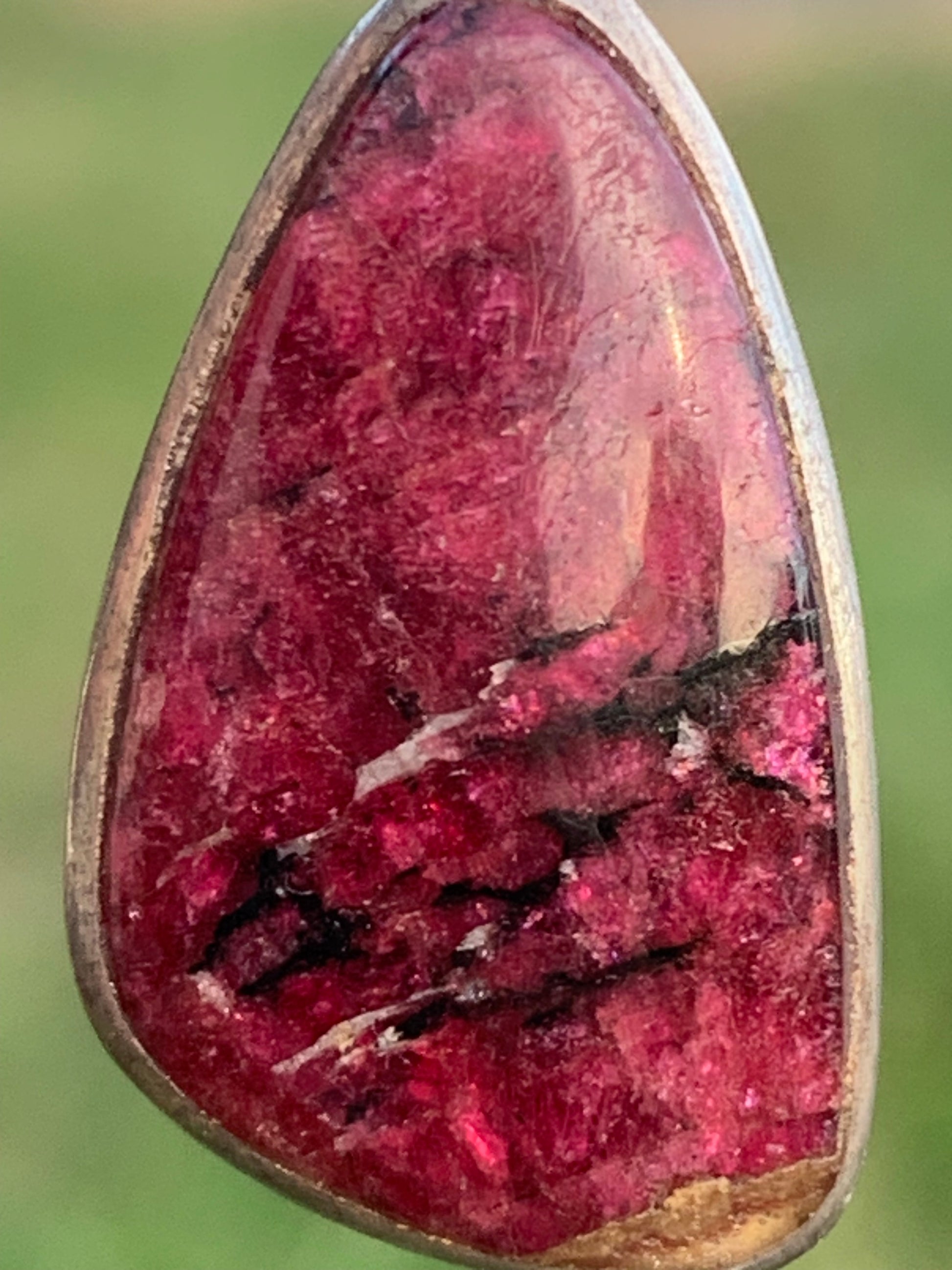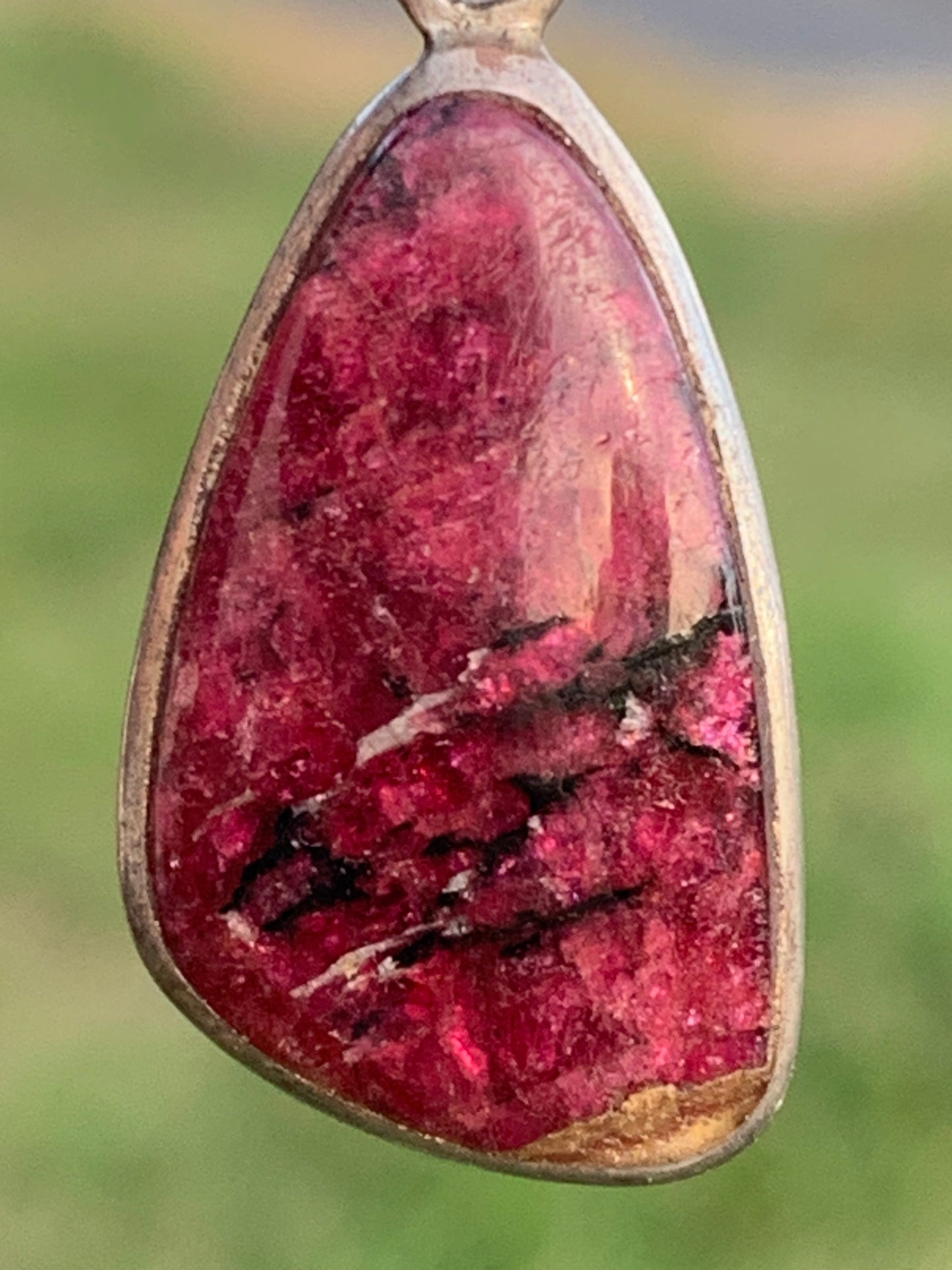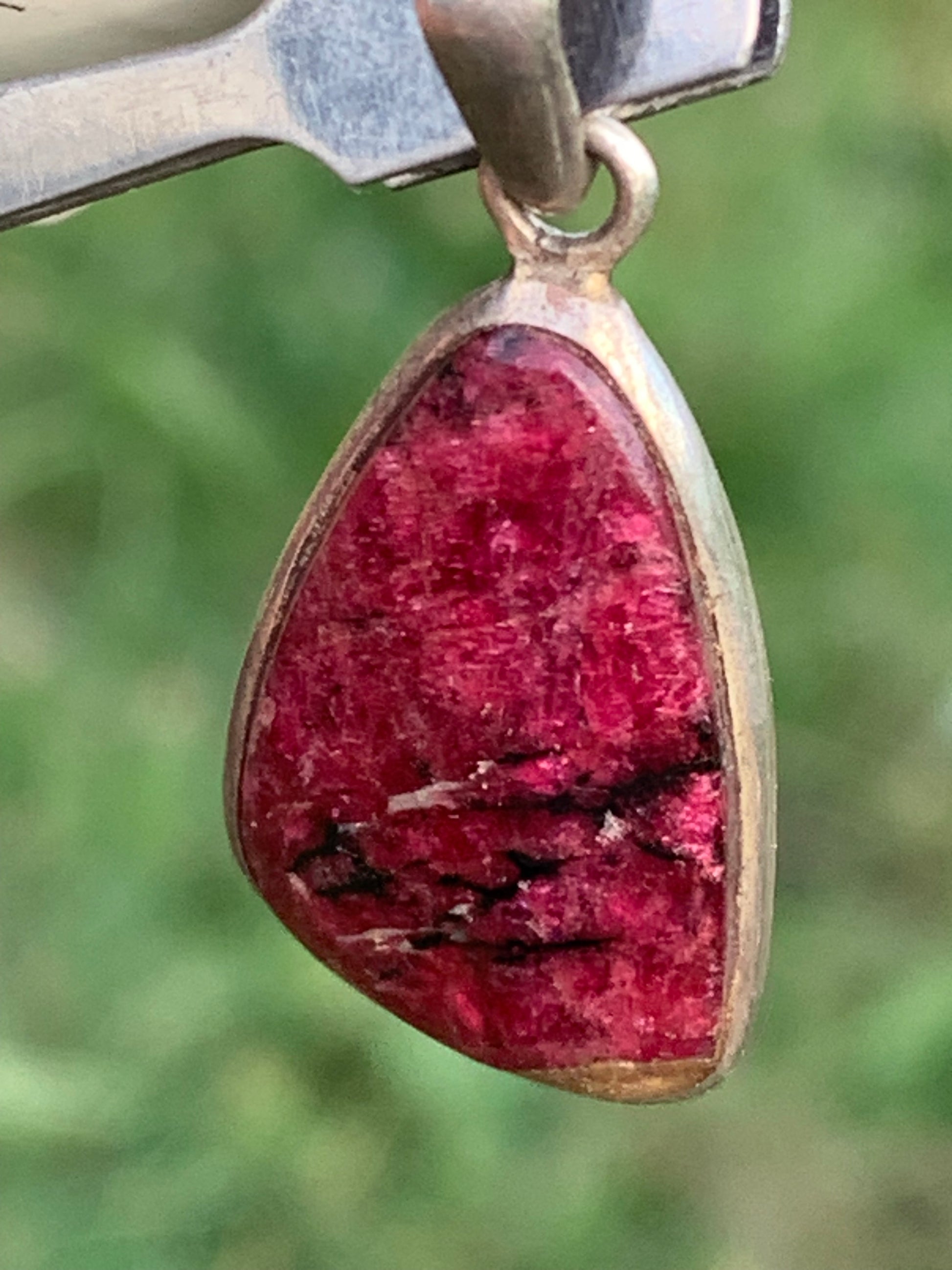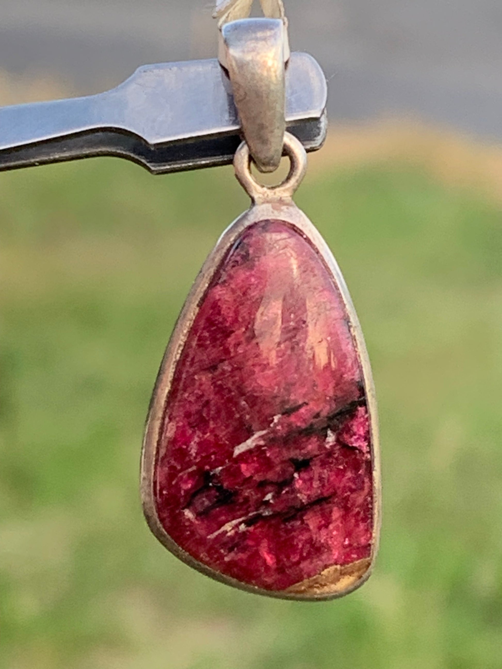 Eudialyte, pendentif en Argent 925 de 35mm de hauteur x 15 de largeur x 5 d'épaisseur - 3,7 grammes. Vendu avec cordon réglable de couleur noire !