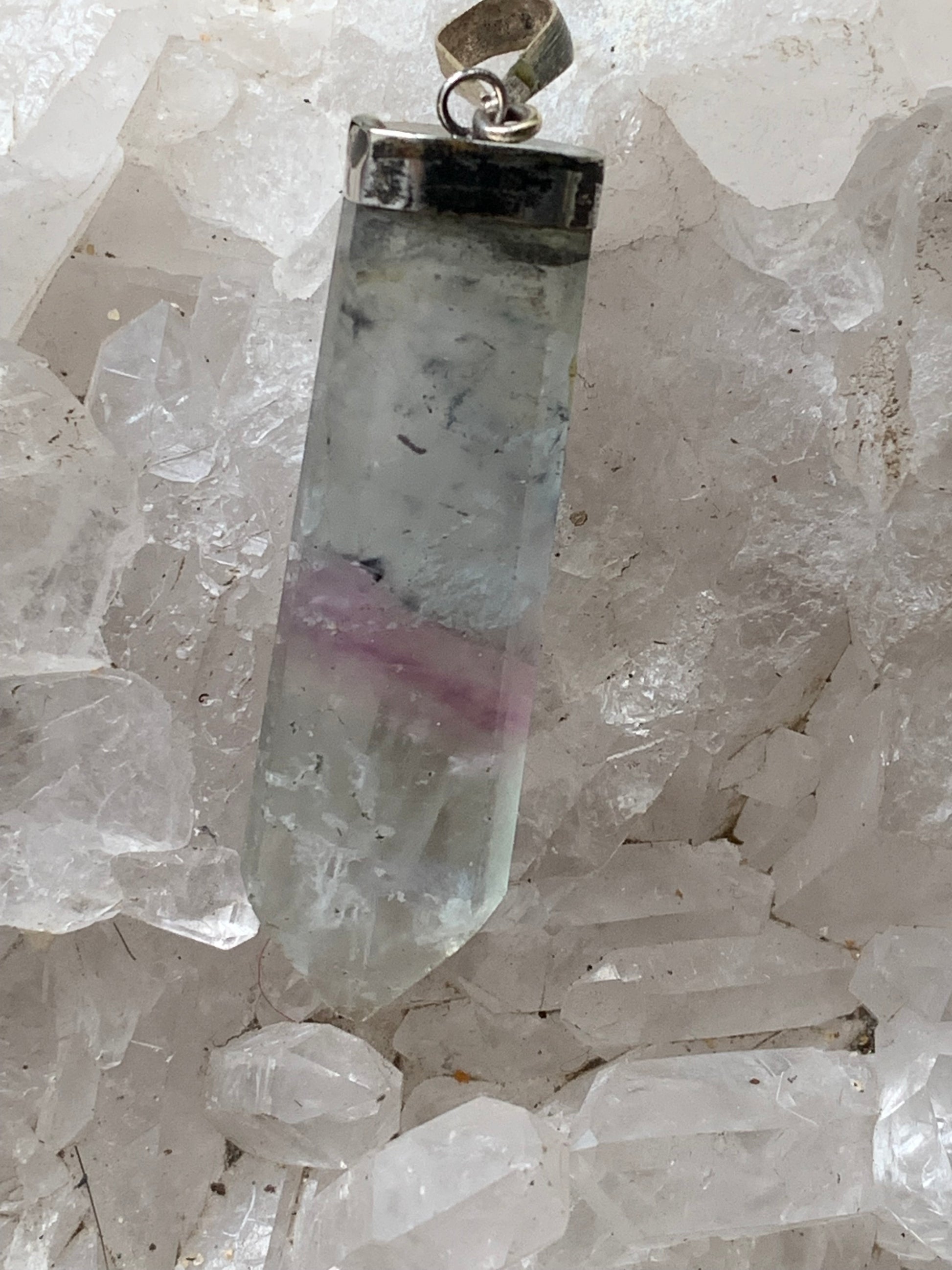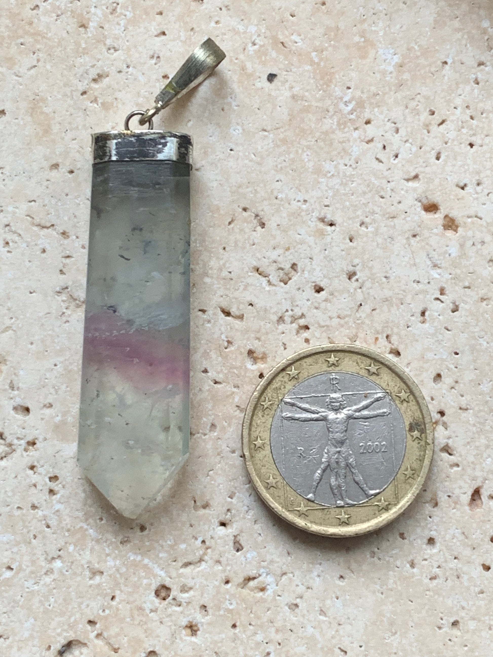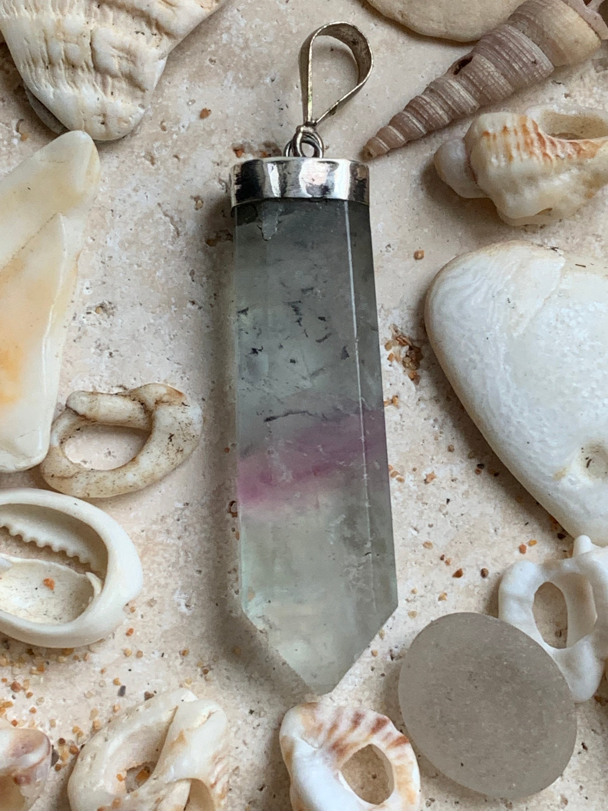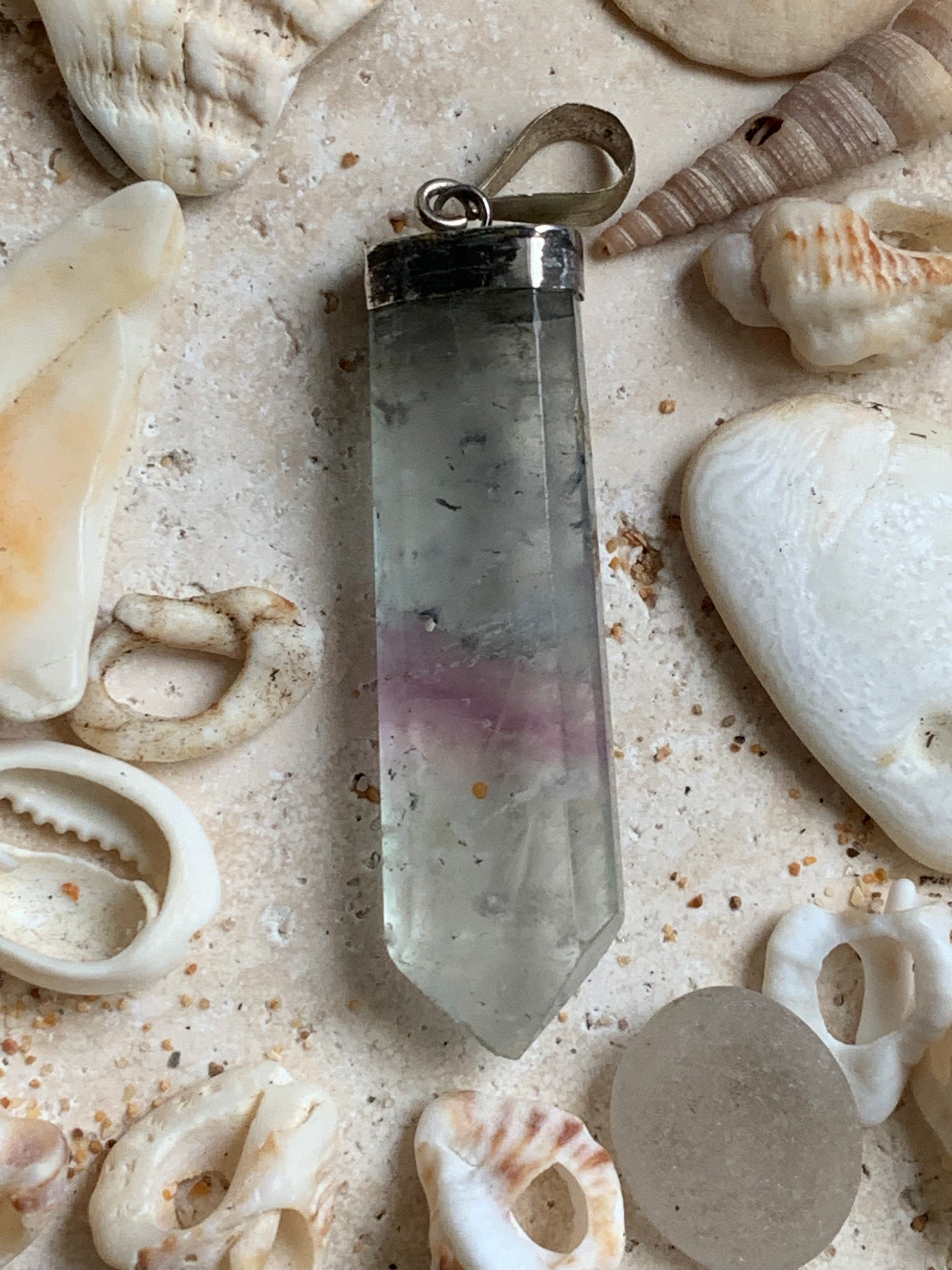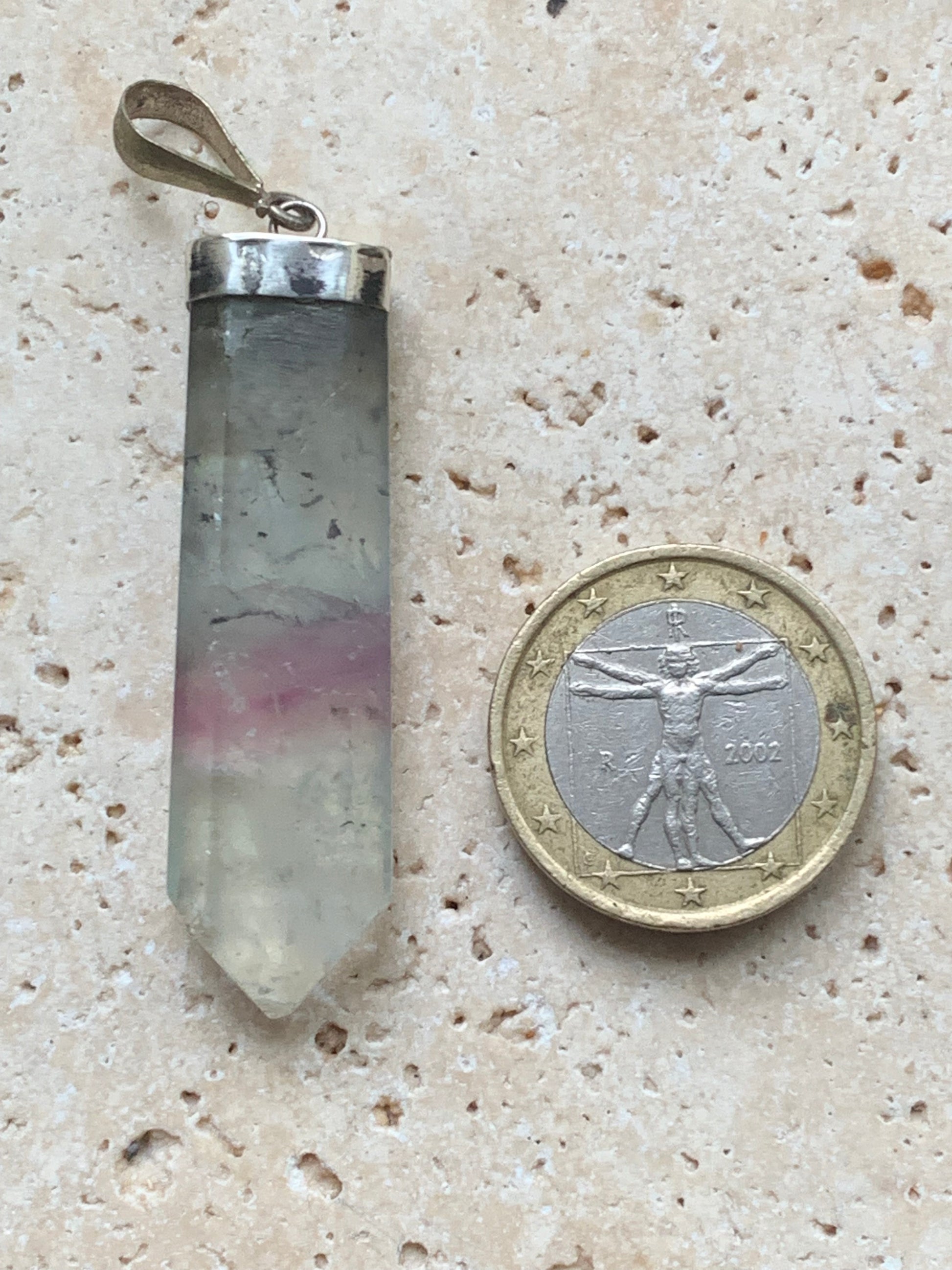 Fluorite multicolore, pièce unique en Argent de 60 millimètres de hauteur x 12 millimètres de largeur x 8 d'épaisseur. Vendu avec un cordon réglable de couleur noire !