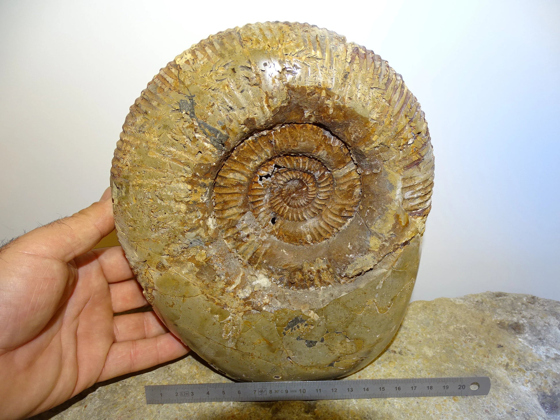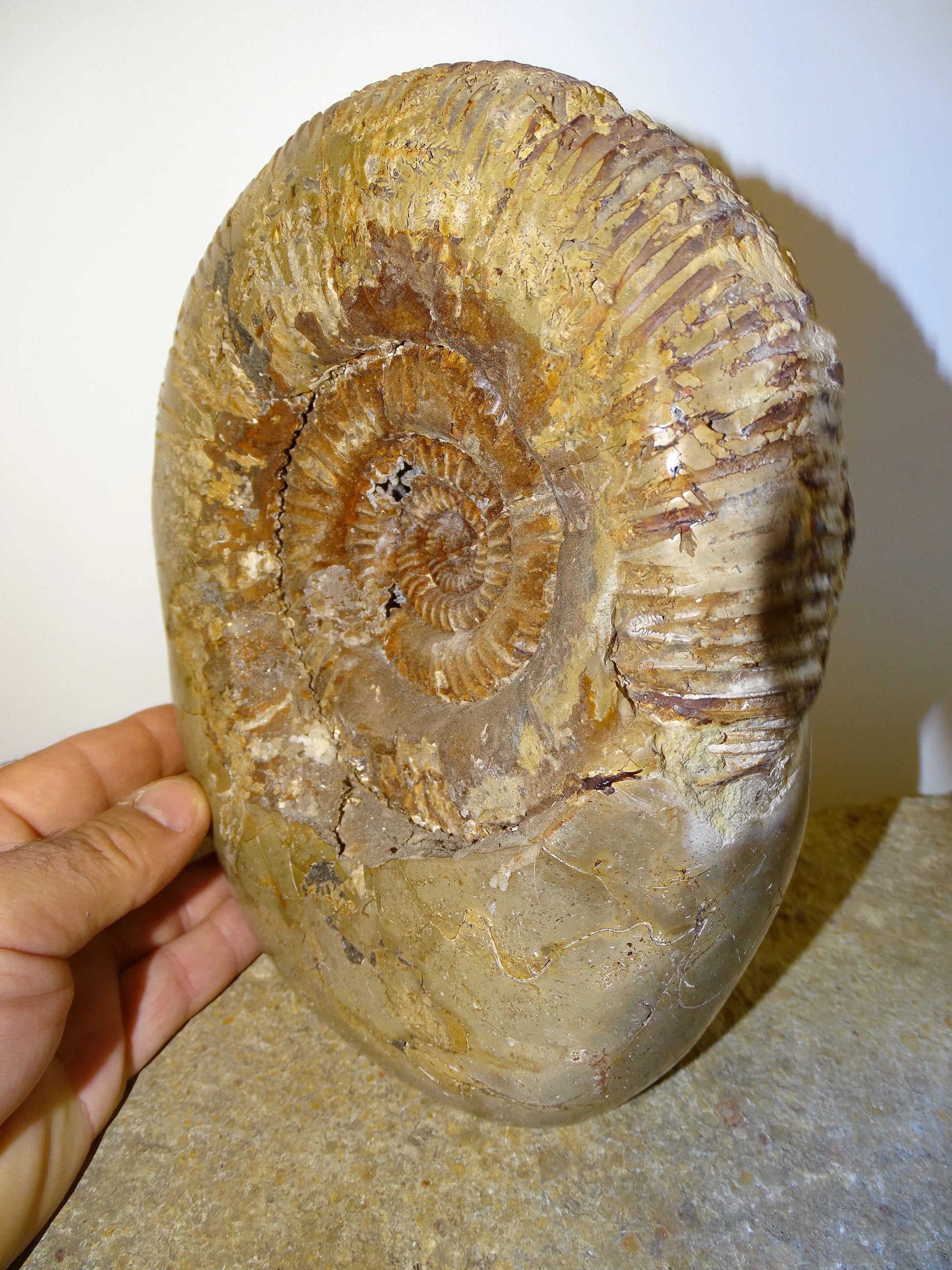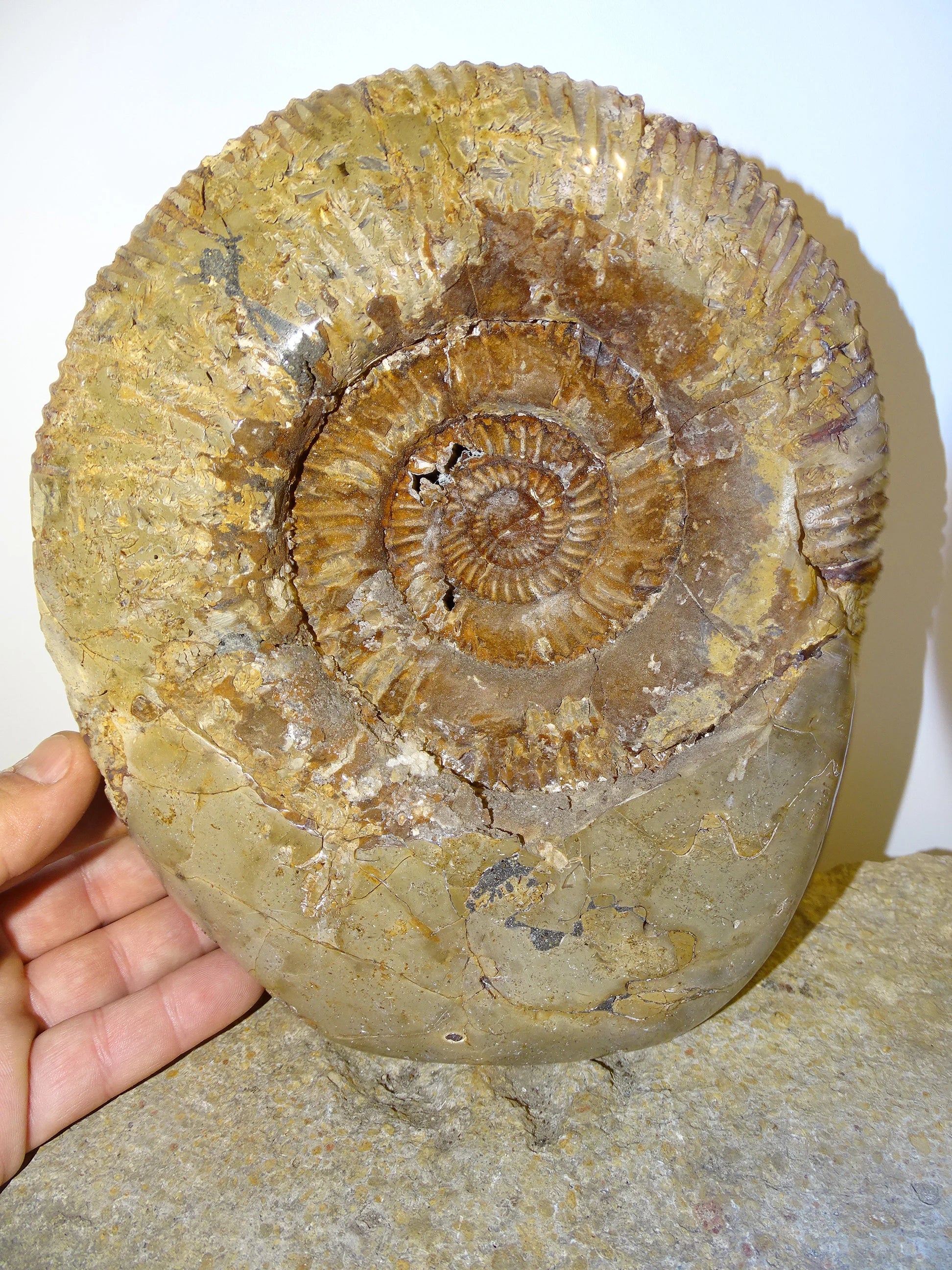 Fossile d'Ammonite dans de la Septaria, pièce unique de 20x20x10 centimètres, 7,7 kilogrammes. En provenance de Madagascar, très belle pièce de minéralogie ! Superbe !