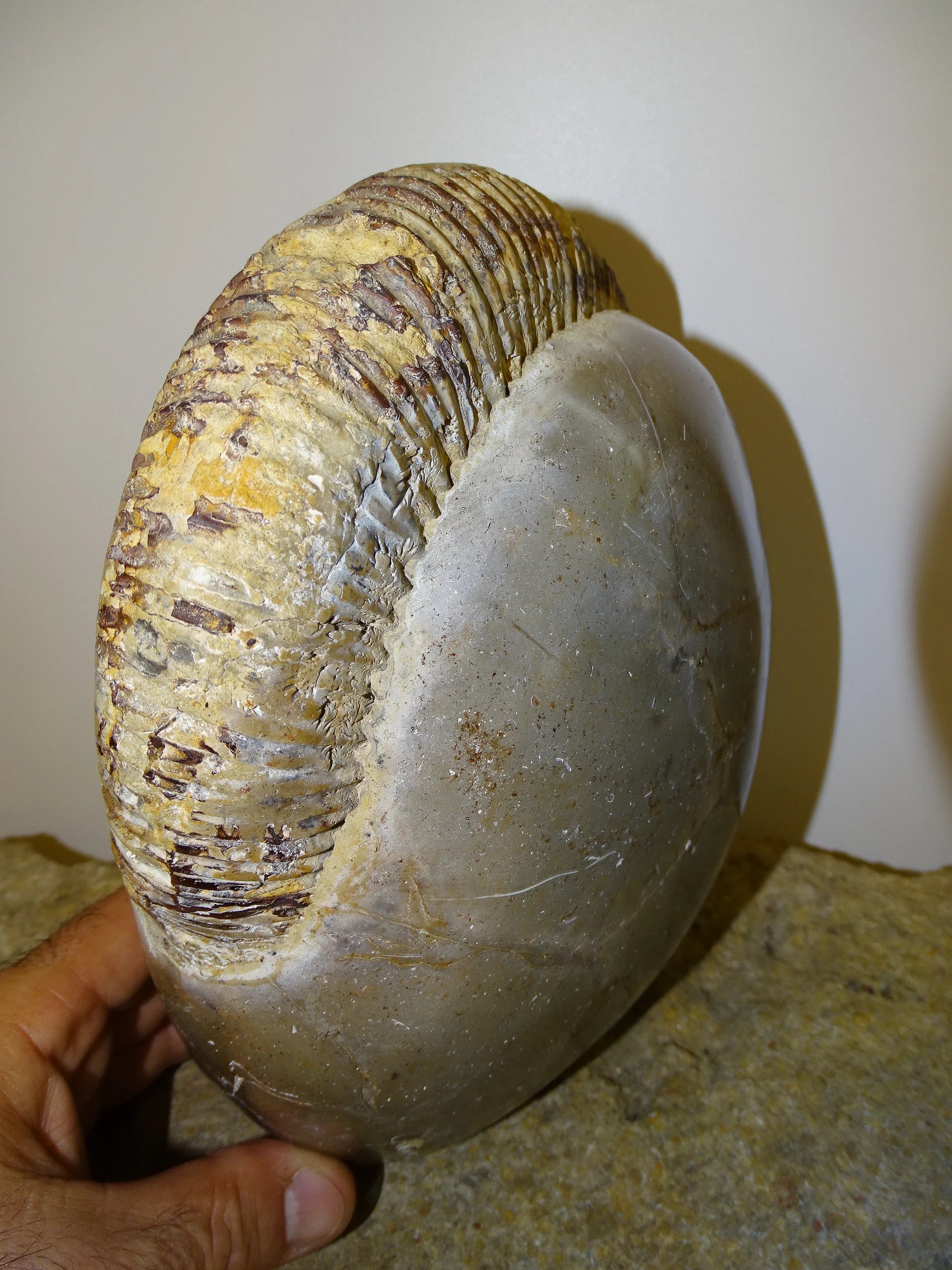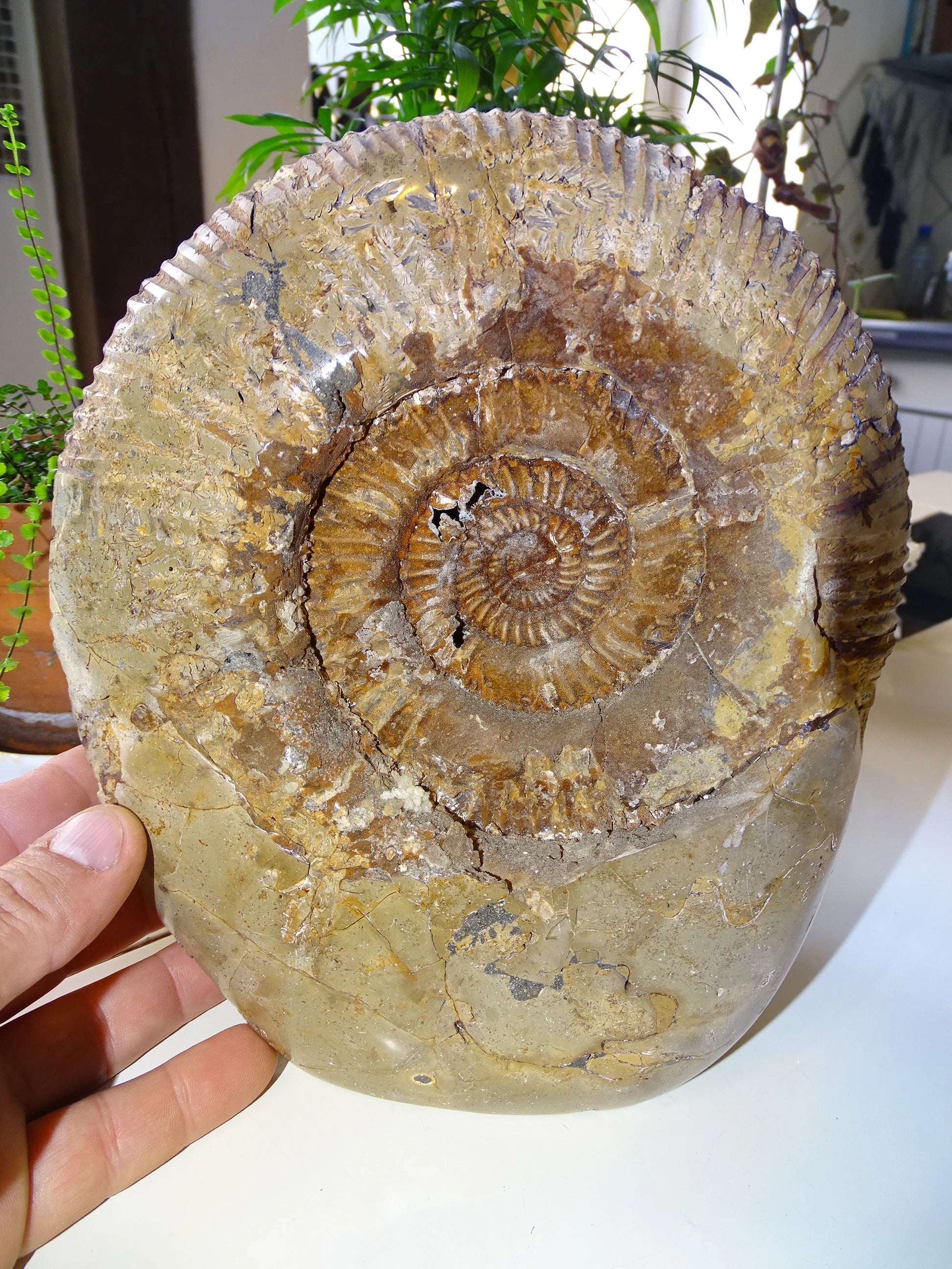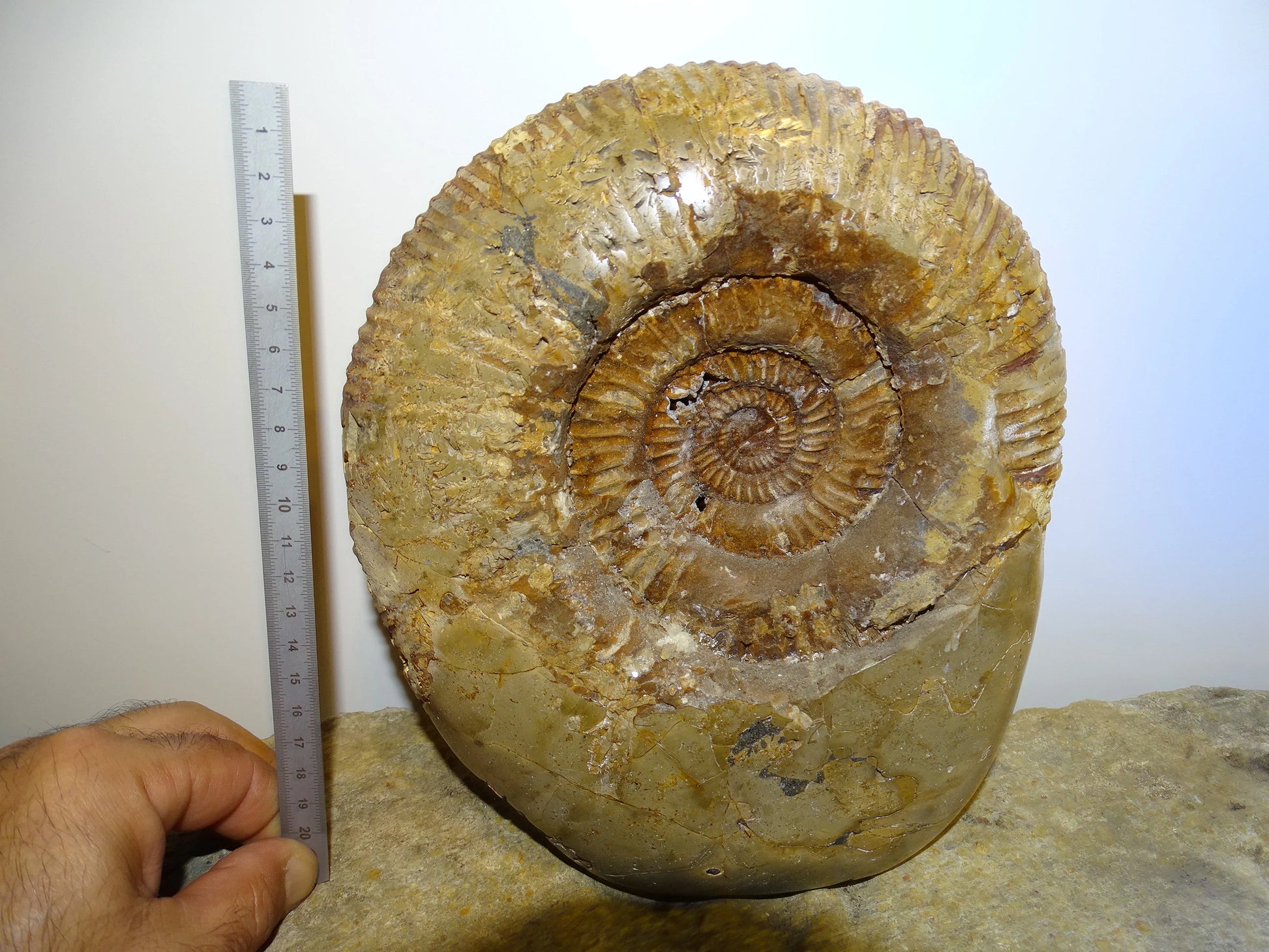 Fossile d'Ammonite dans de la Septaria, pièce unique de 20x20x10 centimètres, 7,7 kilogrammes. En provenance de Madagascar, très belle pièce de minéralogie ! Superbe !