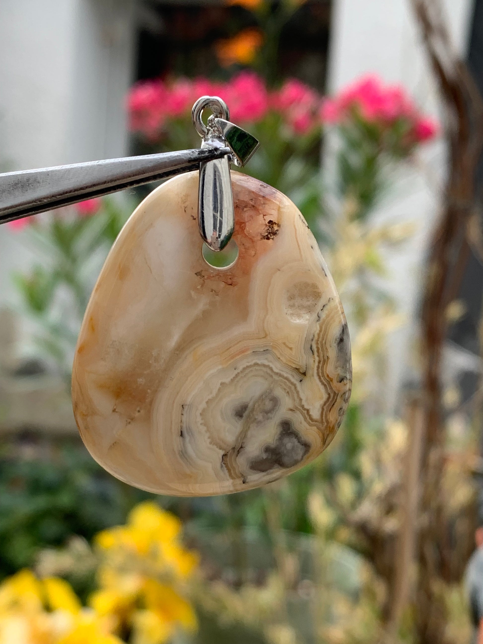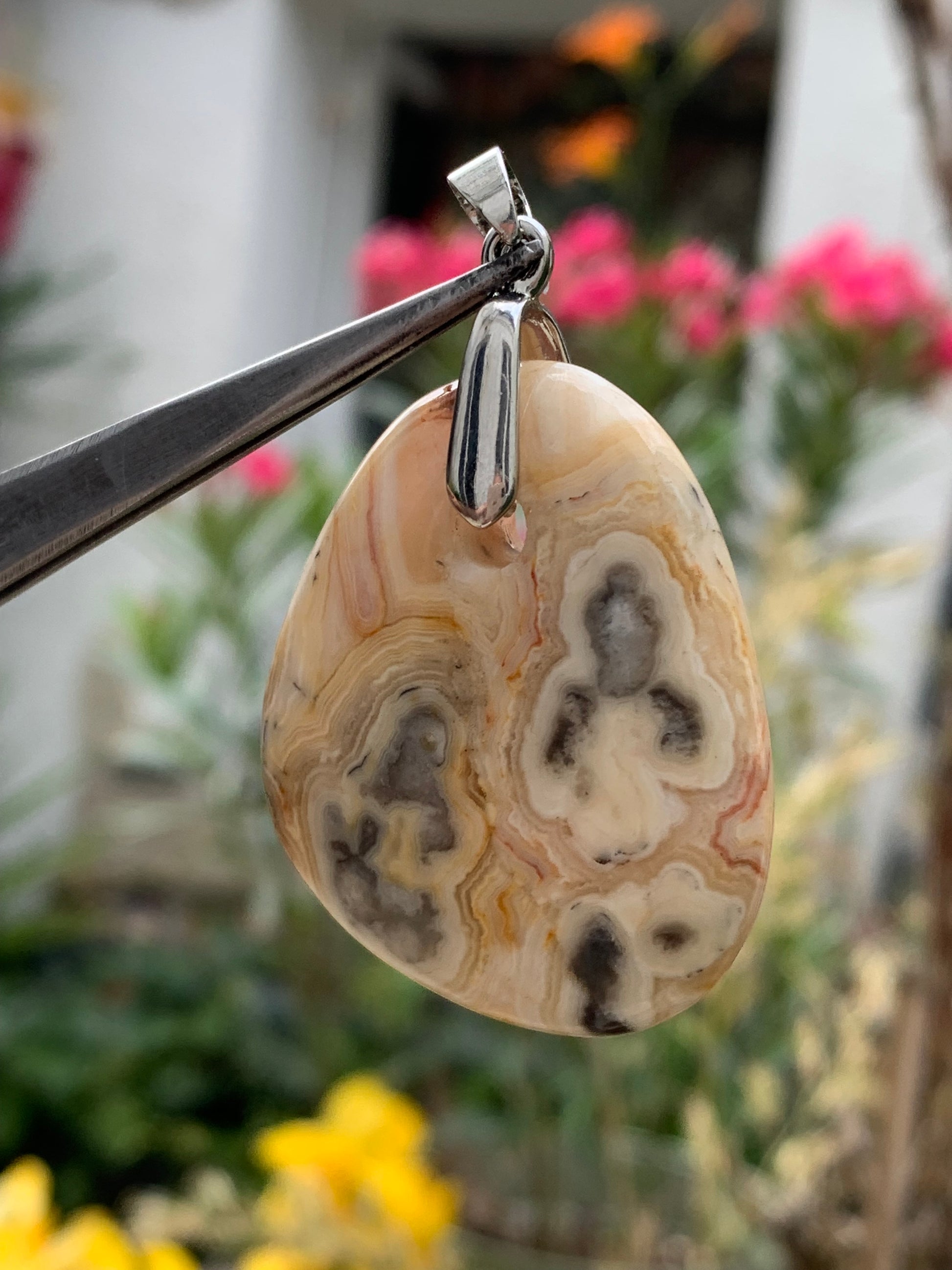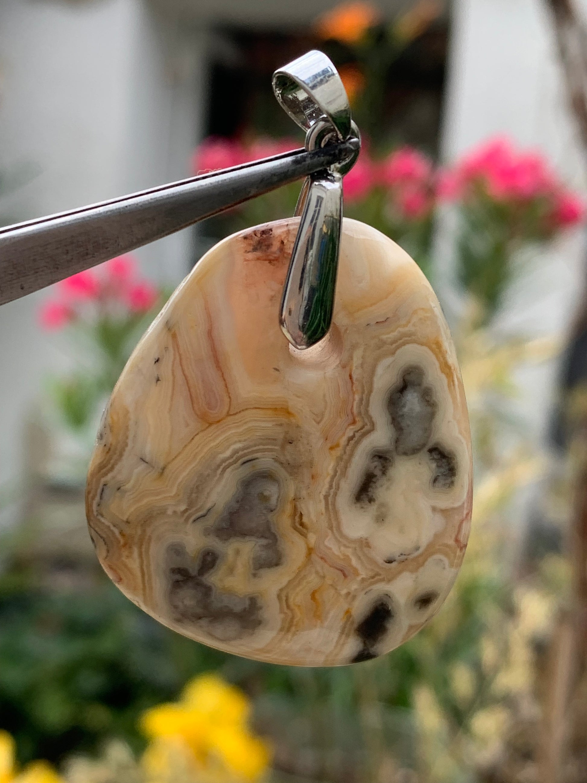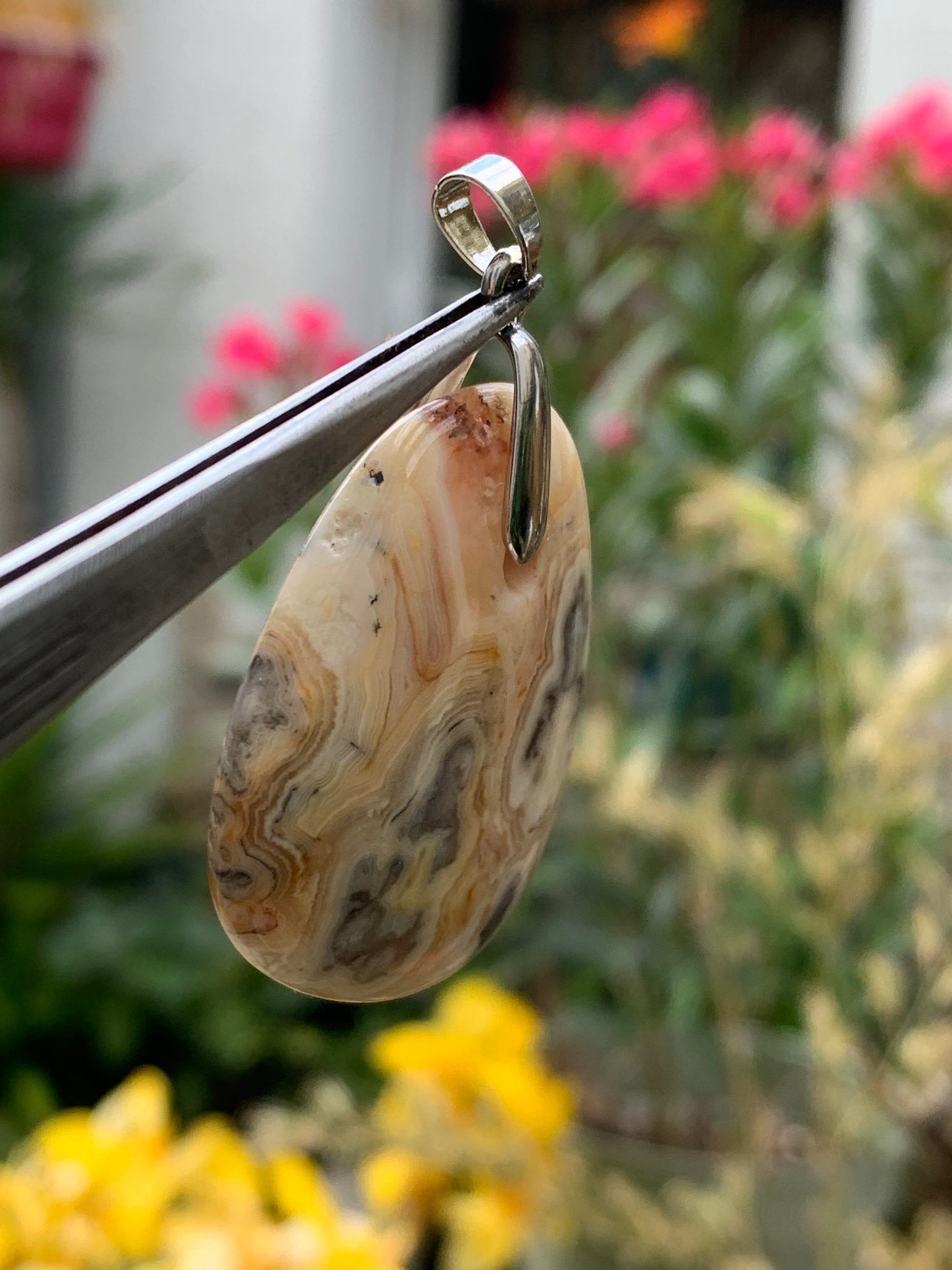 Agate crazy lace, galet percé de 42mm de hauteur x35 de largeur x12 d'épaisseur. Vendu avec cordon réglable !