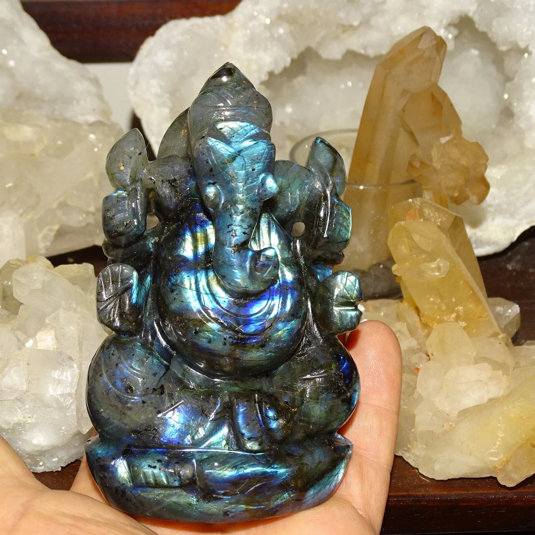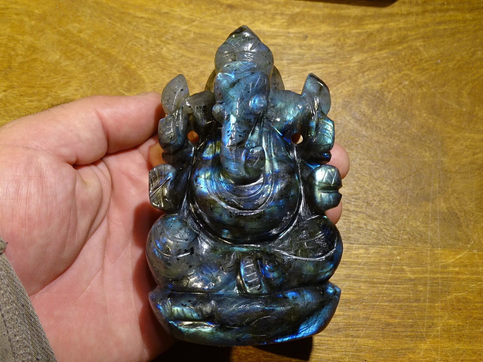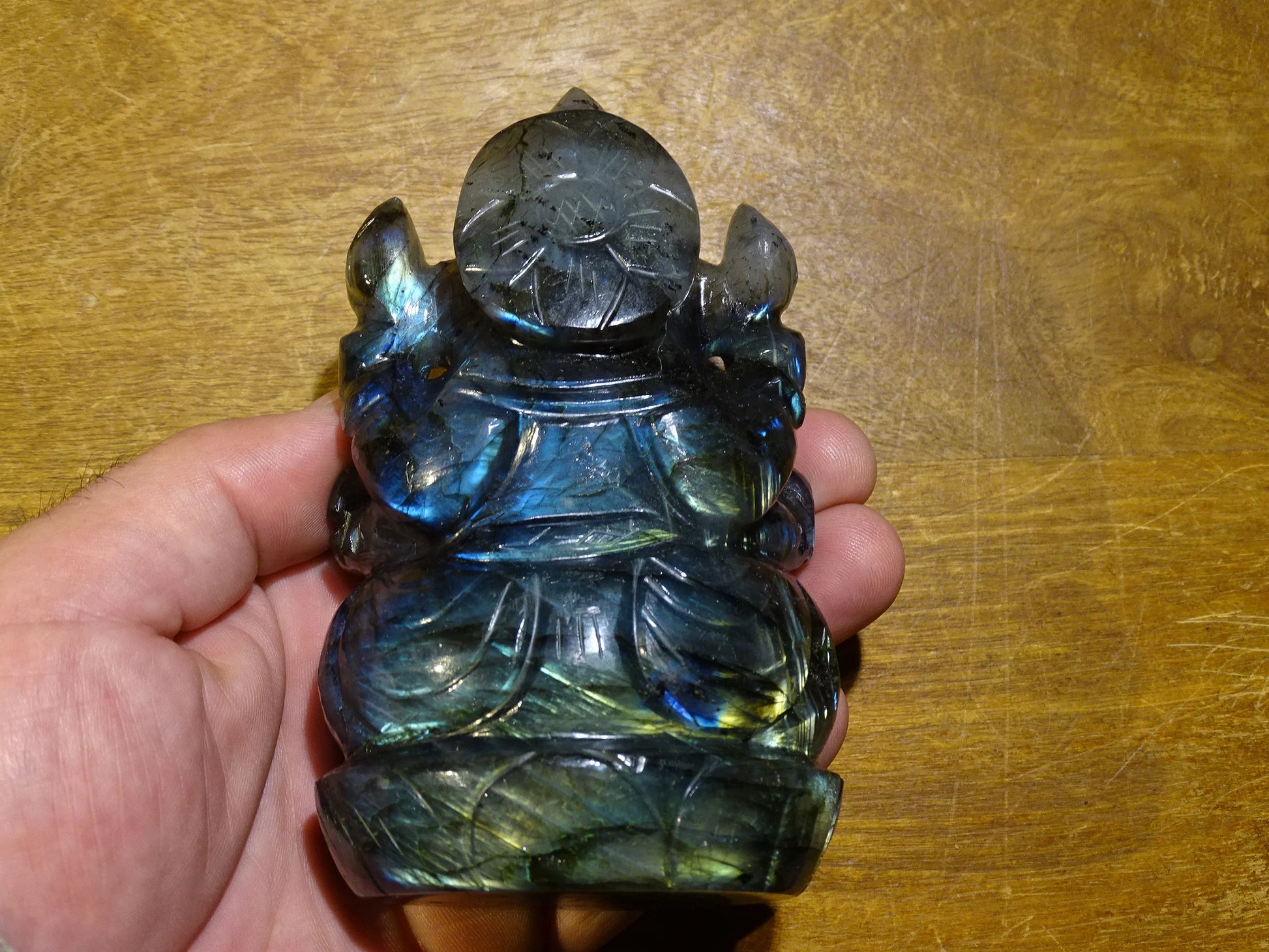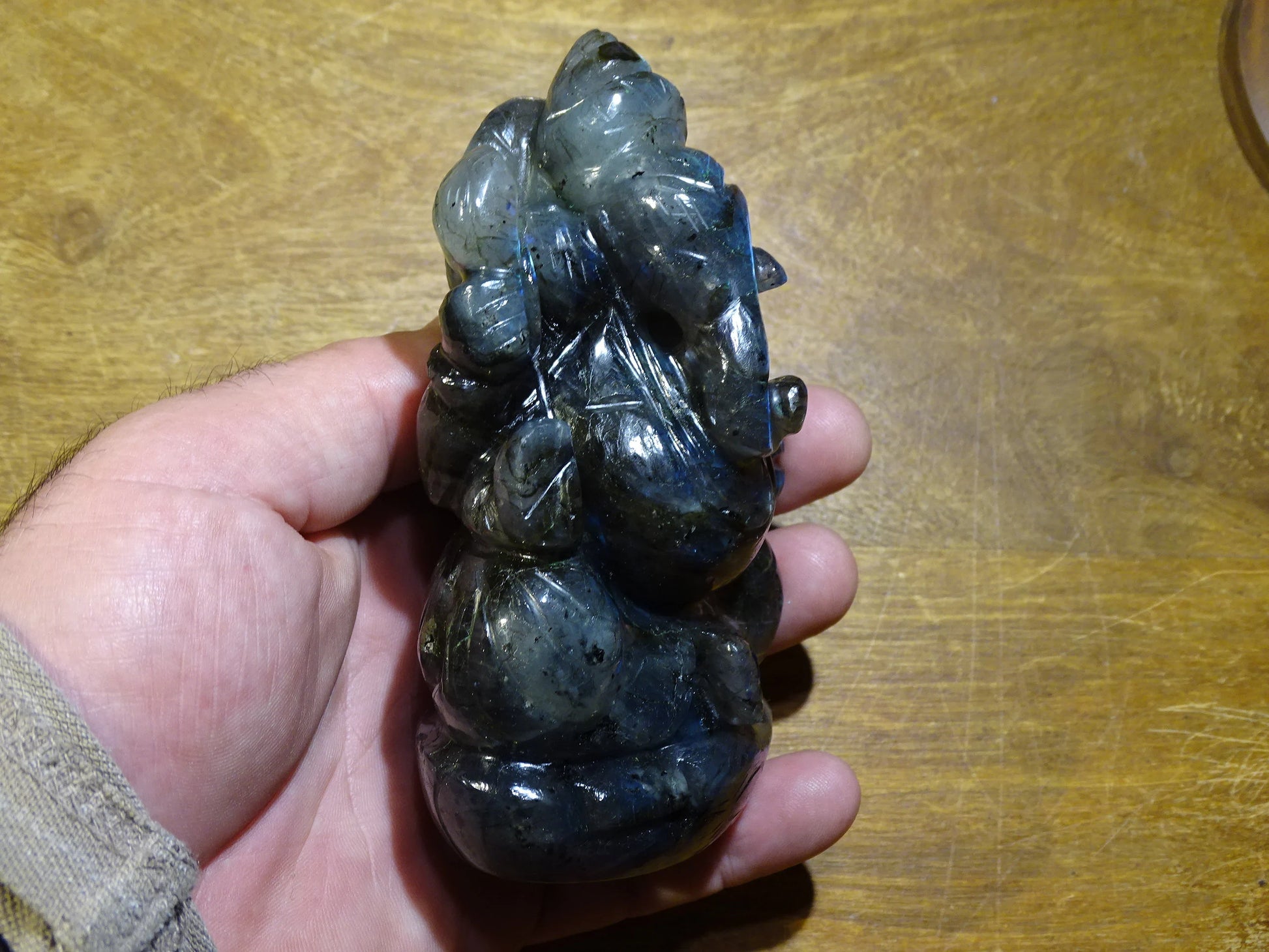 Ganesh en pierre de 'labradorite', fait main, taille de 115 millimètres de hauteur x 85 x 48 - 510 grammes. Superbe pièce aux reflets bleutés incroyable pour 1 divinité Hindouiste éternelle !