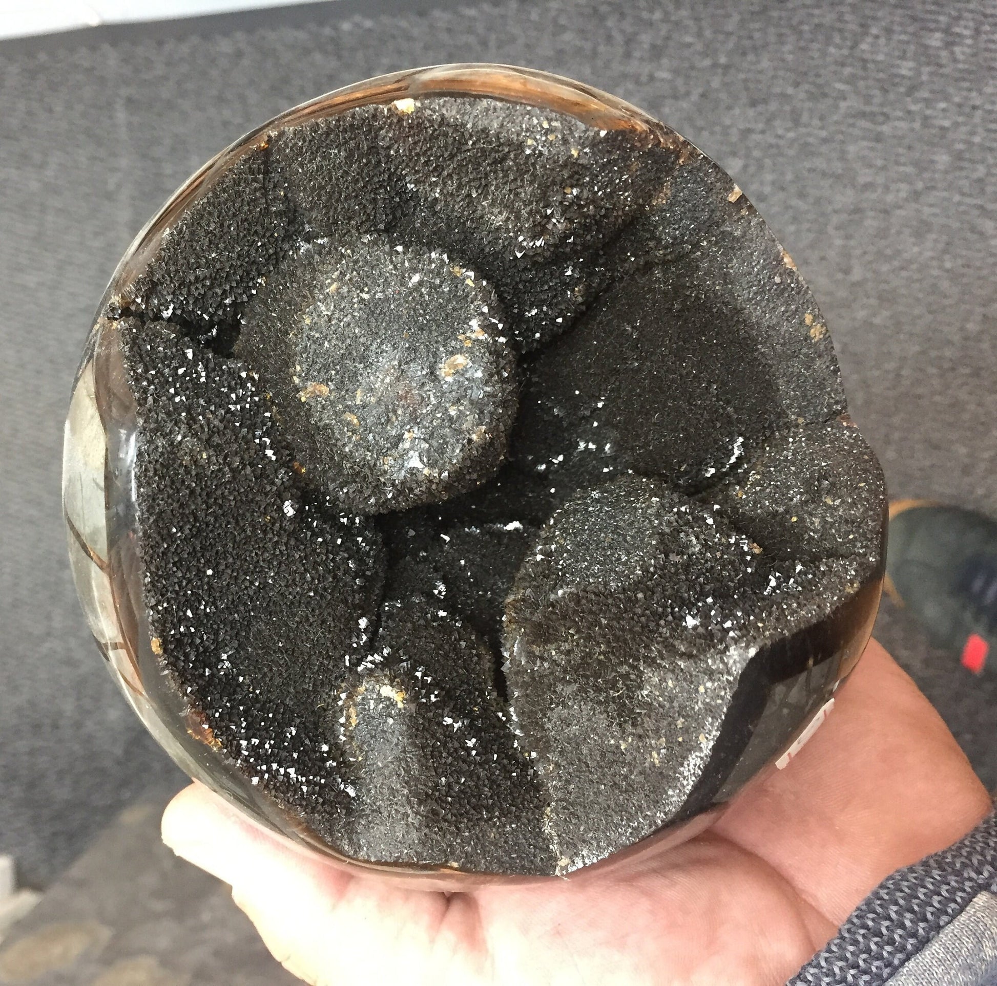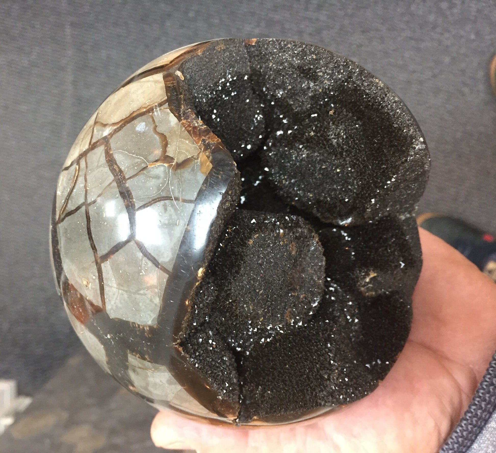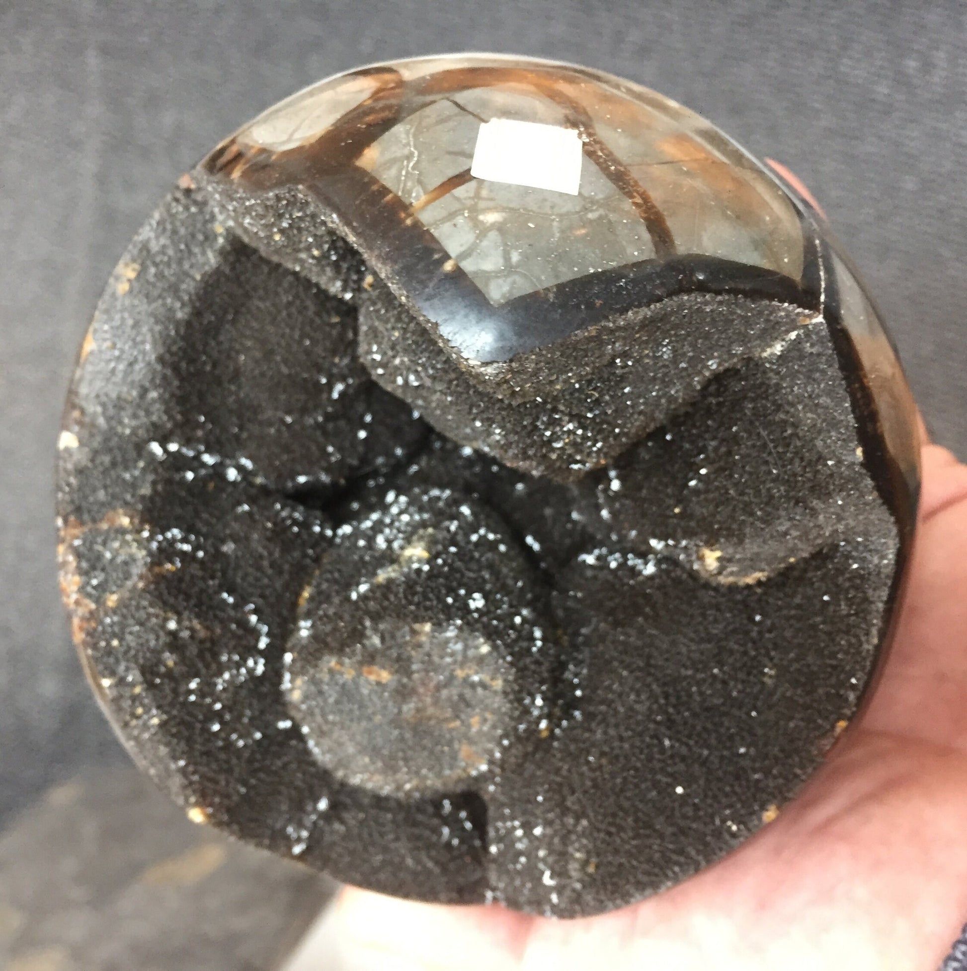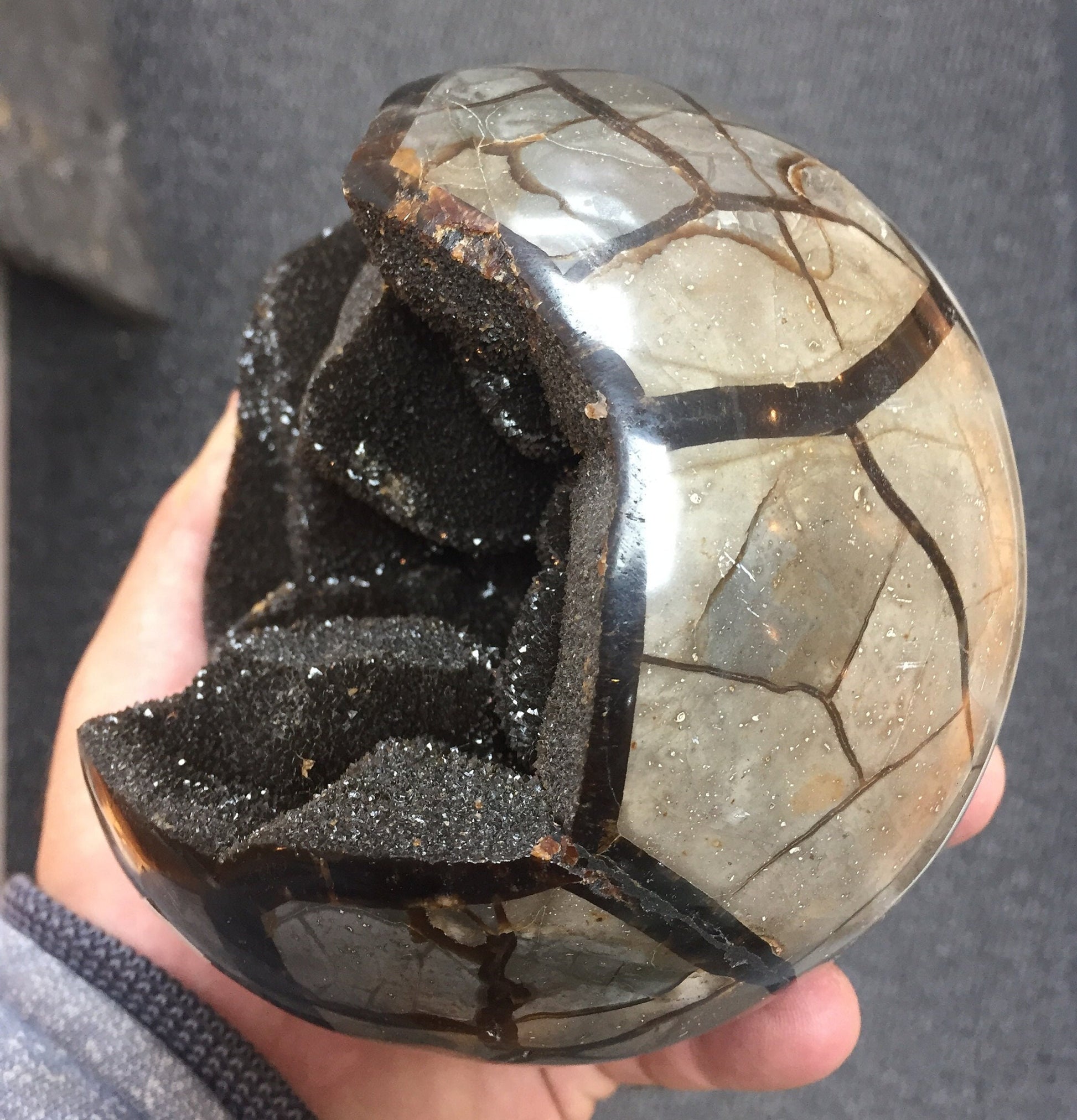 Géode/ sphère XL en Septaria, de 120 millimètres, de 1250 grammes. Magnifique qualité ! Parfait pour la lithothérapie, collection, exposition...!