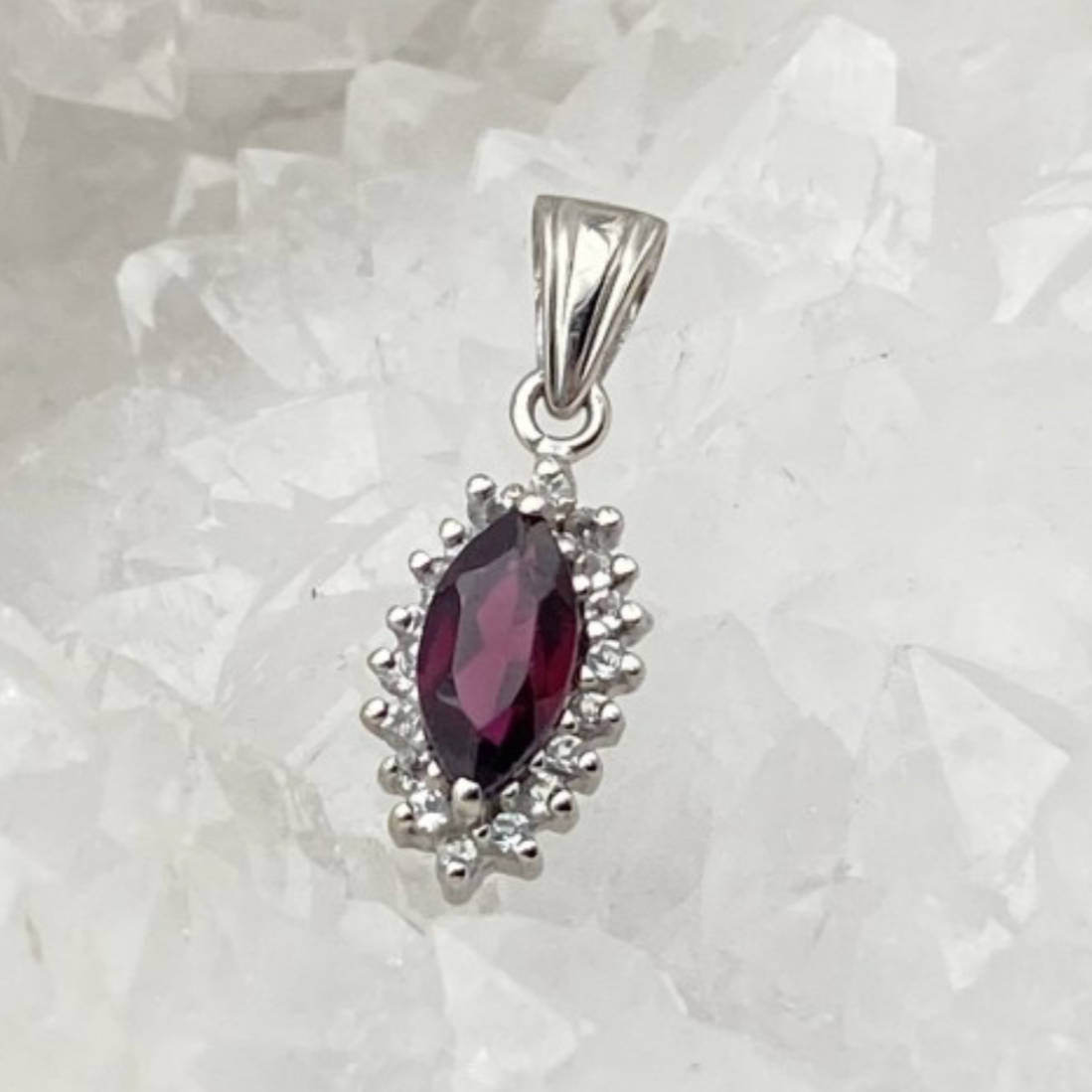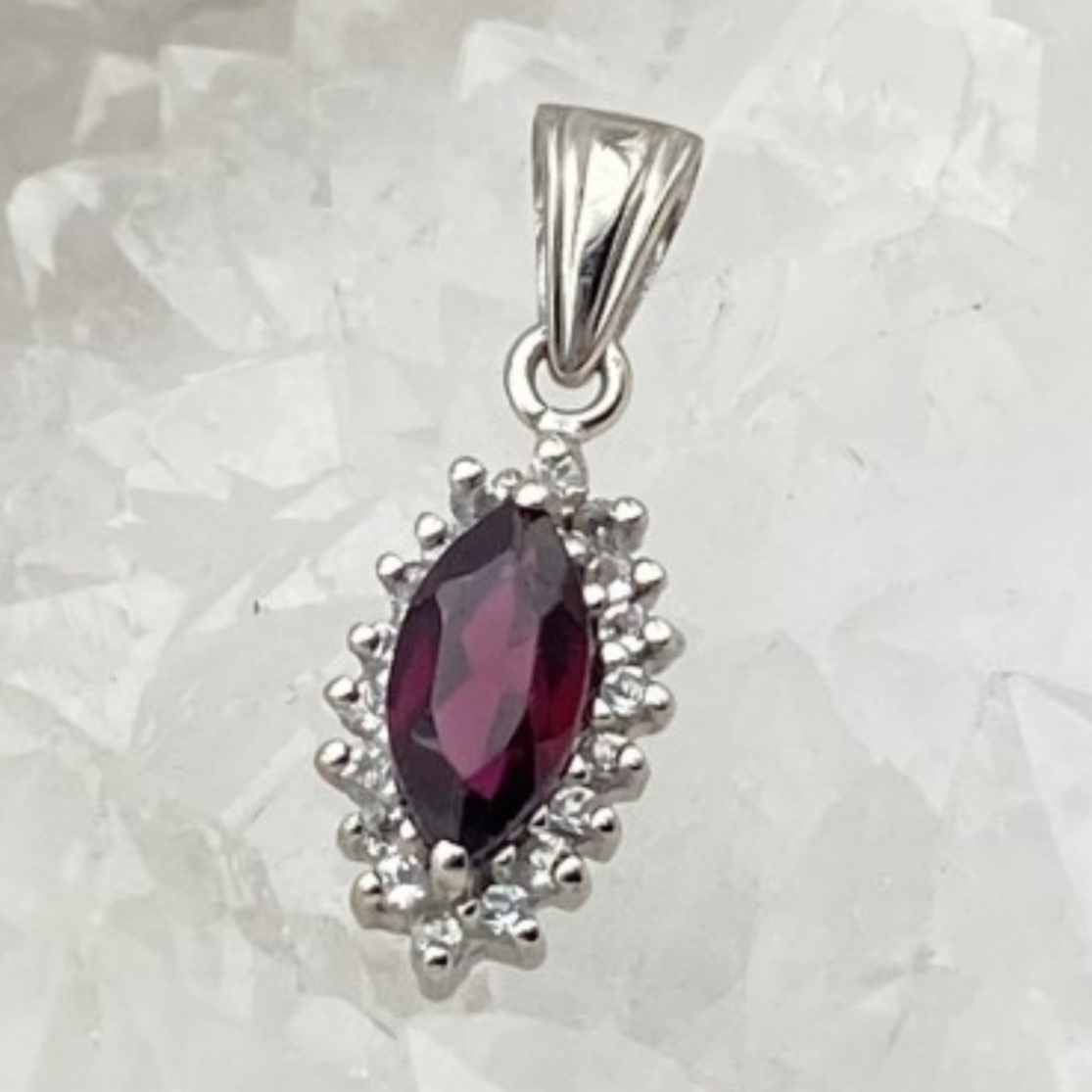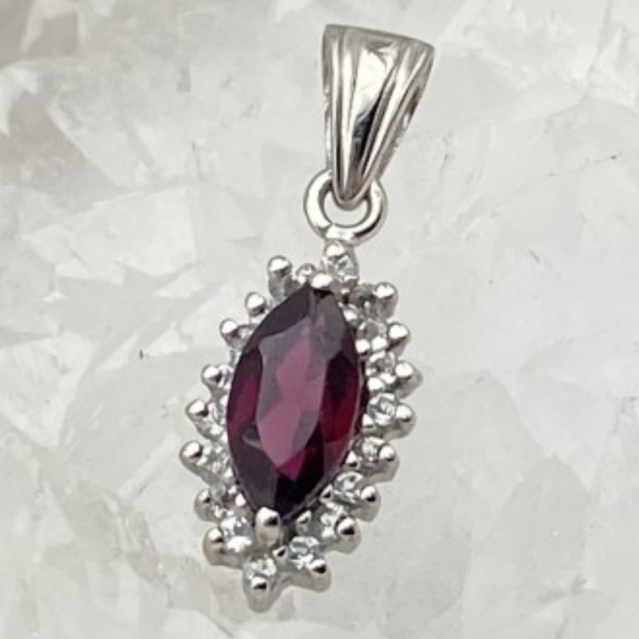 Grenat | Collection Retro' | Pendentif en Argent serti d'une pierre gemme en forme de 'navette', entouré d'Oxyde, 19 x 7 mm !