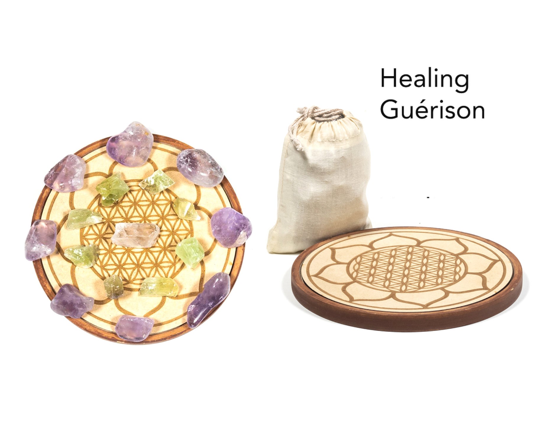 Cadran/ Plateau fleur de vie de 17 cm, avec Améthyste et Calcite verte, kit pour appeler au bien-être, au renforcement de sa force vitale !