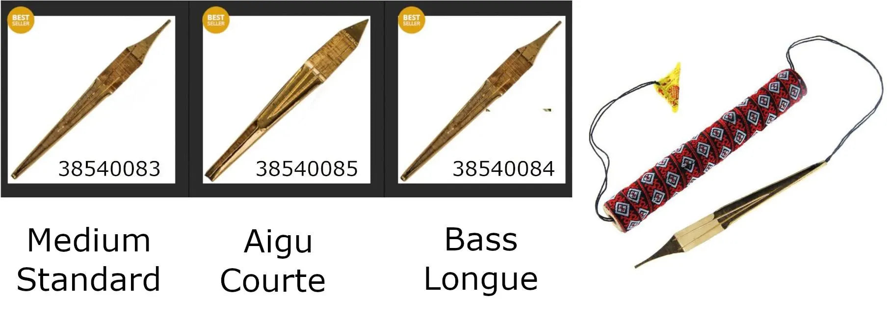 Forme | Lame flexible et fine fixée dans un cadre allongé en forme de spatule ; tenue directement entre les lèvres (contrairement à d’autres guimbardes) |