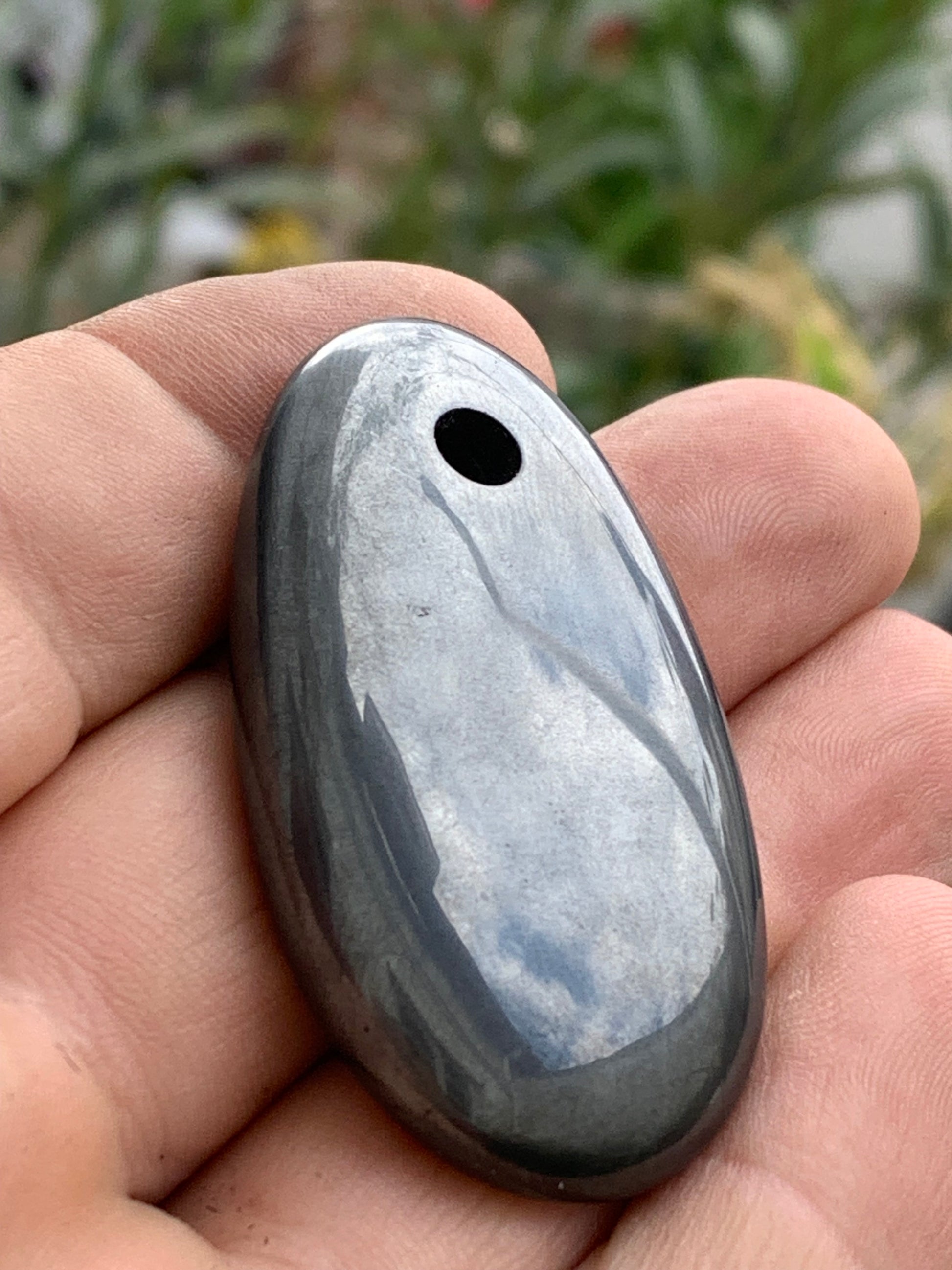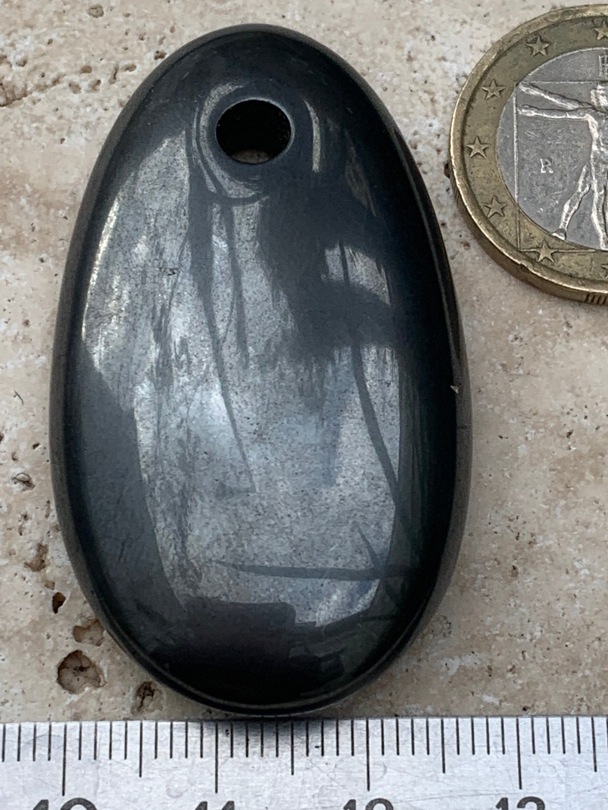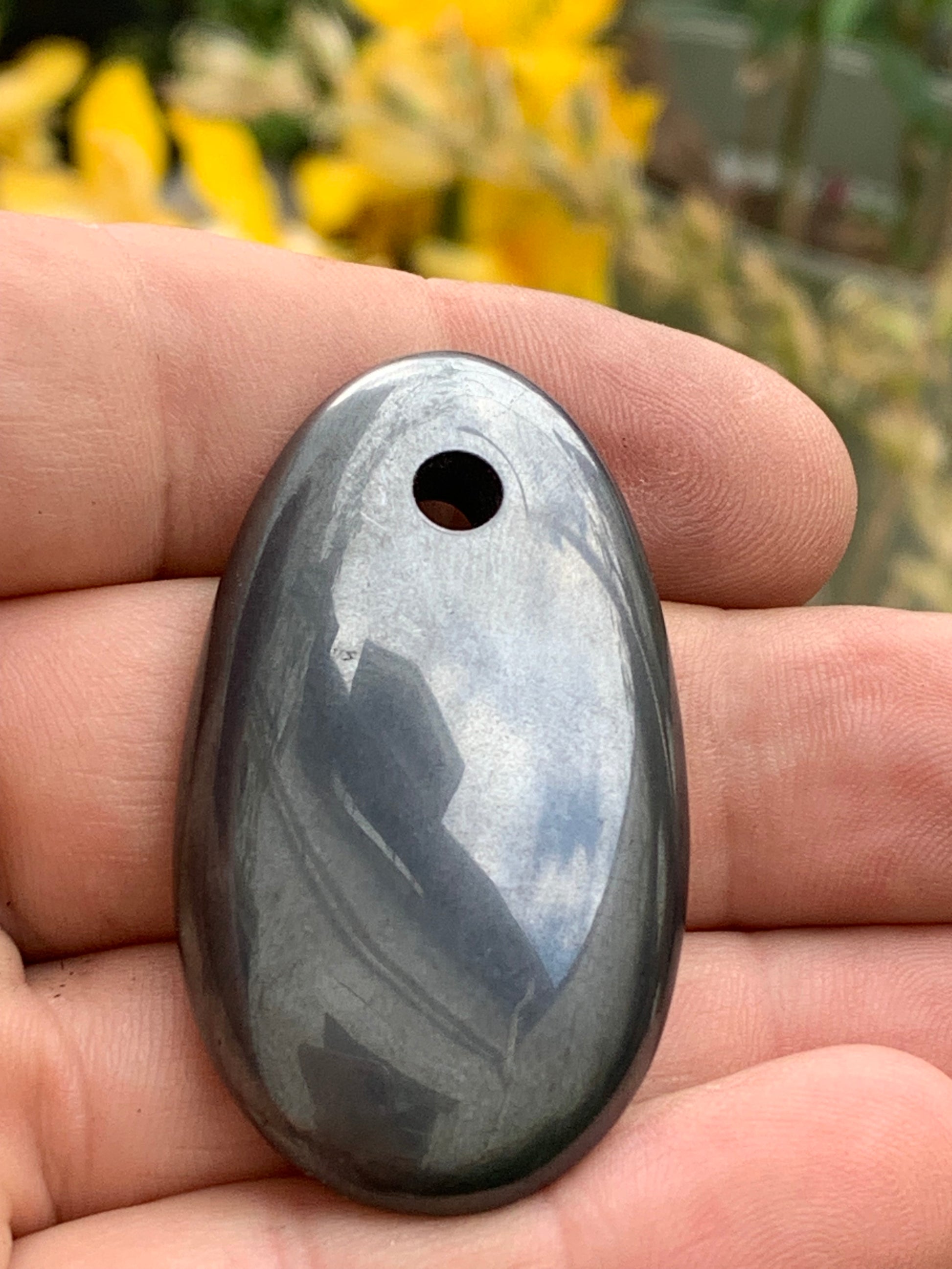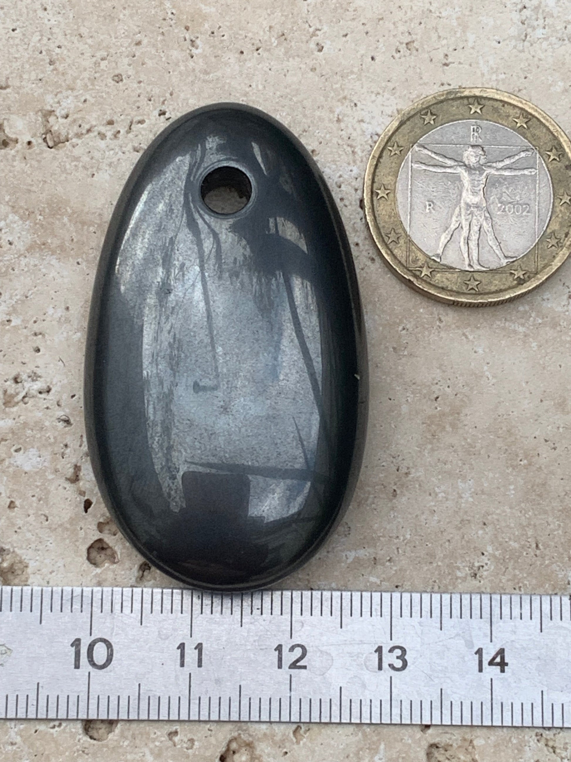 Hématite, pendentif en galet percé, de 50x30x5 millimètres, vendu avec cordon coulissant (réglable), en cuir noir de 40 à 70 centimètres !