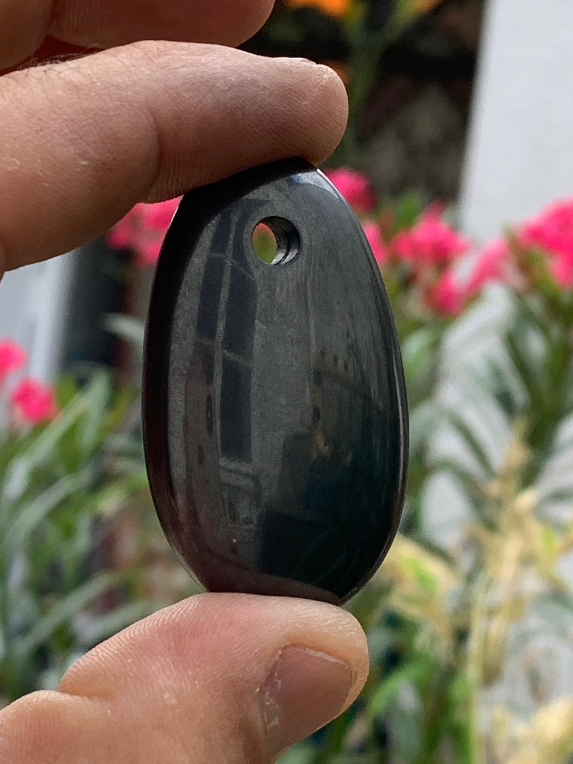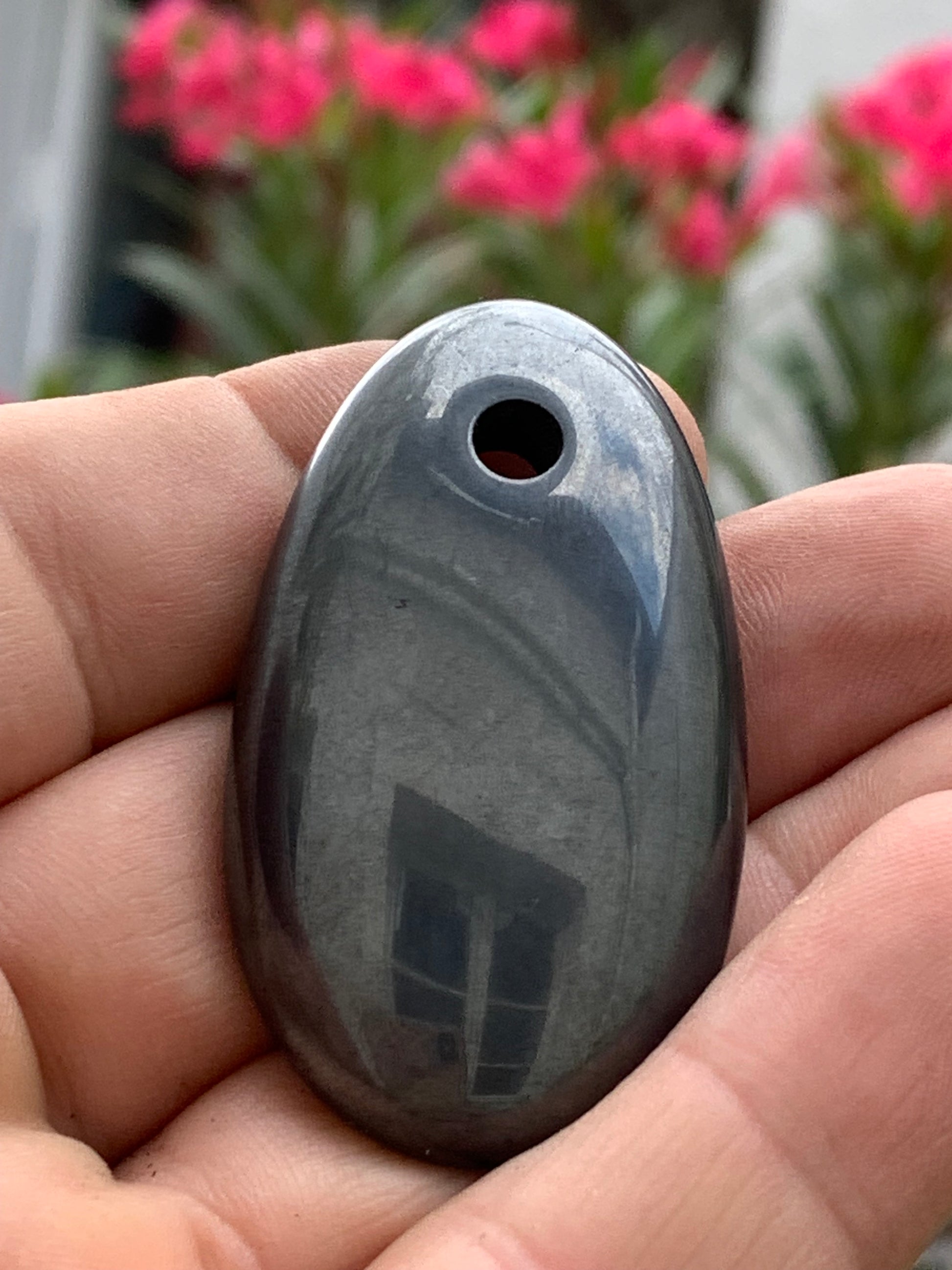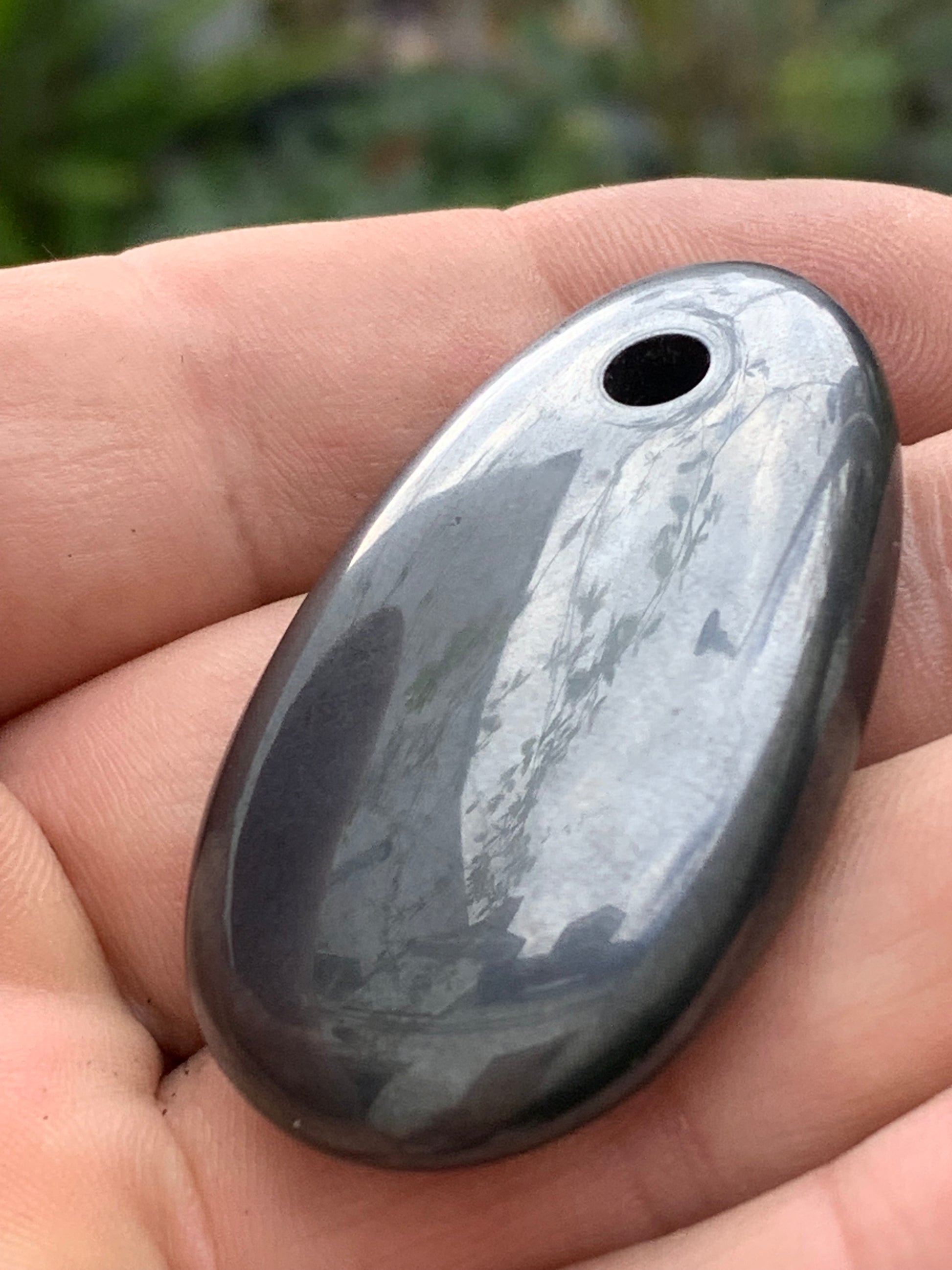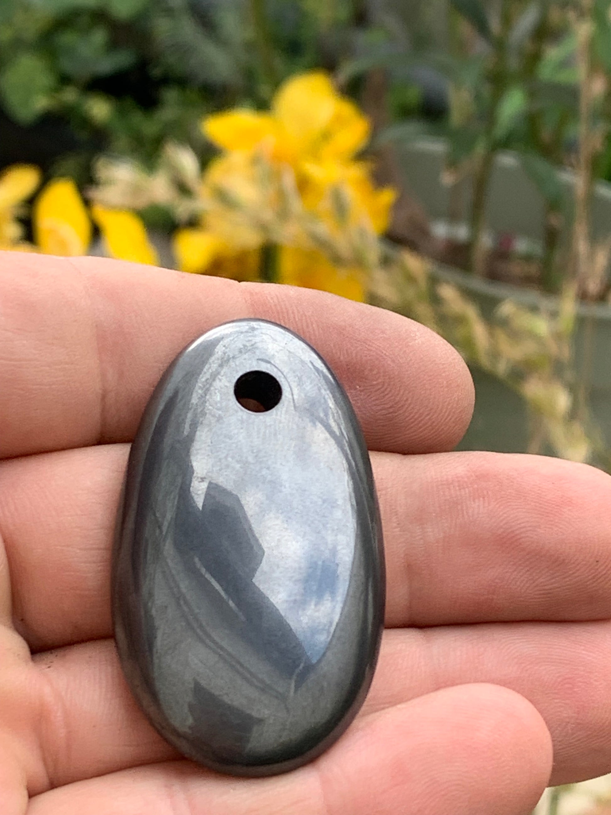 Hématite, pendentif en galet percé, de 50x30x5 millimètres, vendu avec cordon coulissant (réglable), en cuir noir de 40 à 70 centimètres !