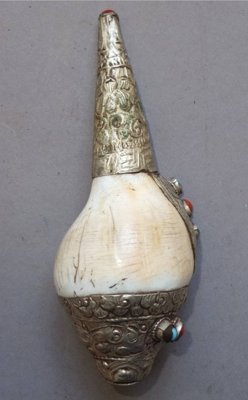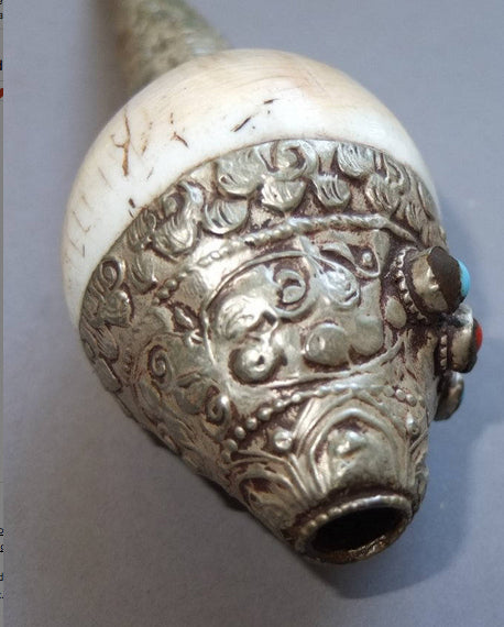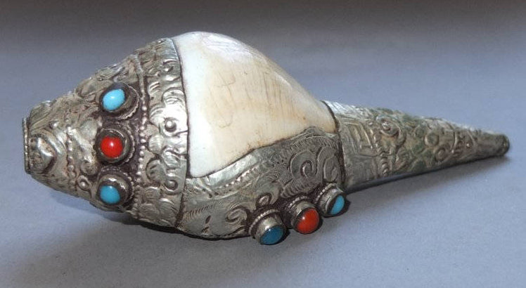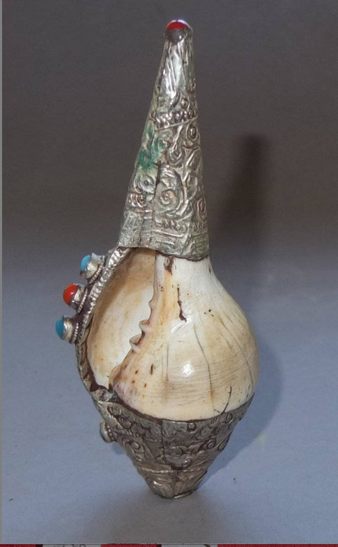 Conque/ Dun du Népal, 22 x 6 centimètres x 6 de hauteur. Avec métal ciselé et incrustation de pierres en corail et en turquoise, superbe et authentique pièce !