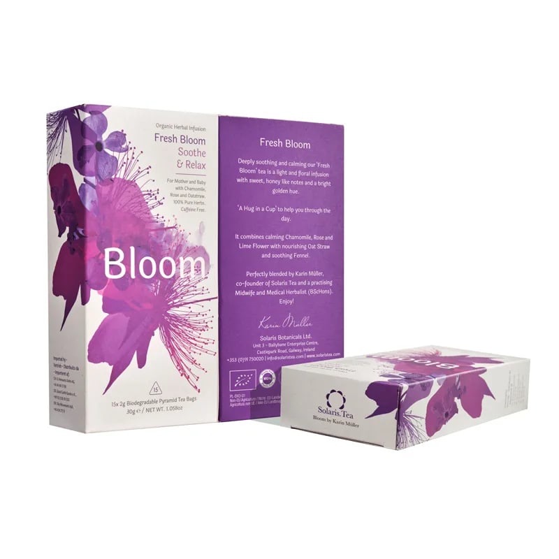 2/ Fresh Bloom Tea est une infusion légère et florale avec des notes douces et miellées et une teinte dorée brillante. Il associe la camomille, la rose et la fleur de tilleul apaisantes à la paille d'avoine et au fenouil apaisants. Profondément apaisant et calmant, ce thé est «Un câlin dans une tasse» pour toute la famille.
