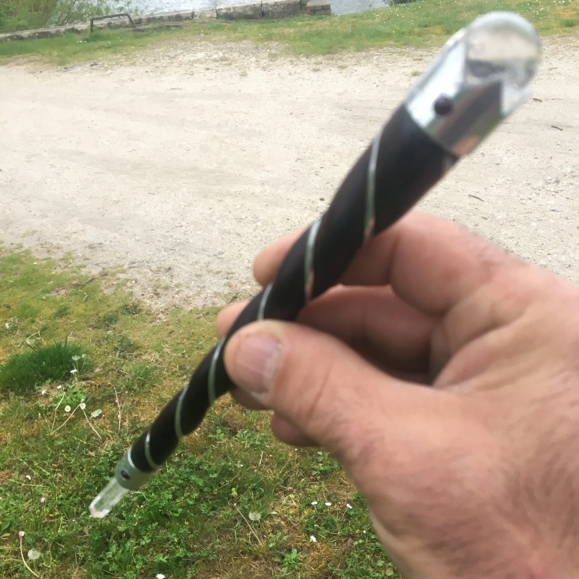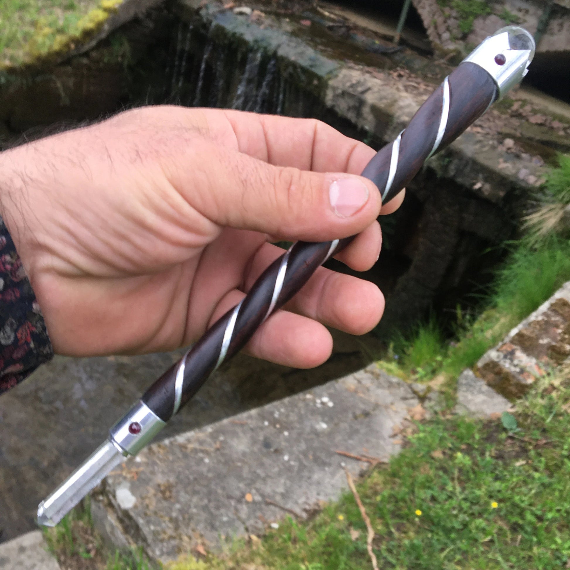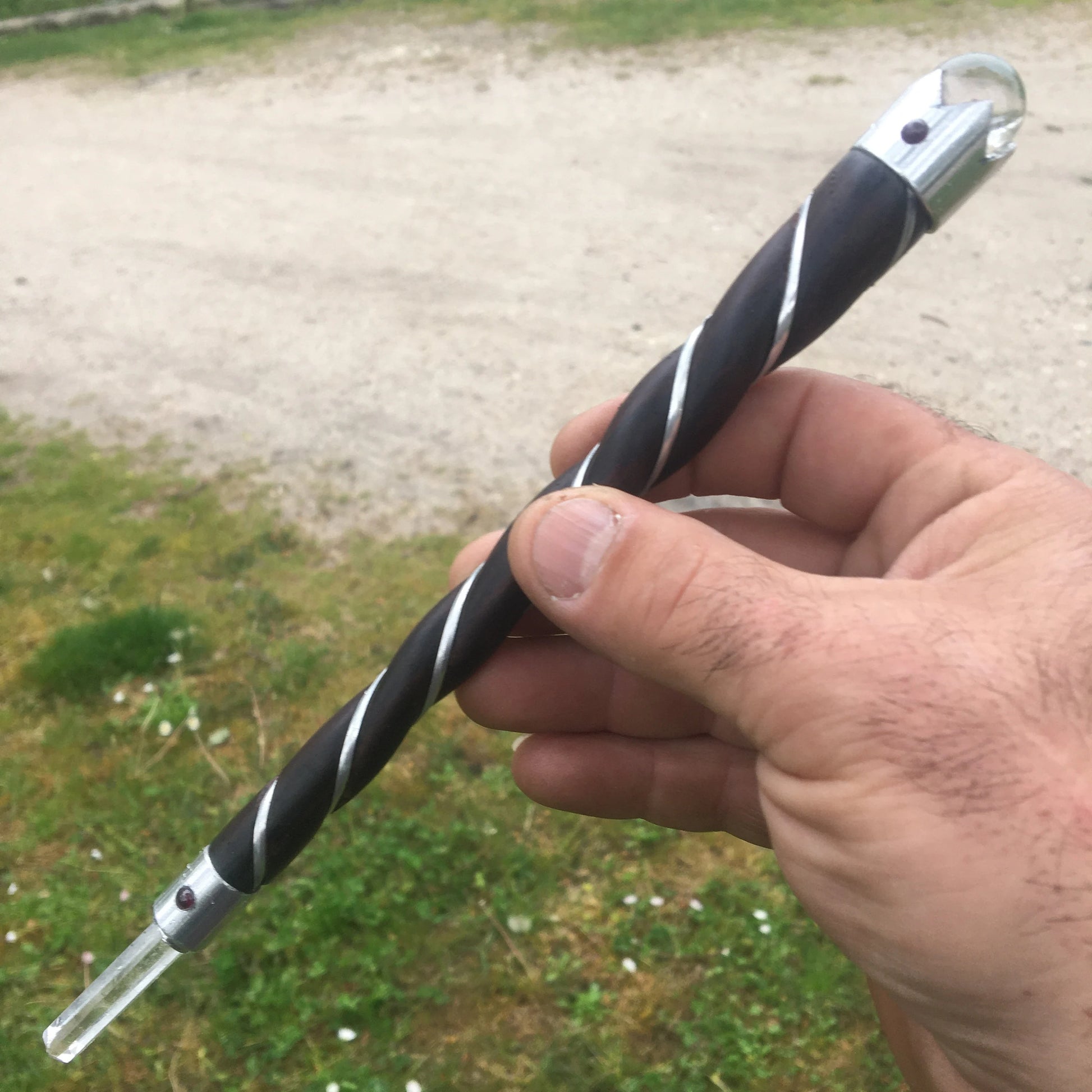 Baguette pour rituel énergétique – Bois de rose, pointe et sphère en cristal de roche, superbe !