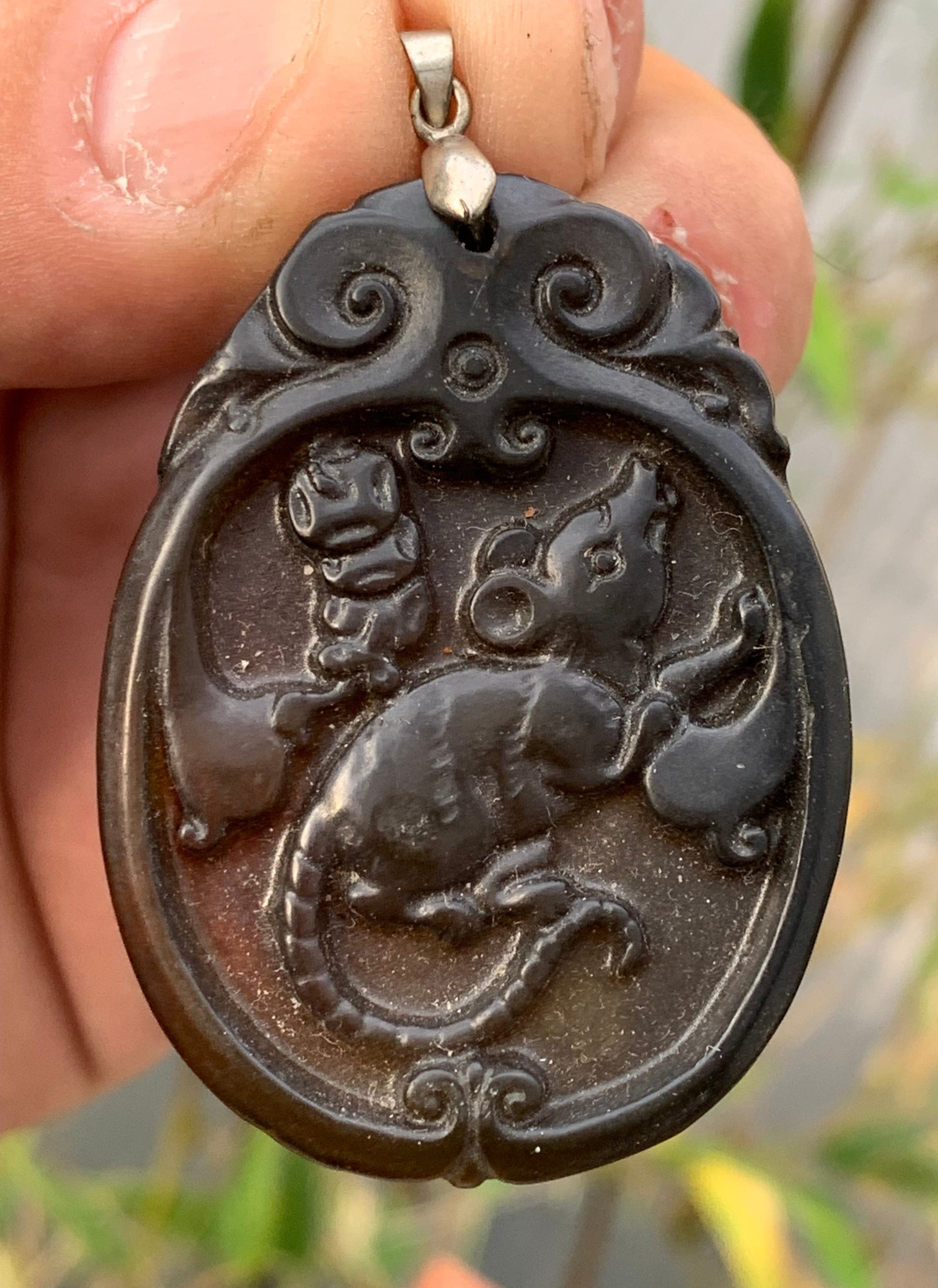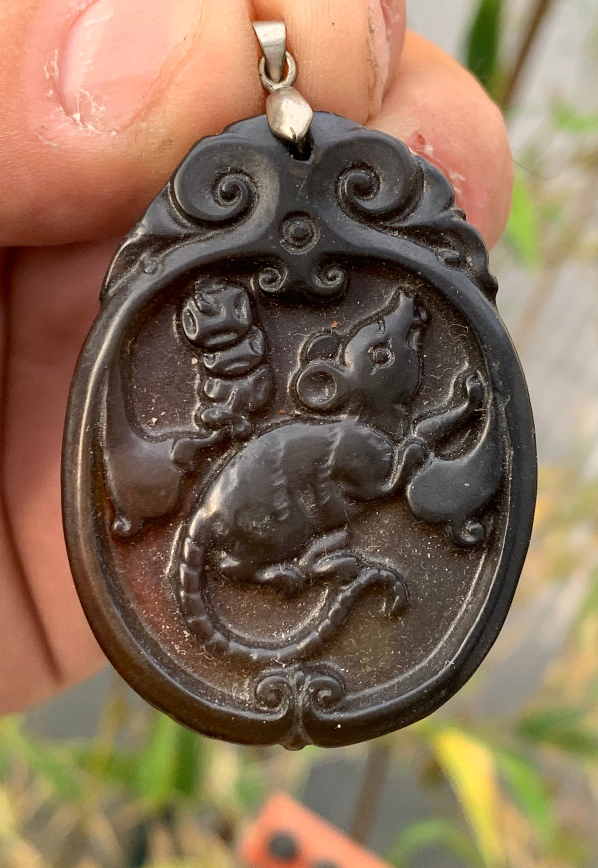 Jade néphrite, pendentif signe astrologique Chinois du Rat, 60 mm de hauteur x 37 de largeur x 6 d'épaisseur. Vendu avec cordon réglable de couleur noire.