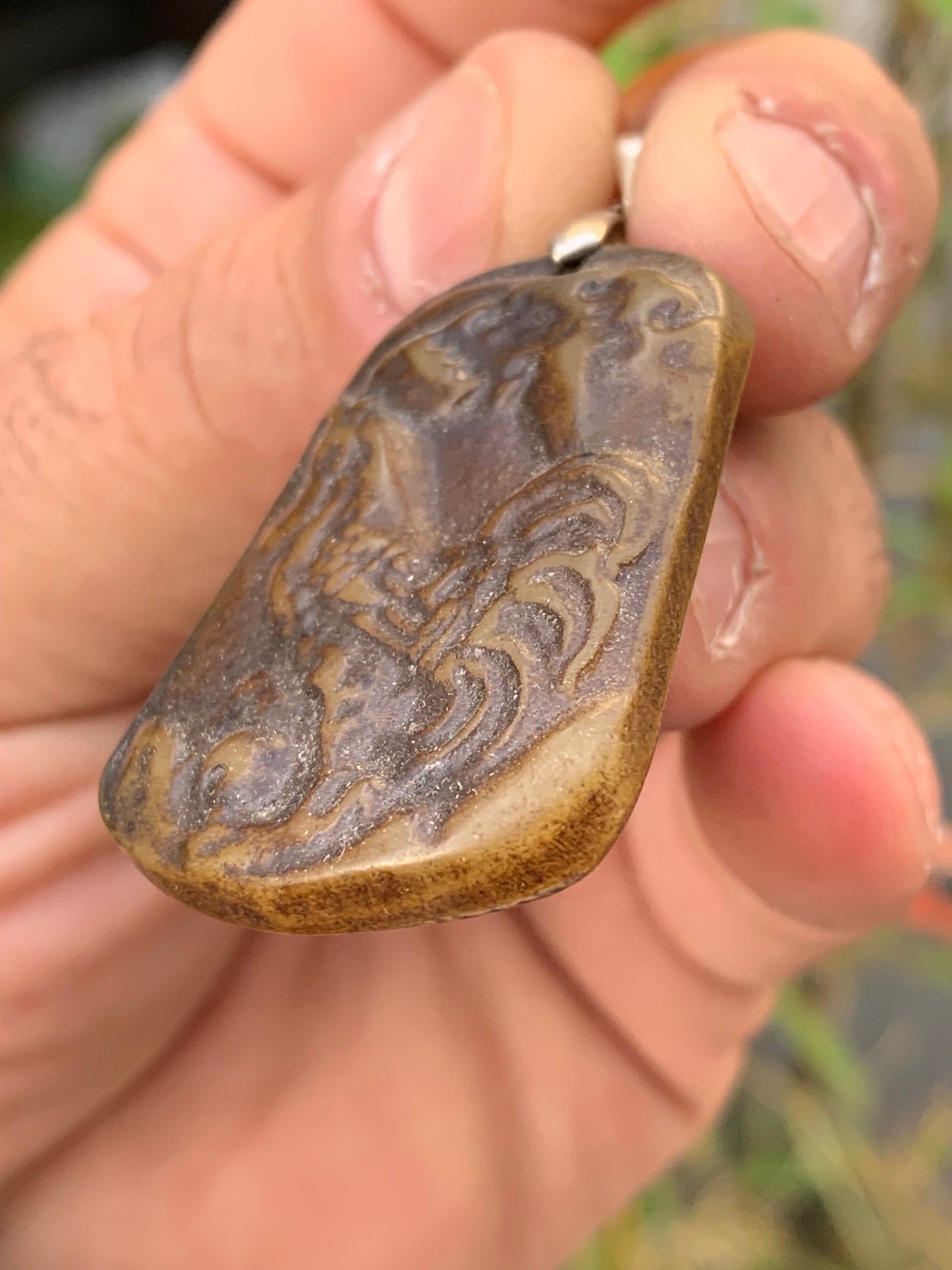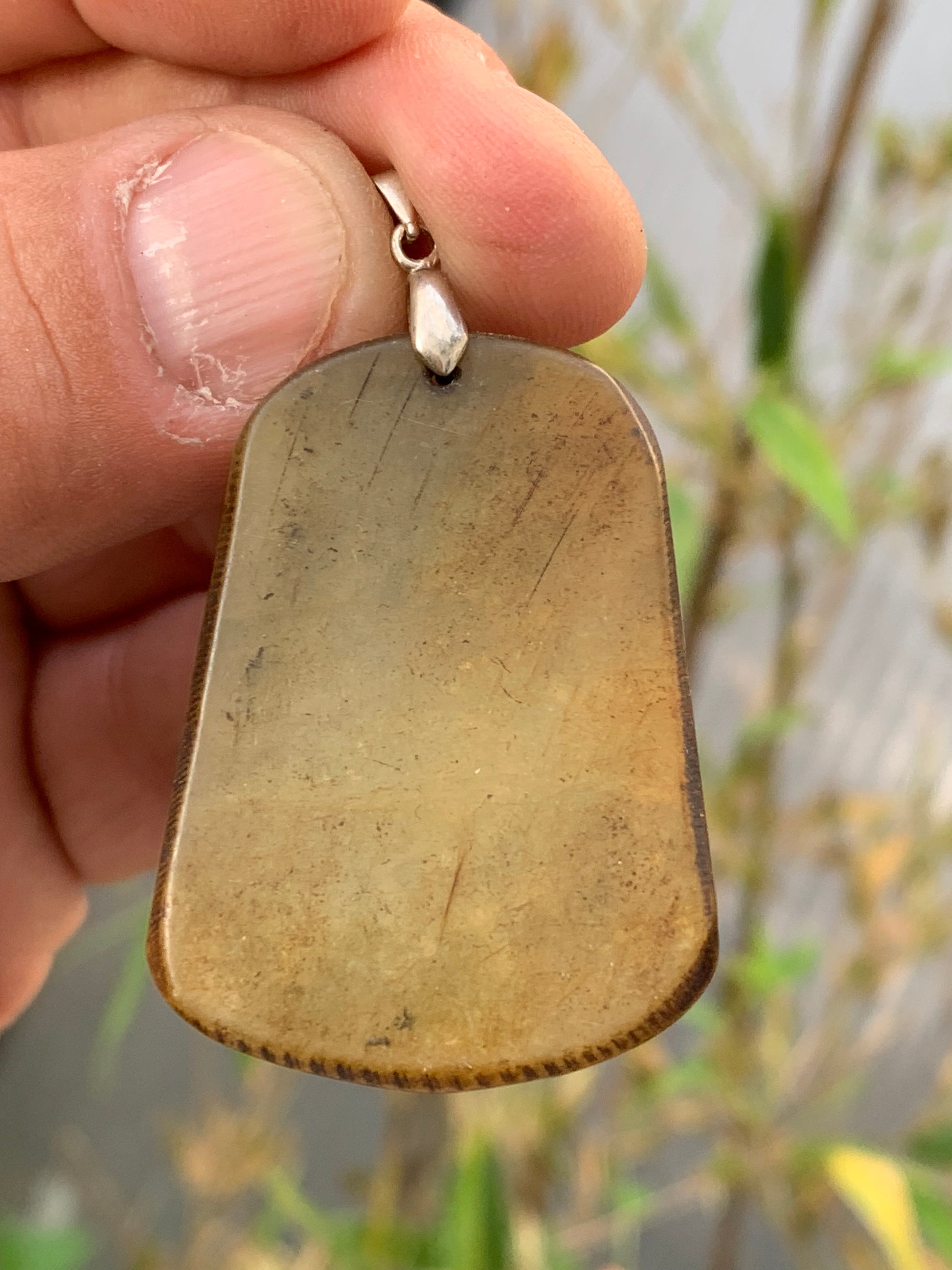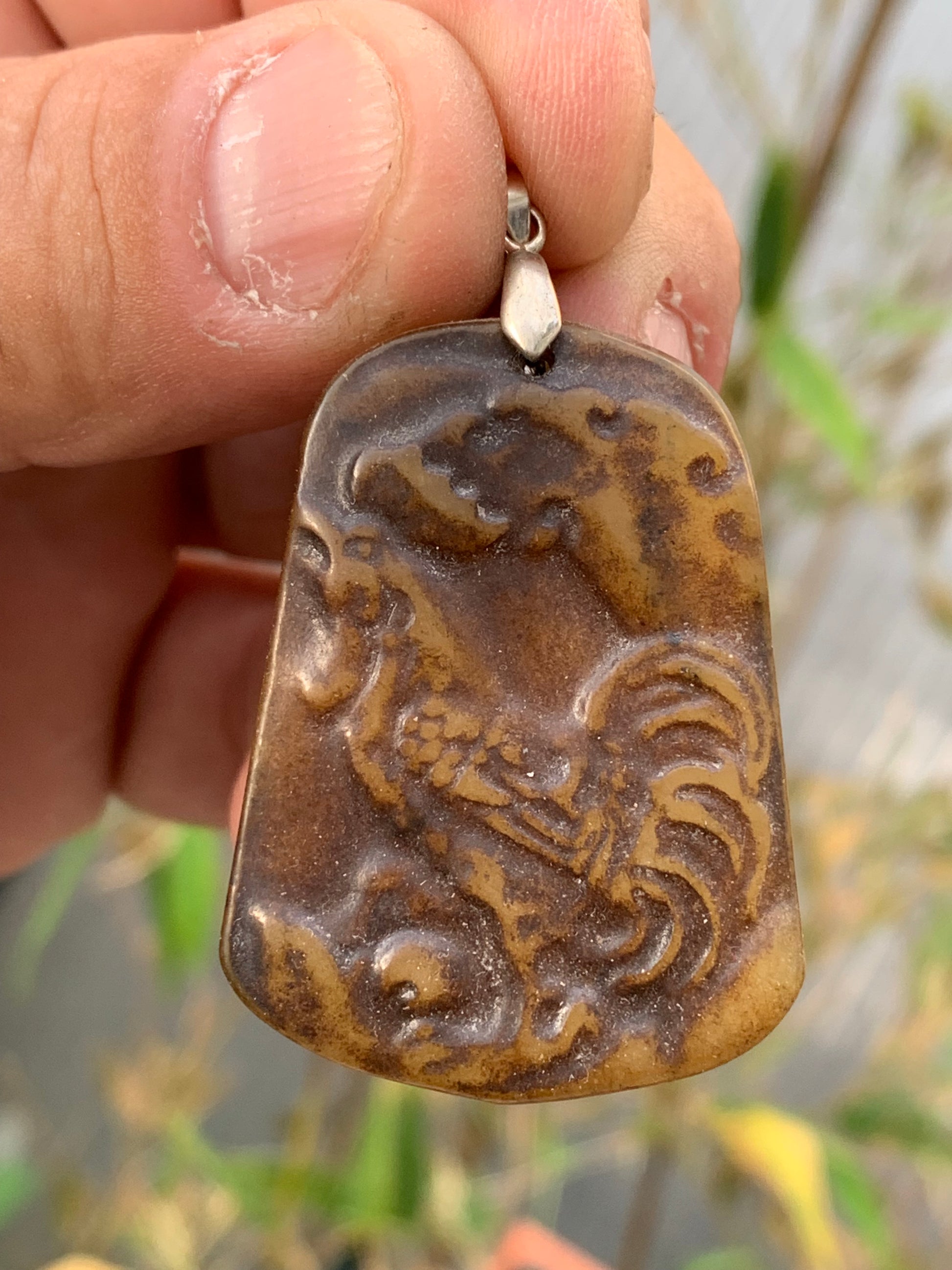 Jade néphrite, pendentif signe astrologique Chinois du Coq, 53 mm de hauteur x 32 de largeur x 6 d'épaisseur. Vendu avec cordon réglable de couleur noire.