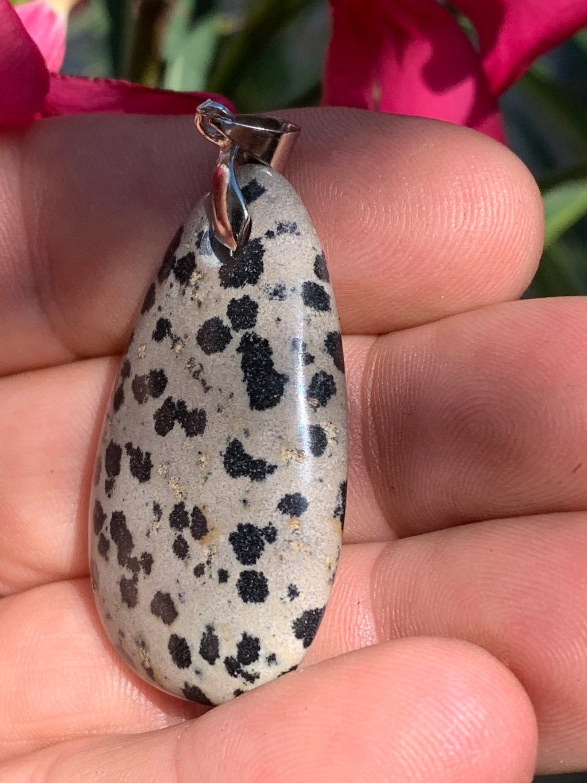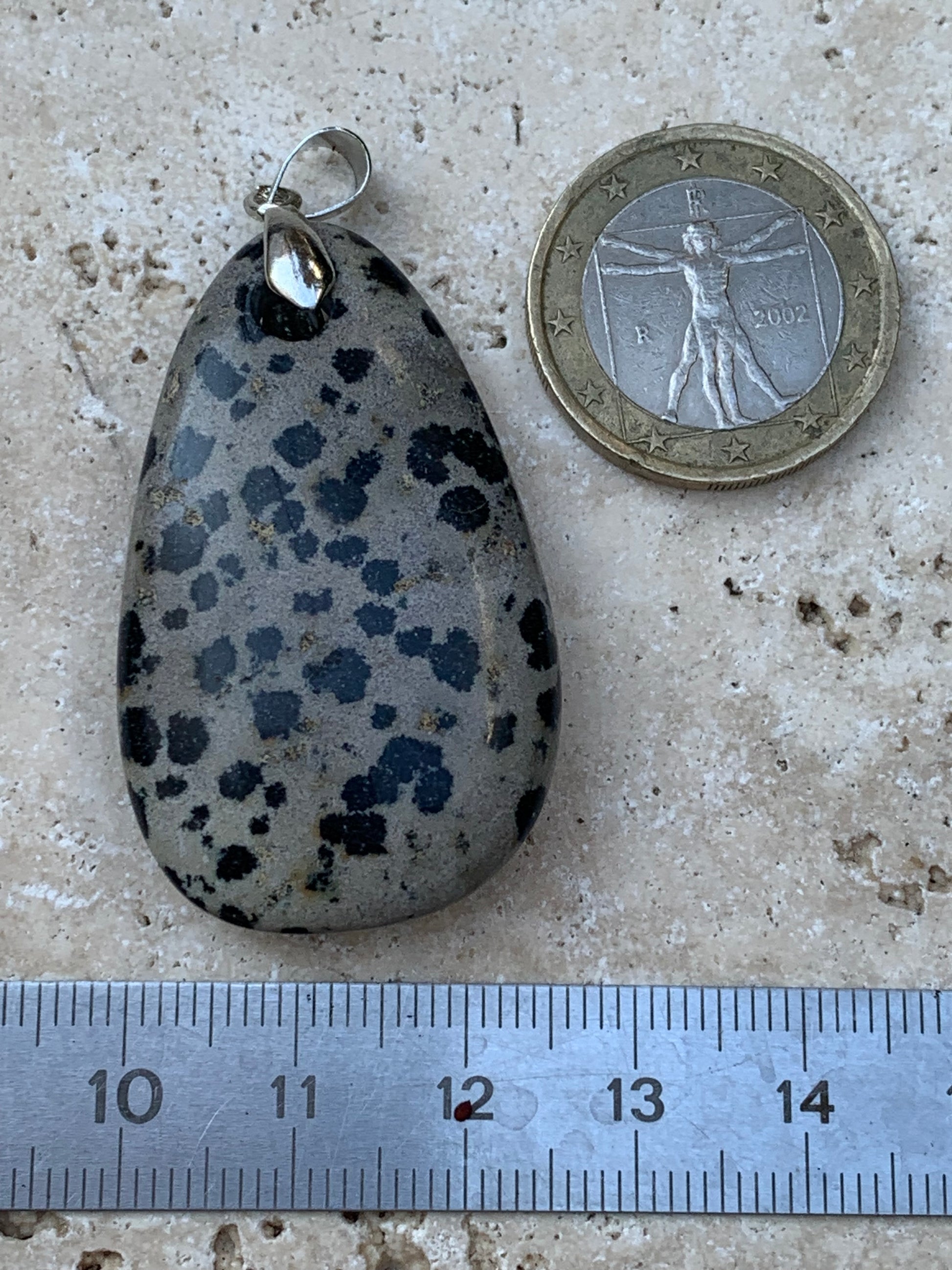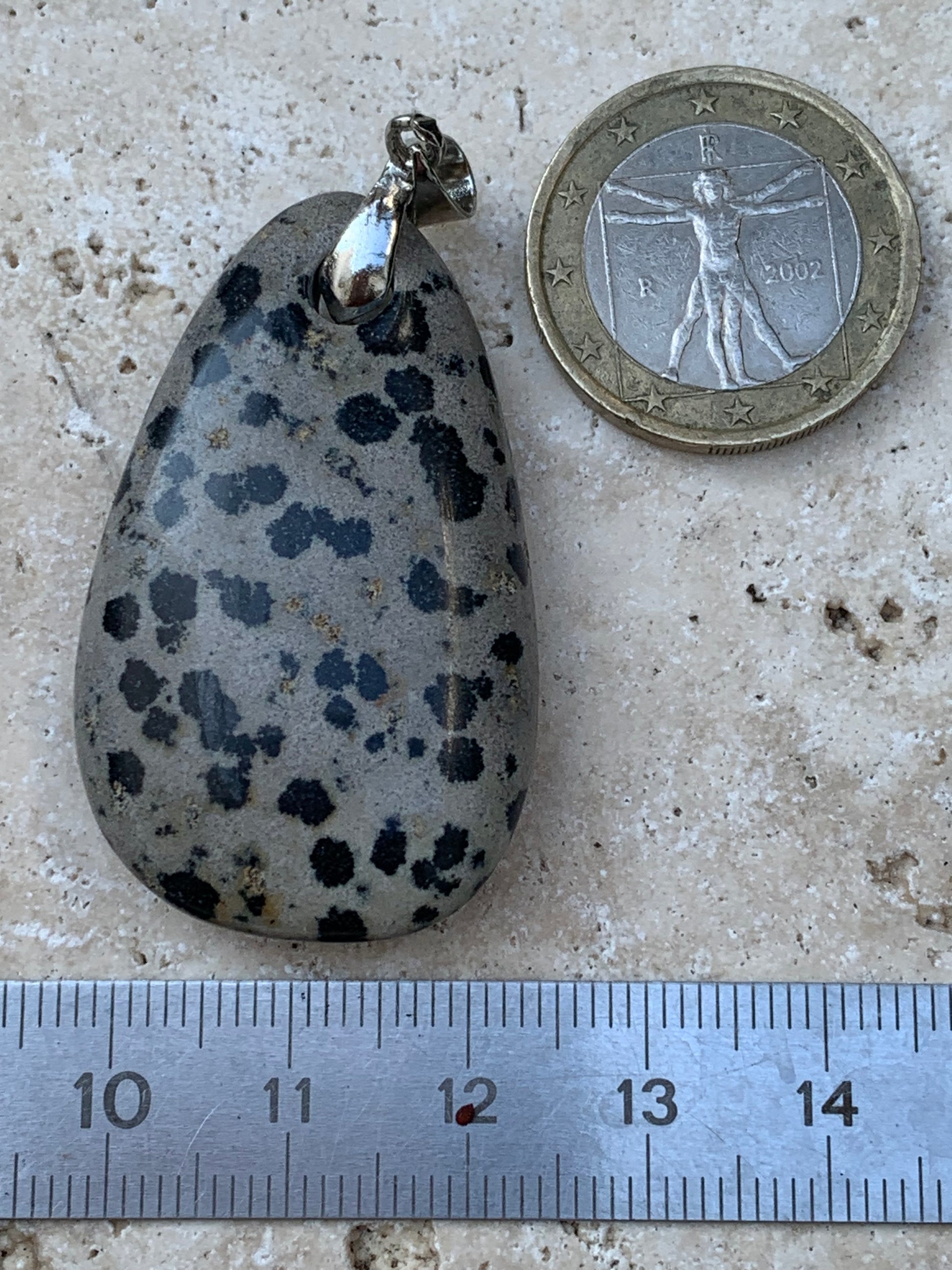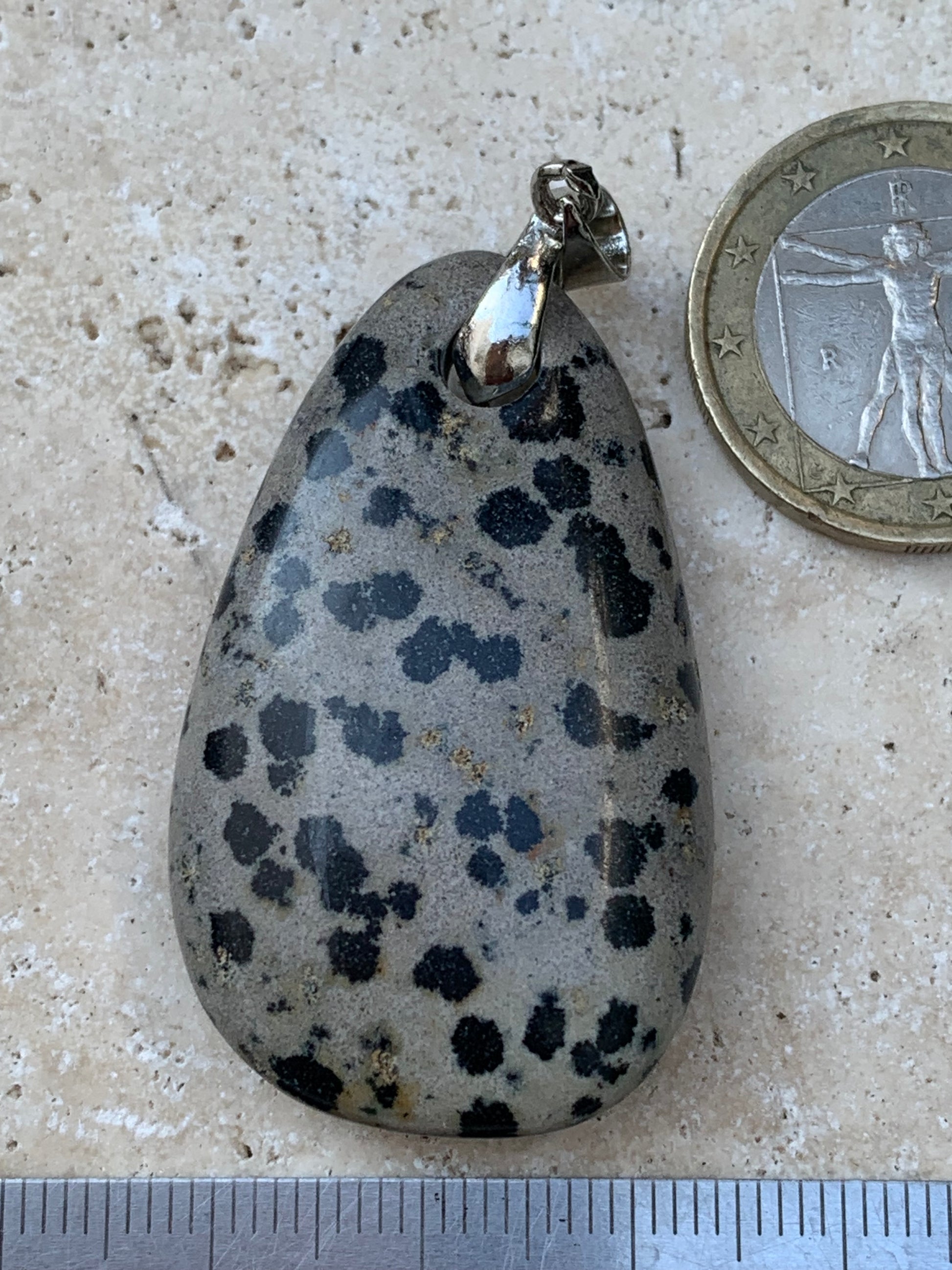 Jaspe Dalmatien, pendentif de 54mm de ht x26 x10. Vendu avec un cordon réglable de couleur noire !