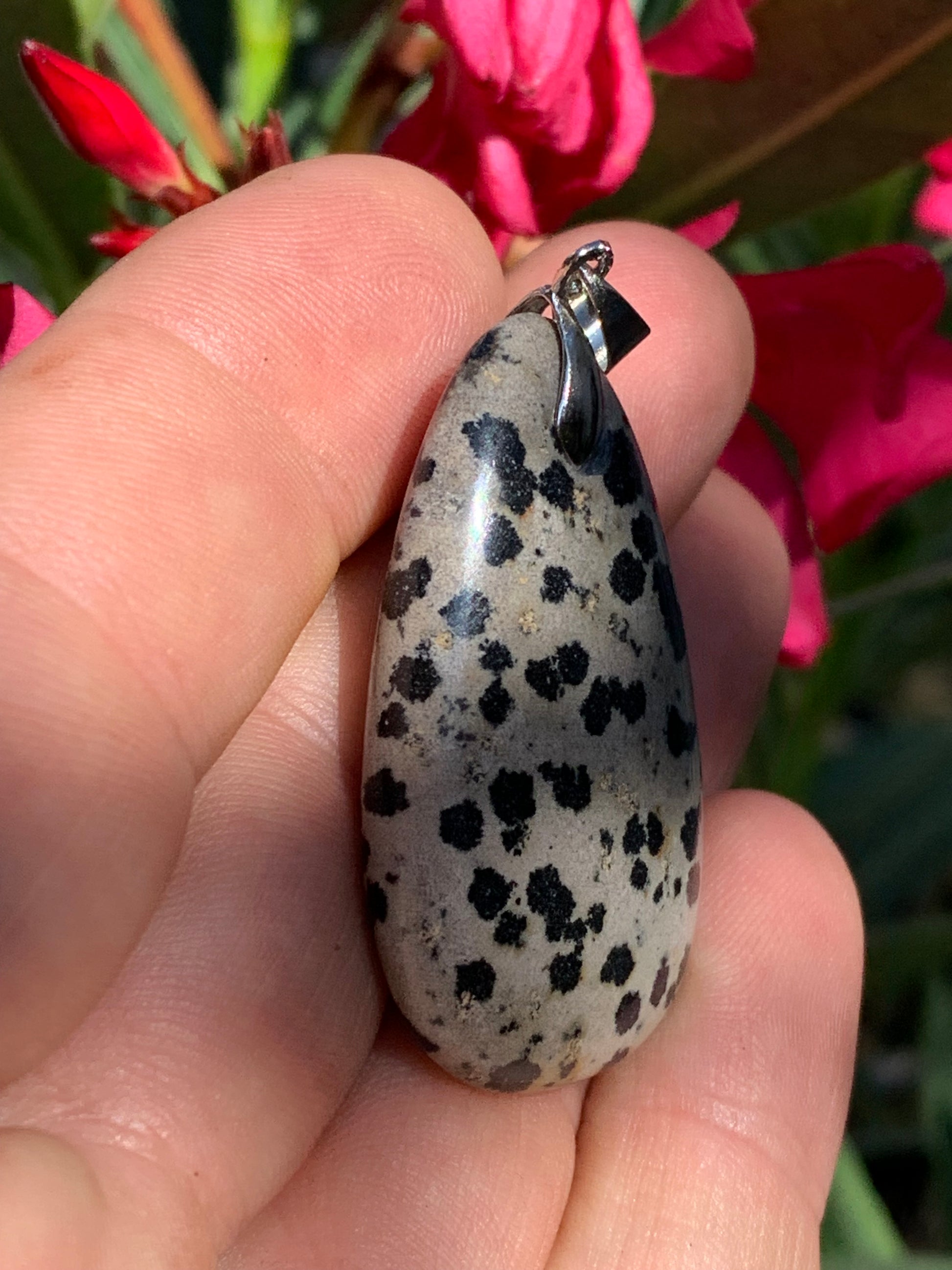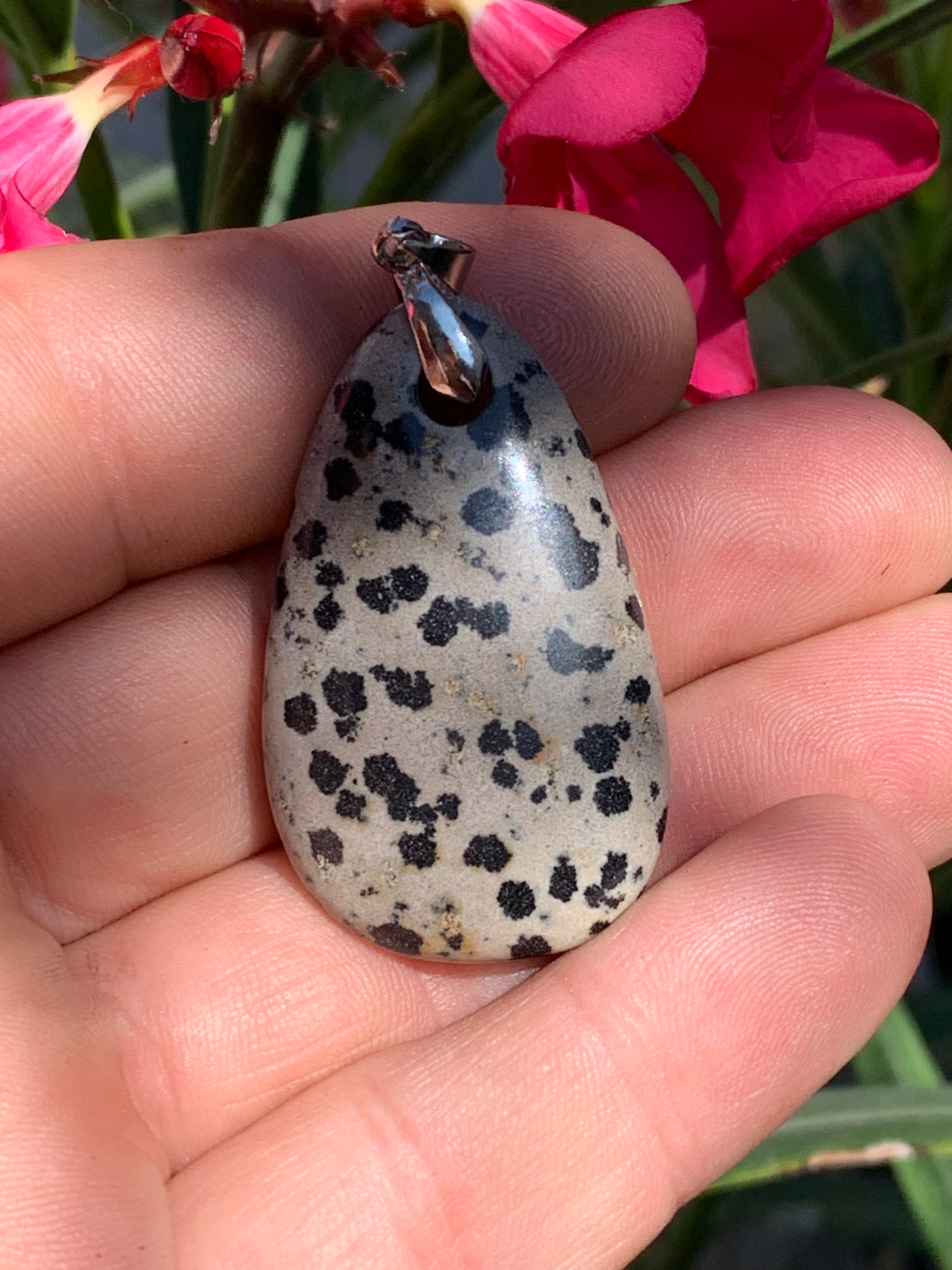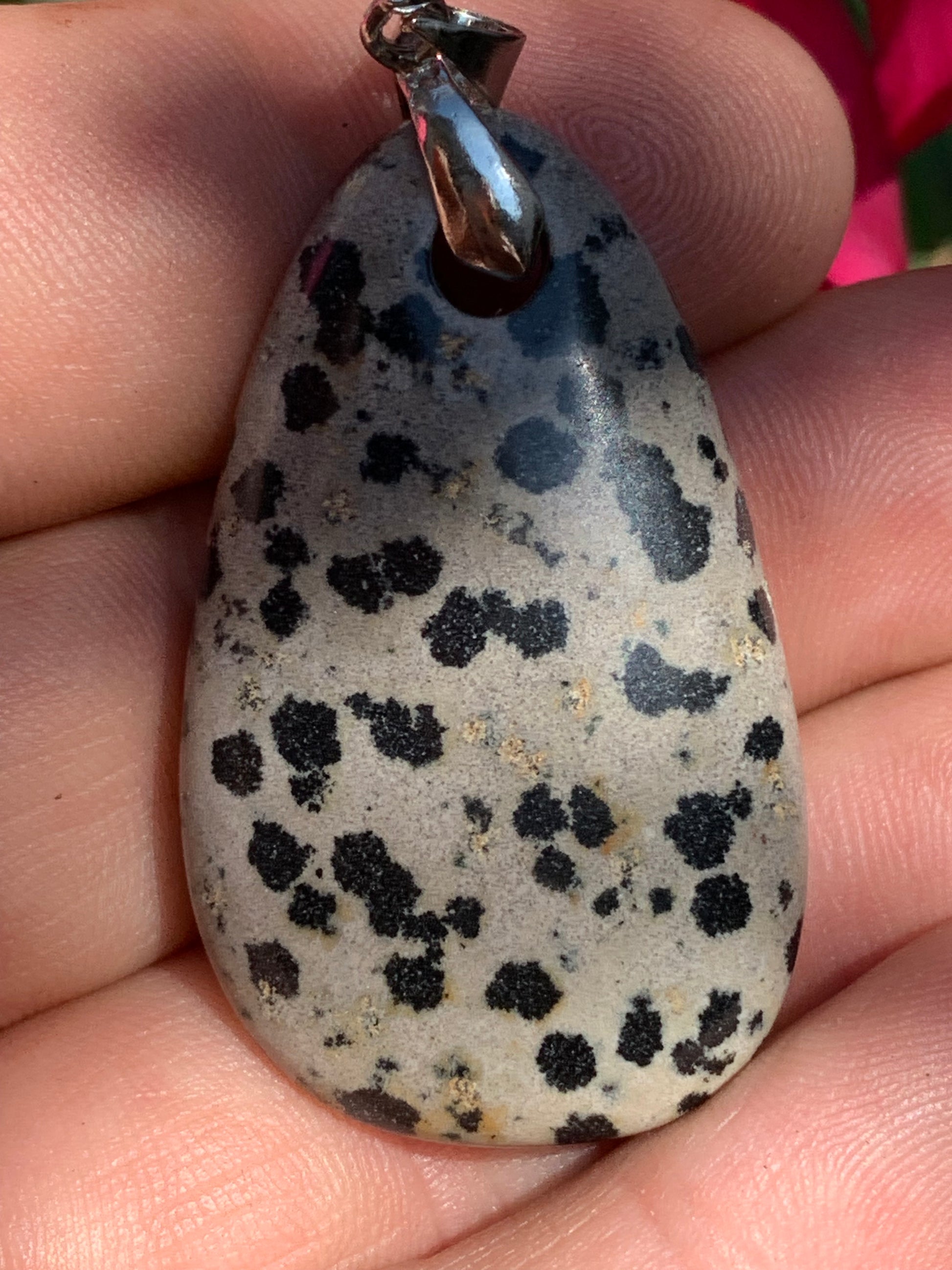 Jaspe Dalmatien, pendentif de 54mm de ht x26 x10. Vendu avec un cordon réglable de couleur noire !