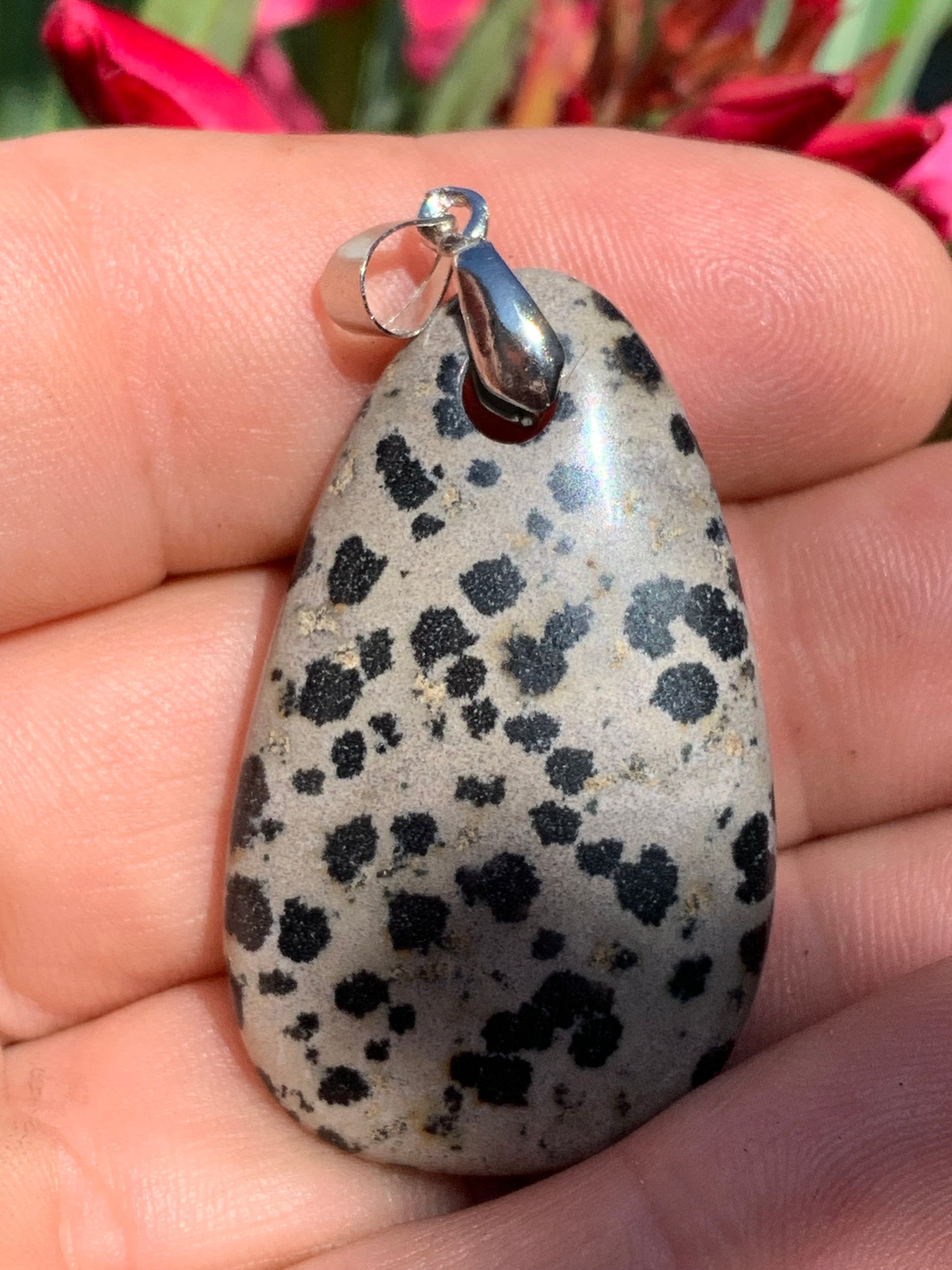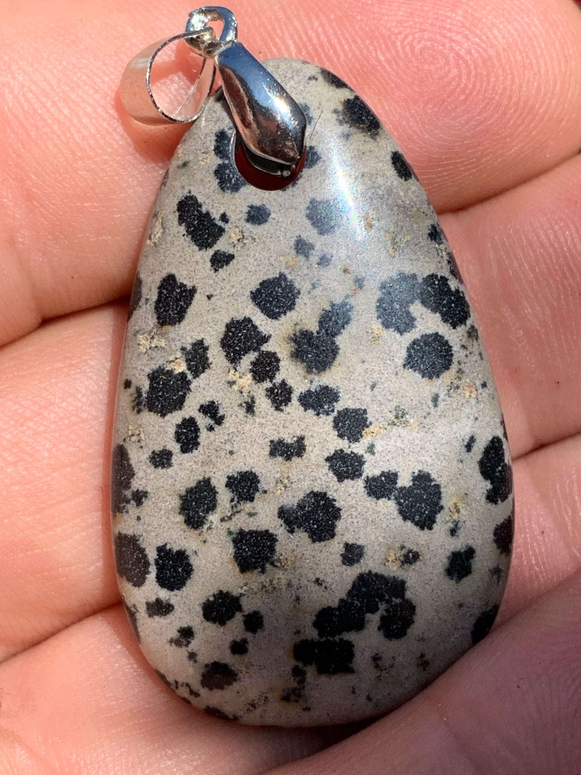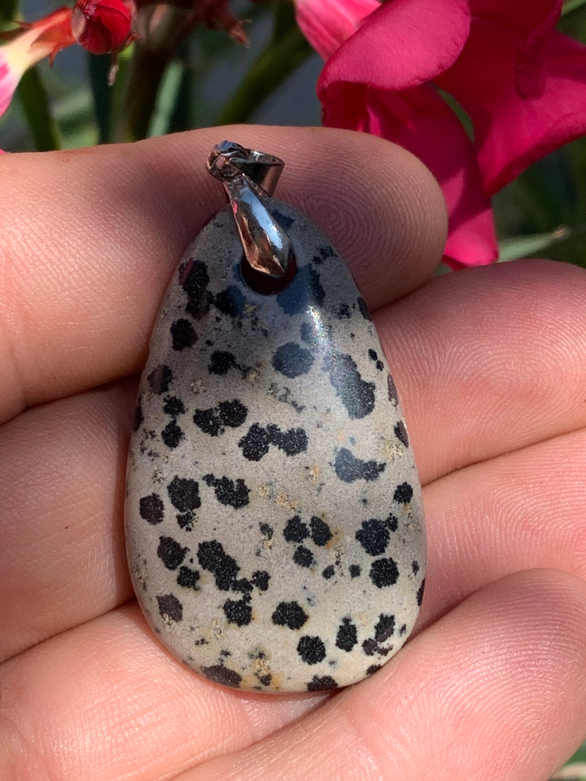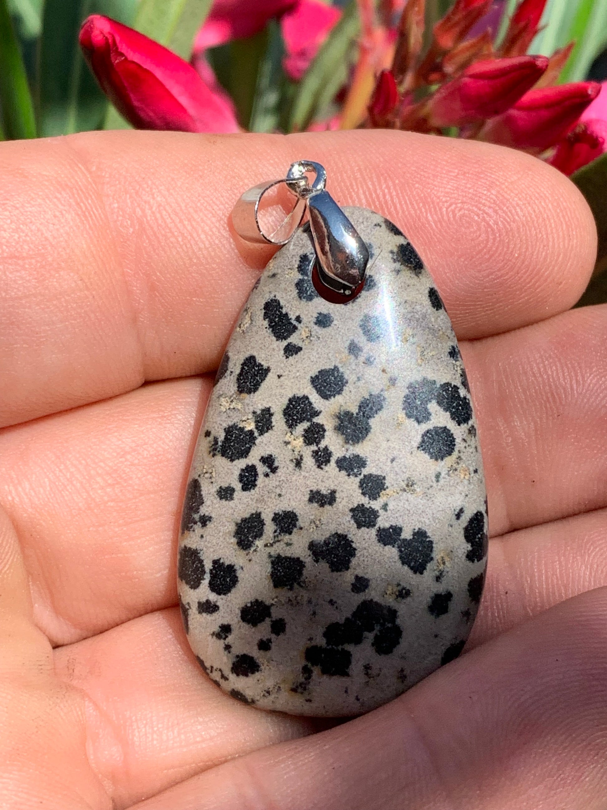Jaspe Dalmatien, pendentif de 54mm de ht x26 x10. Vendu avec un cordon réglable de couleur noire !